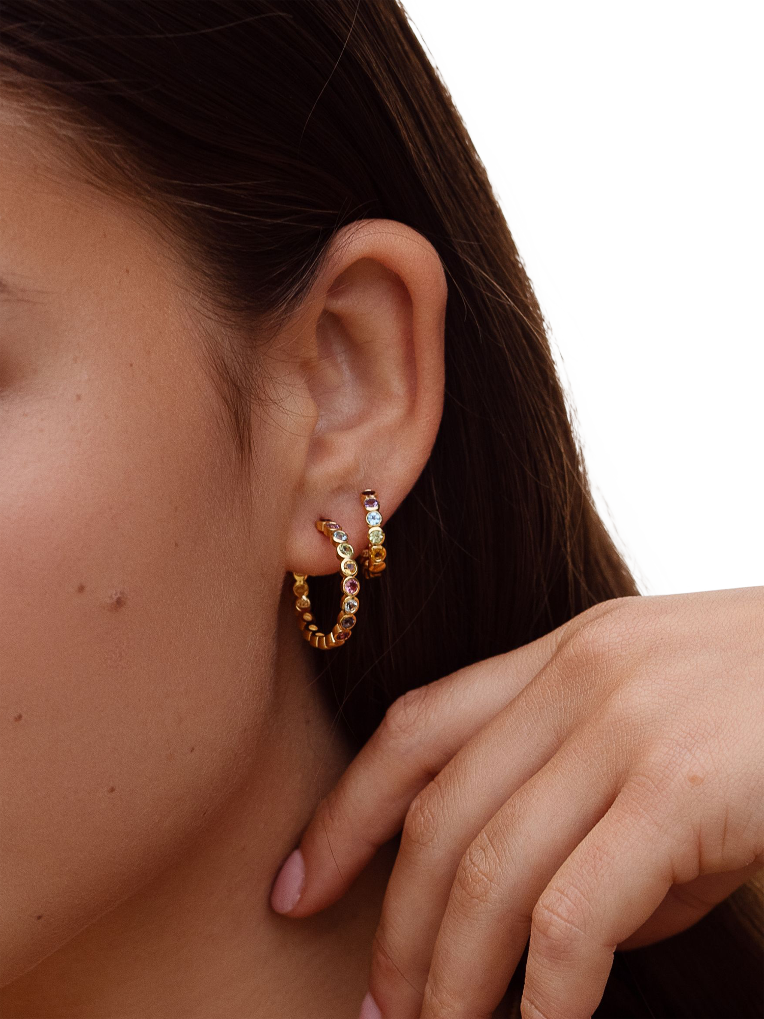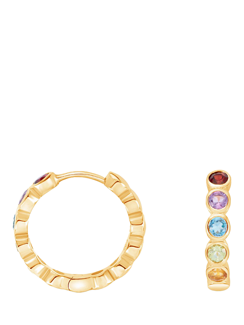 Beautifully handcrafted in Dower & Hall's London studio, this sterling silver hinged huggie hoop design is set with a rainbow of 5 gemstones including amethyst, blue topaz, garnet, citrine and white topaz.