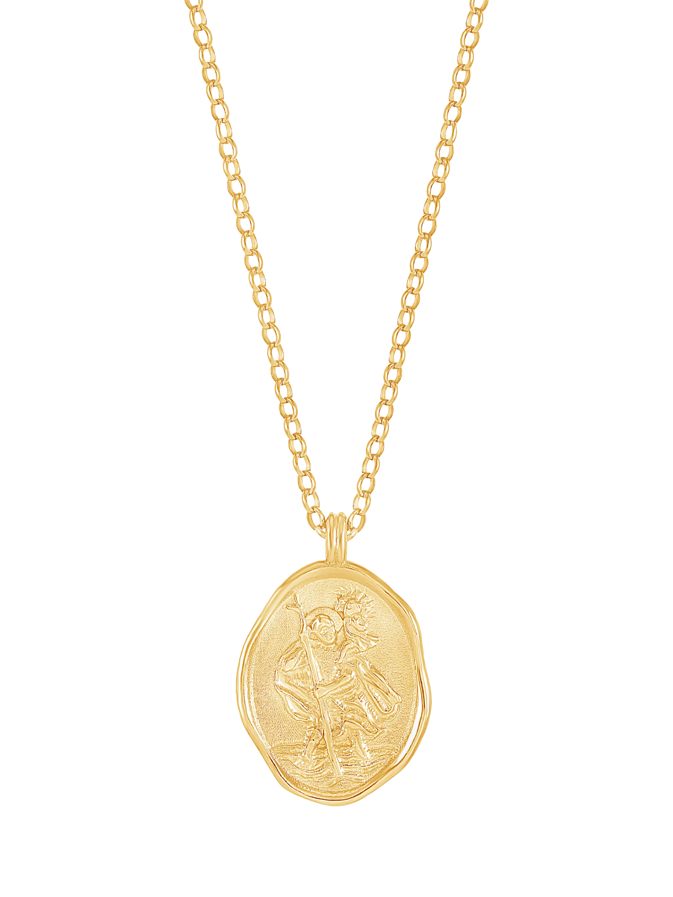 Traditionally given to a loved one who will be travelling, a St. Christopher is seen as a protector to keep them safe on their journey. This necklace is a precious version of the popular St. Christopher with a talisman-style ripple rim. It is hung on a belcher chain. Travel the world and navigate life’s journey protected and guided by your own collection of amulets and talismans.