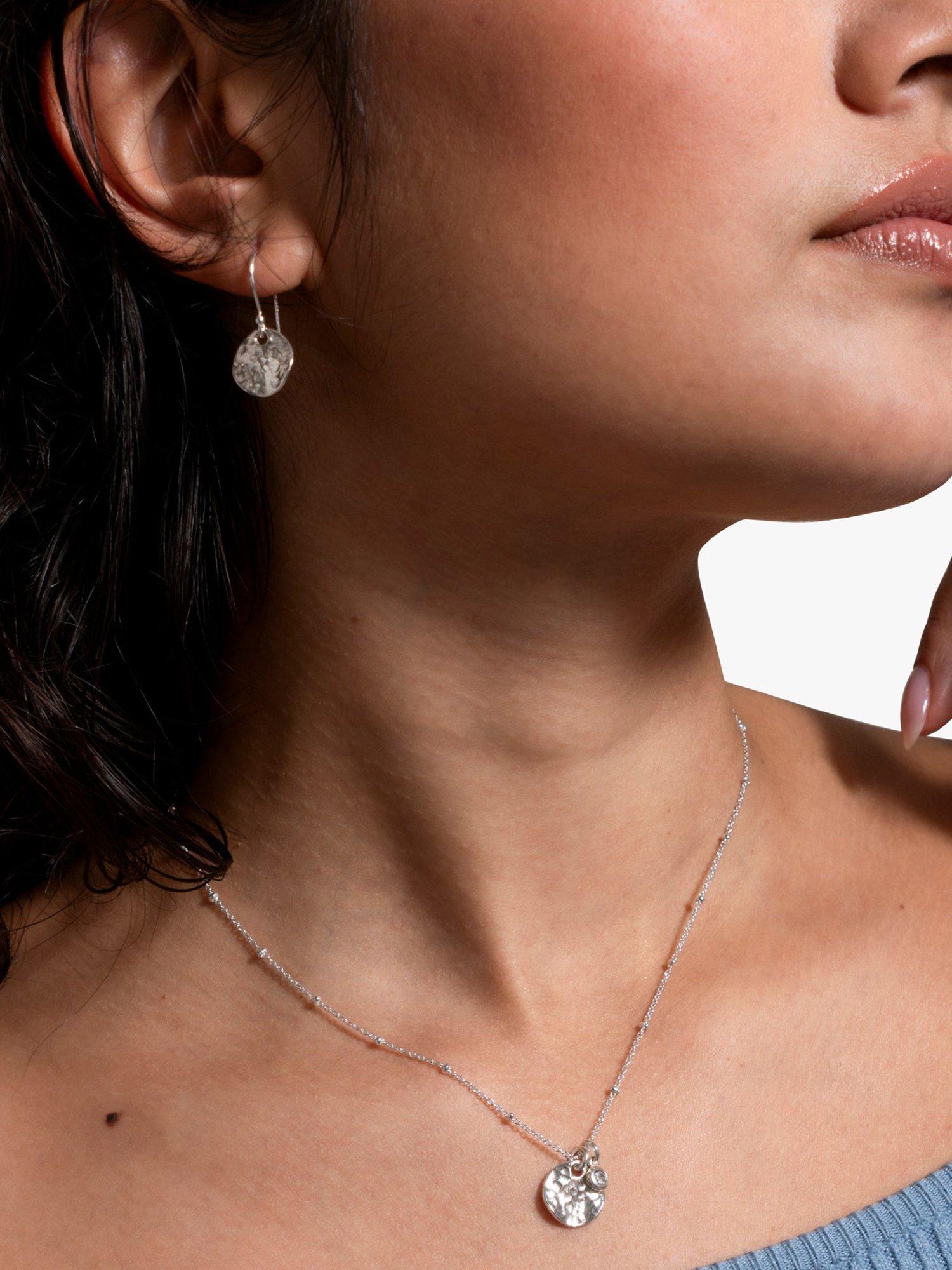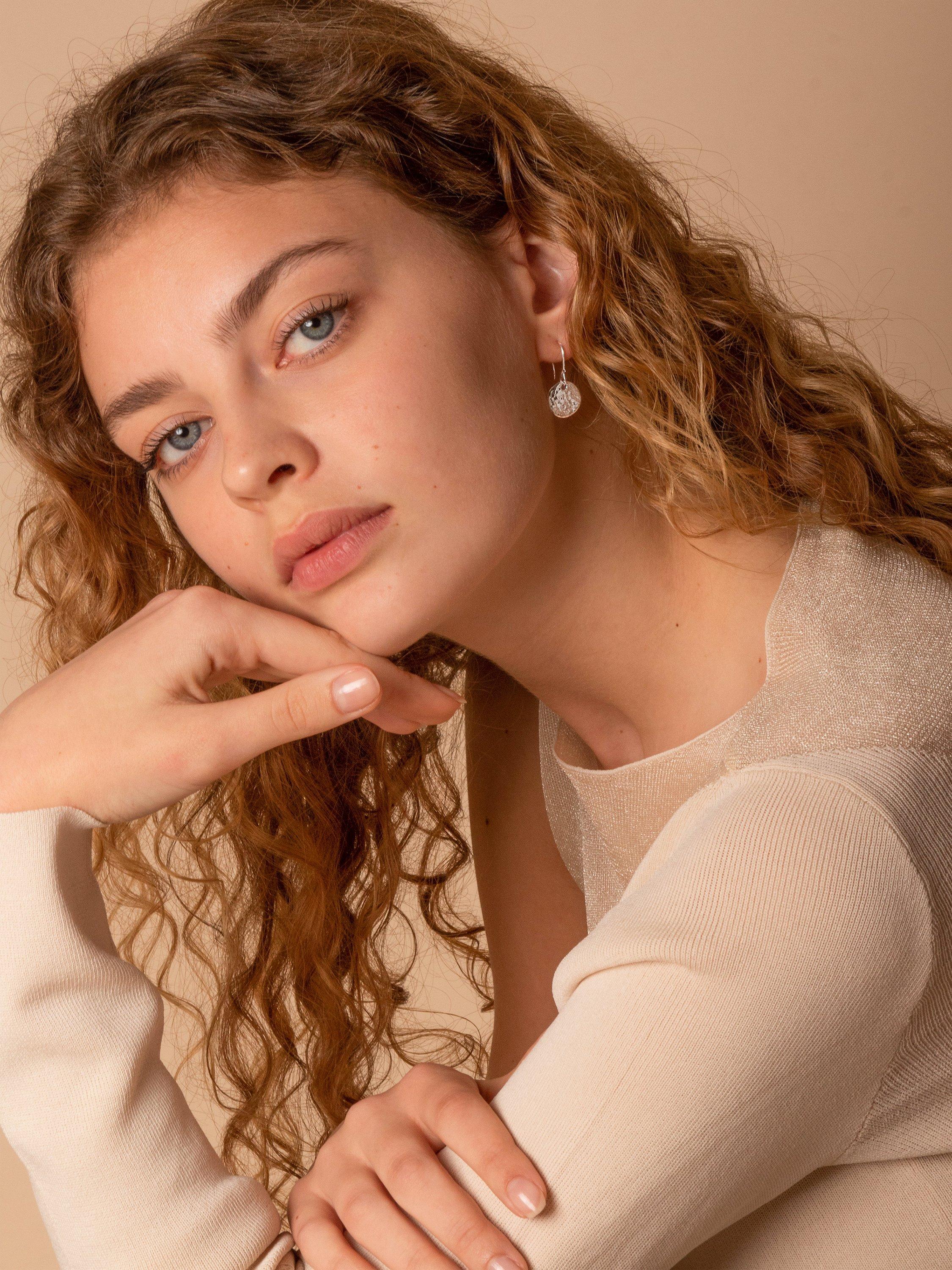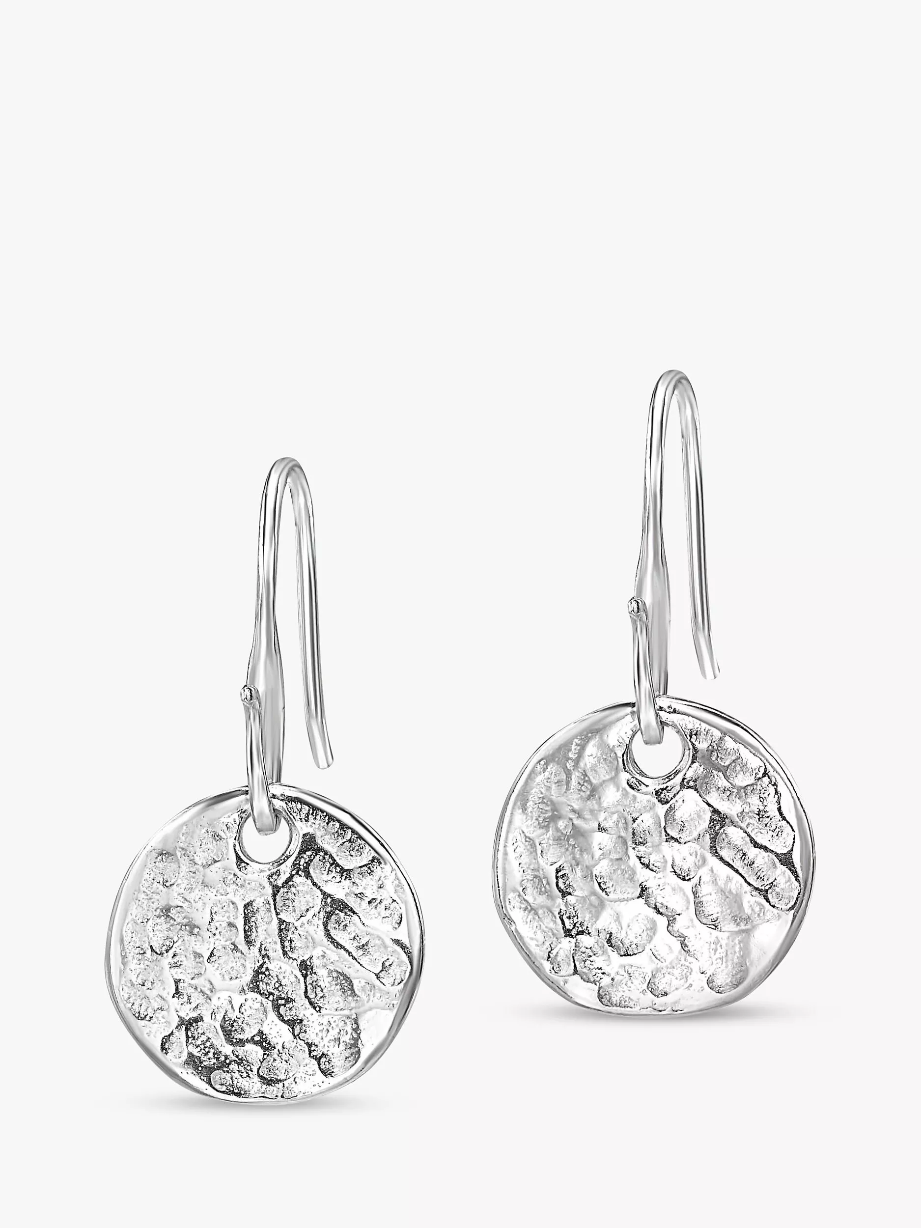 A simplistic pair of earrings from Dower & Hall featuring a hammered sterling silver disk that hangs from a hook fitting with a 2.6cm drop.