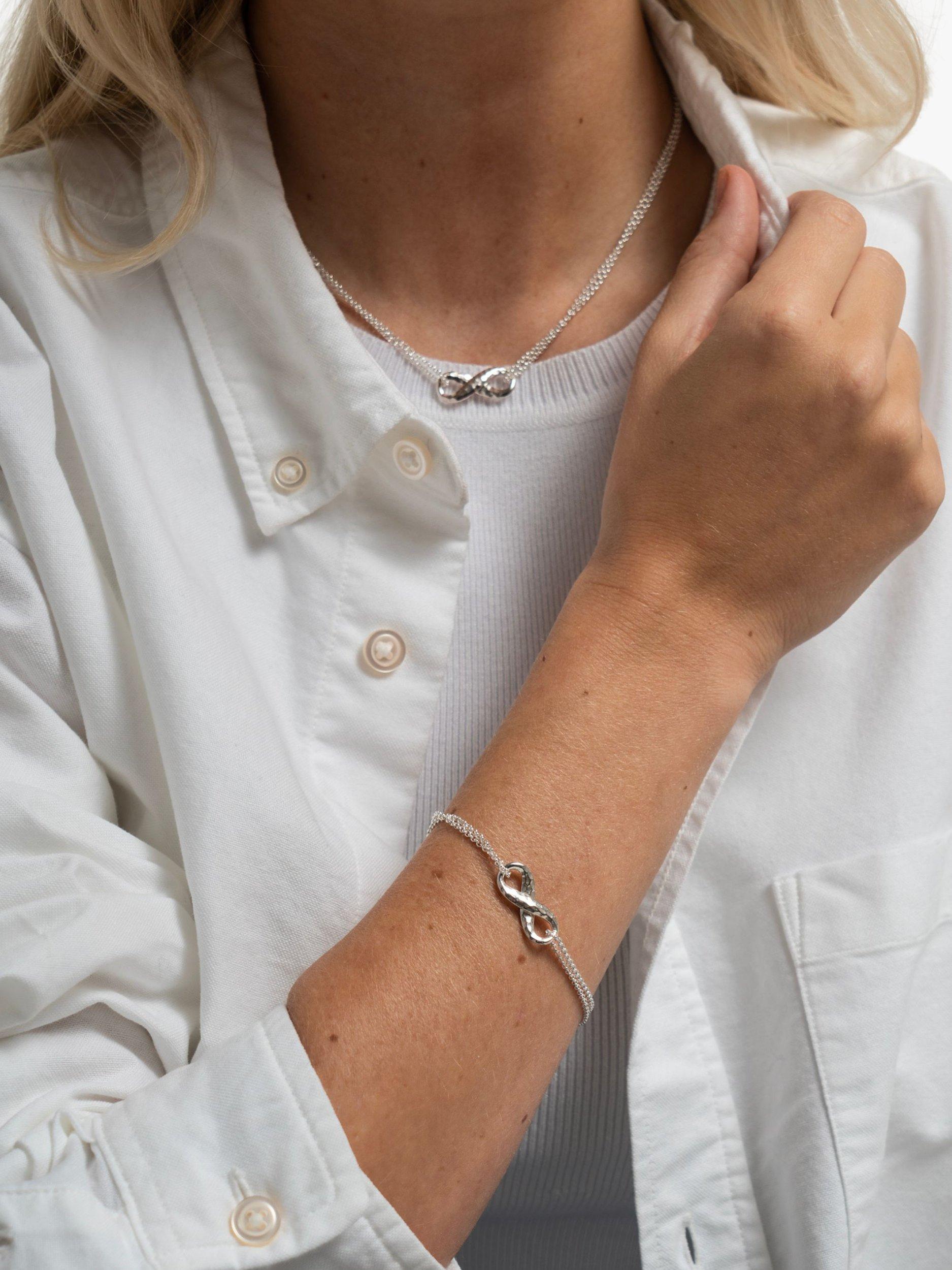 In solid sterling silver, the design symbolises eternal love and presents a chic round belcher chain and a contrasting in texture infinity charm with a hammered finish. The finishing touch is a branded quatrefoil logo clasp.