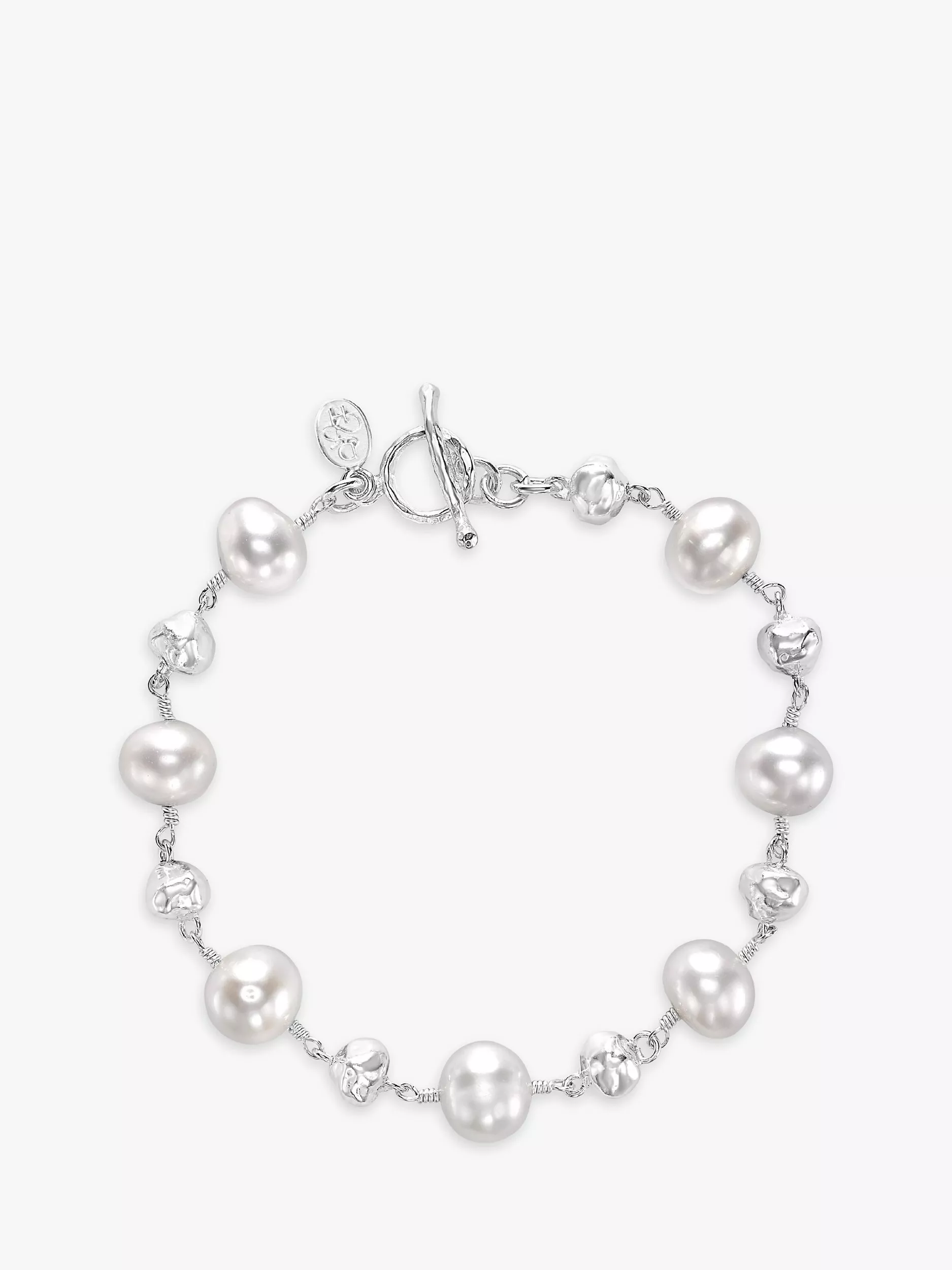 This elegant pearl and nugget bracelet by Dower & Hall features 7 freshwater pearls inter-spaced with 7 sterling silver nuggets. The 5mm nuggets have a soft beaten finish, giving the bracelet an organic yet contemporary feel. The bracelet is finished with the designer's signature beaten loop and t-bar catch. Due to the nature of pearls, size, shape and colours may vary.