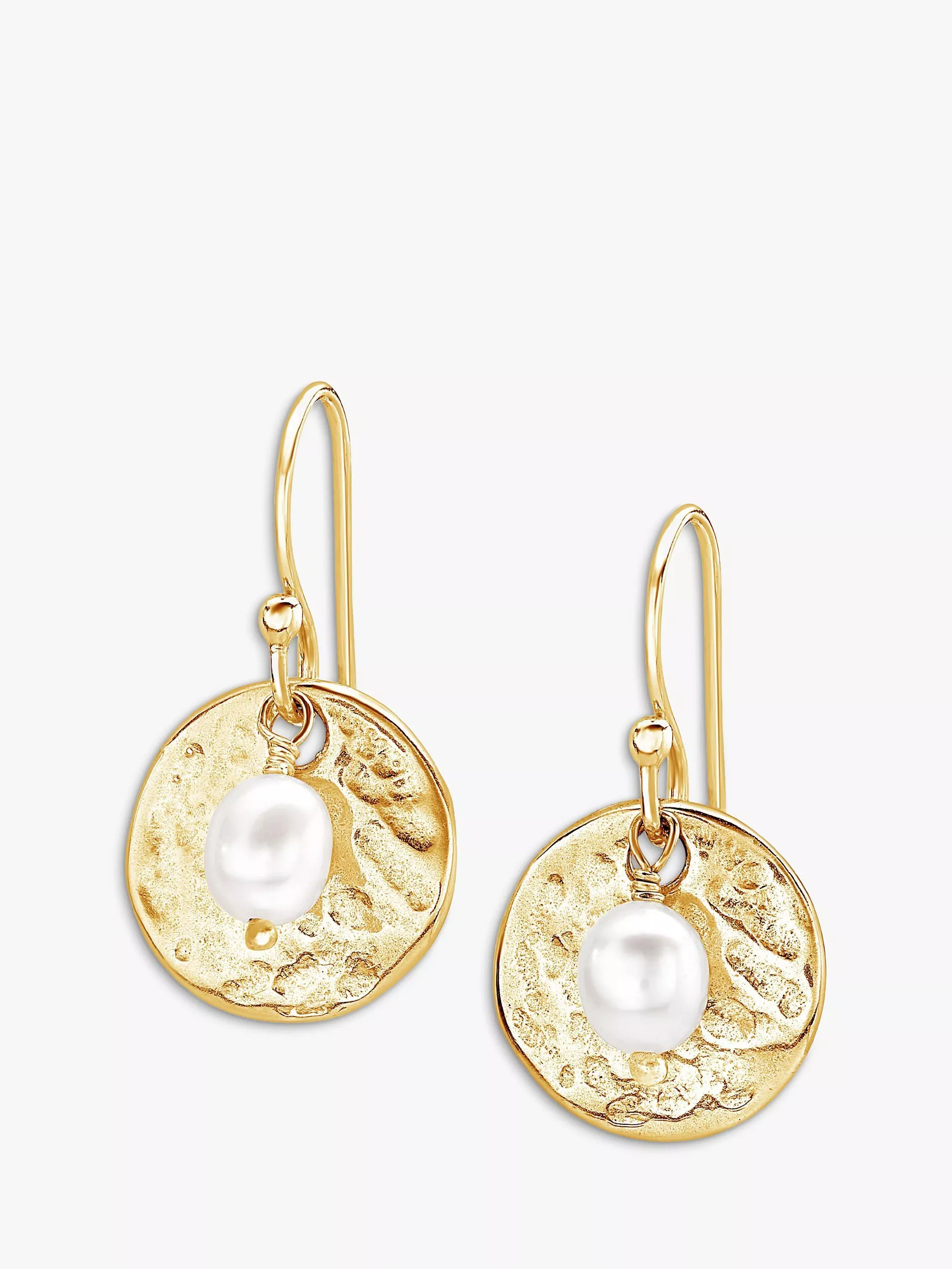 Crafted from solid sterling silver and finished with optional 18ct gold plating, the pair features a hand-beaten disc with a dainty iridescent pearl layered perfectly on top. The earrings have easy-to-wear hook fittings that are for pierced ears only.