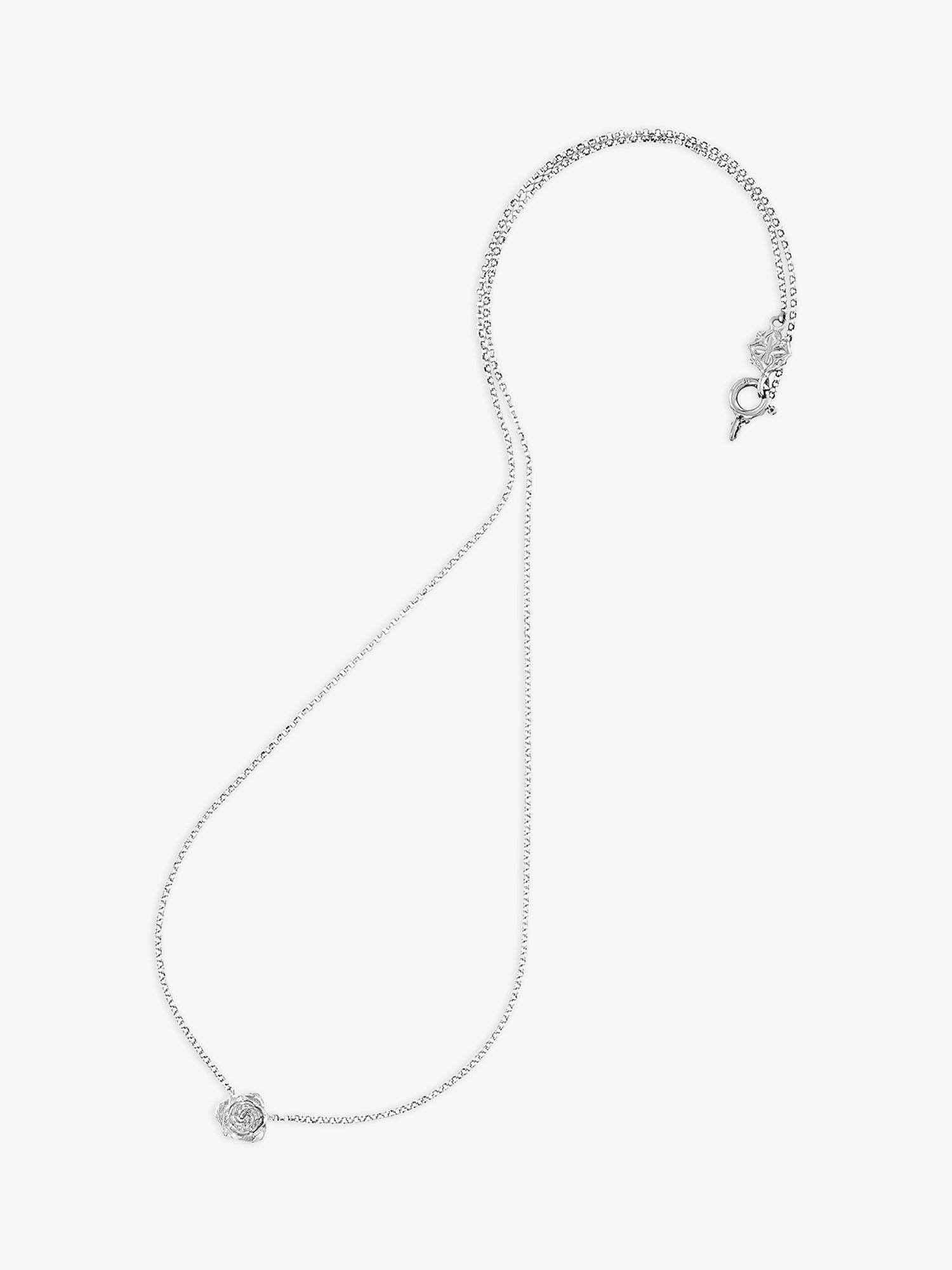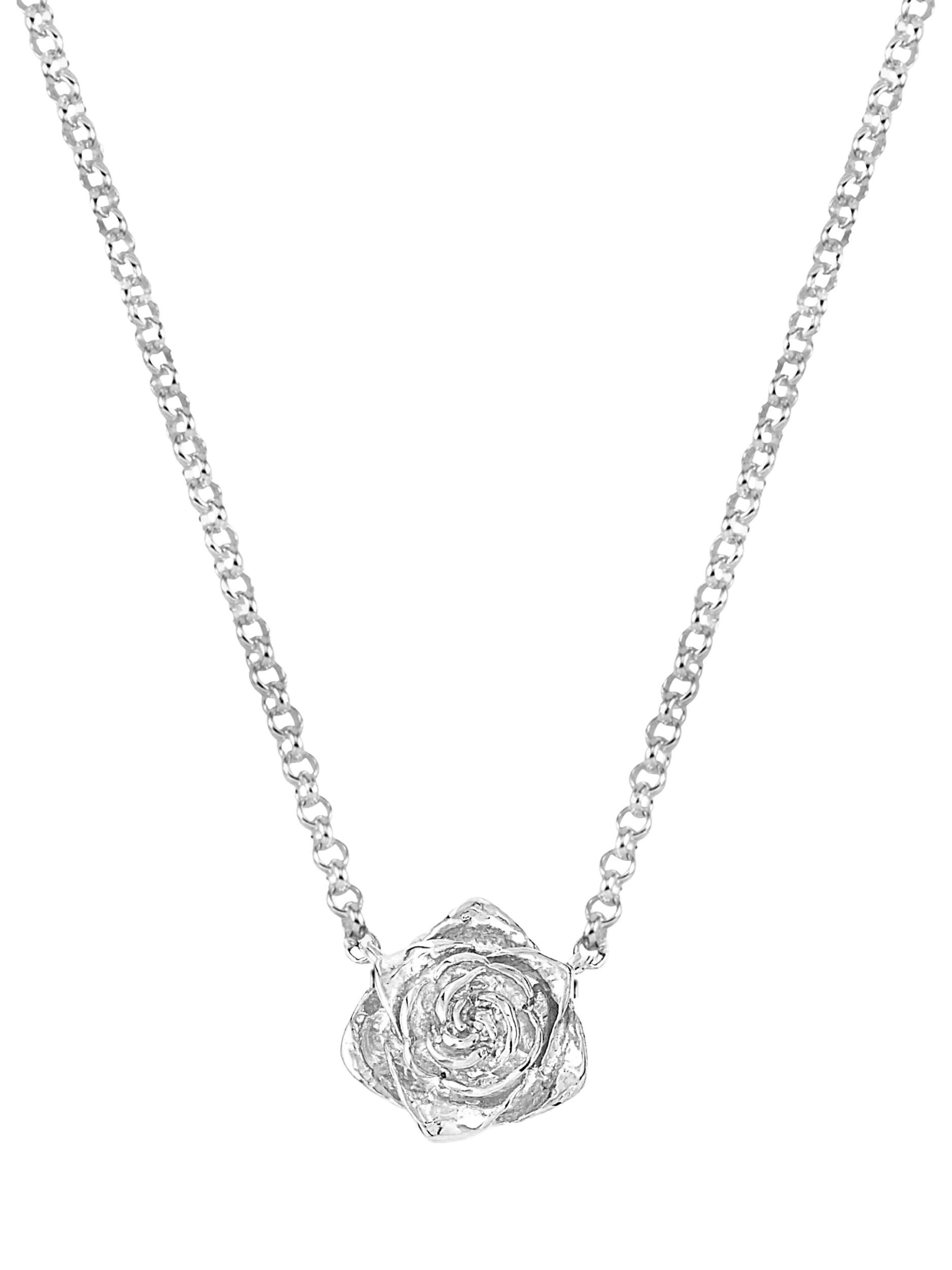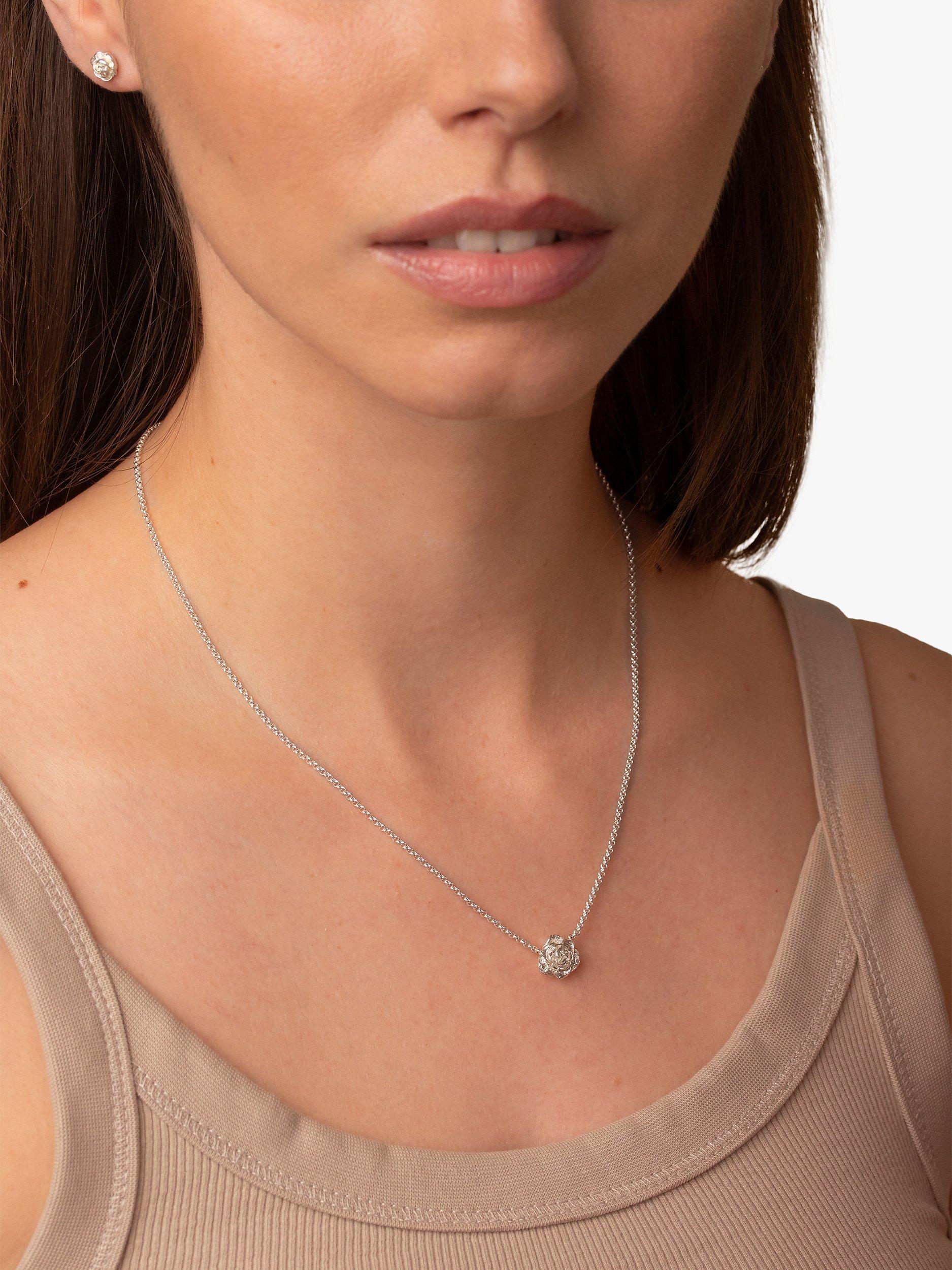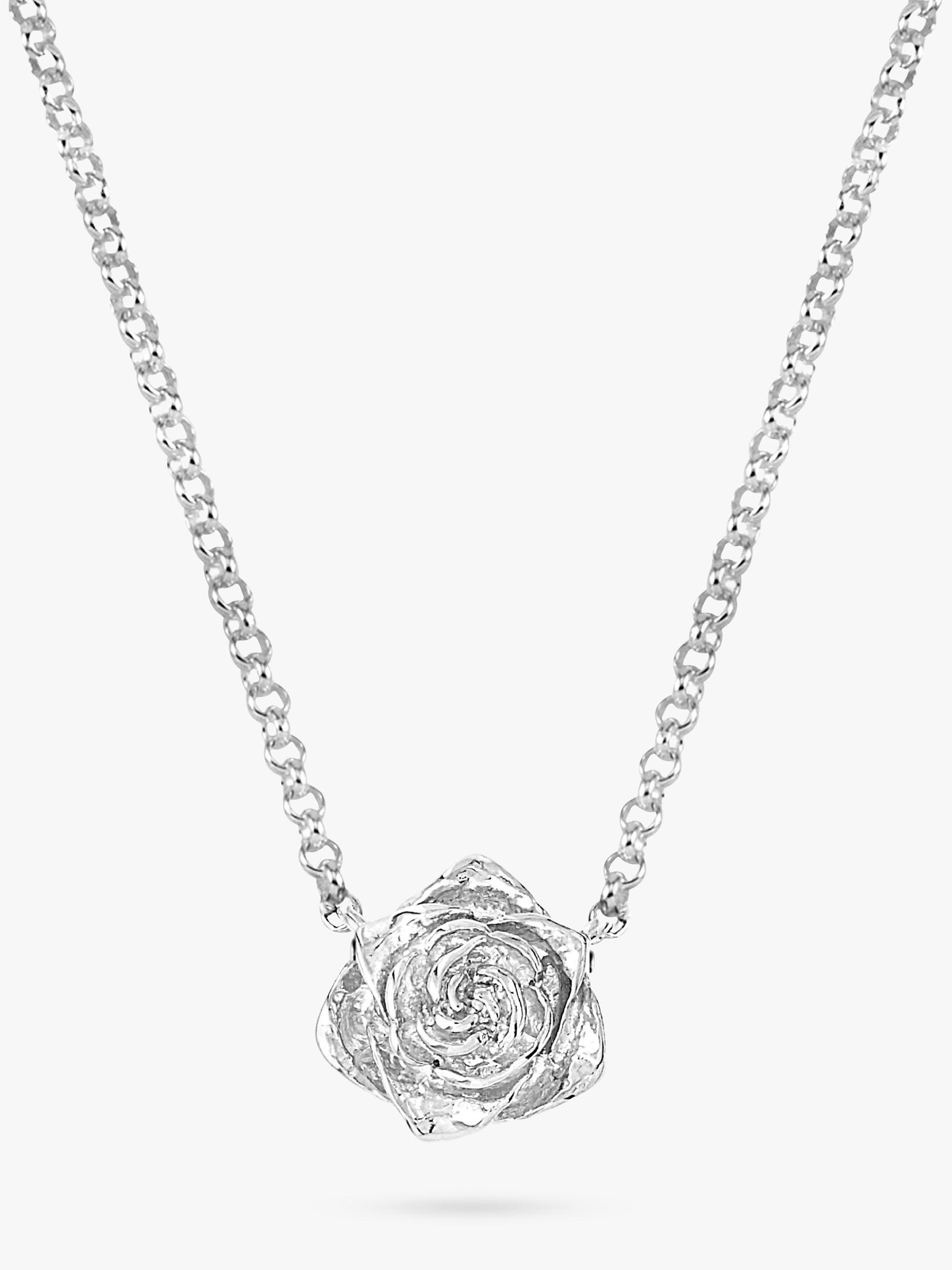 Inspired by English gardens, this sterling silver pendant necklace from Dower & Hall features a delicately carved Wild Rose in full bloom. It is suspended on a fine belcher chain with a hinged clasp for a secure hold.