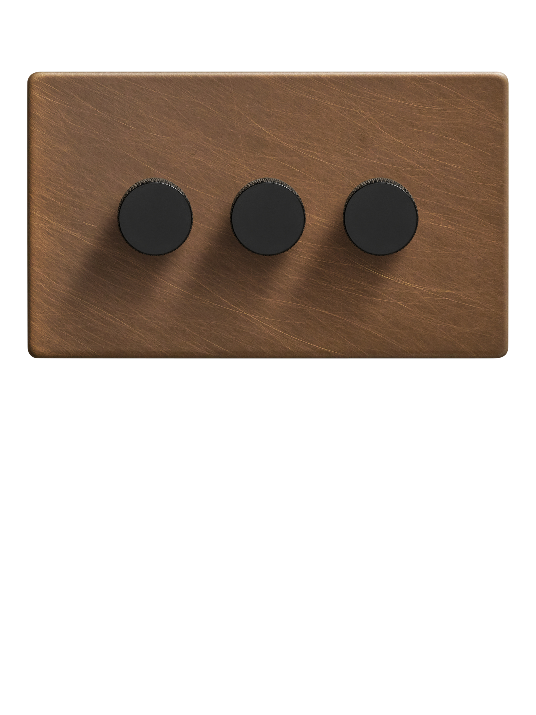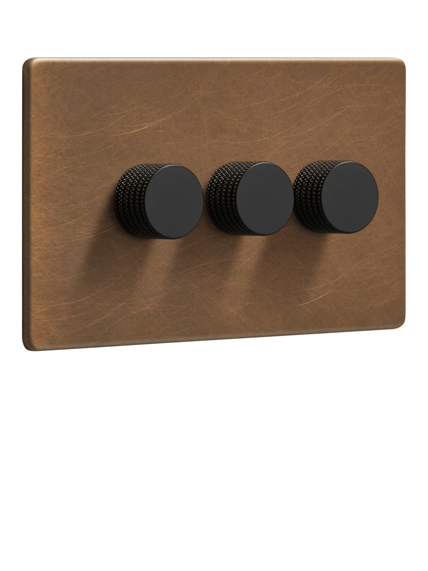 This antique brass triple dimmer switch by Dowsing & Reynolds gives you complete control over multiple lighting zones - perfect for living areas where you want to adjust the brightness at different times of day. The hand-finished metal backplate complements layered interiors beautifully, with three knurled dimmer dials in a choice of black or gold to put your own twist on this classic, timeless piece.