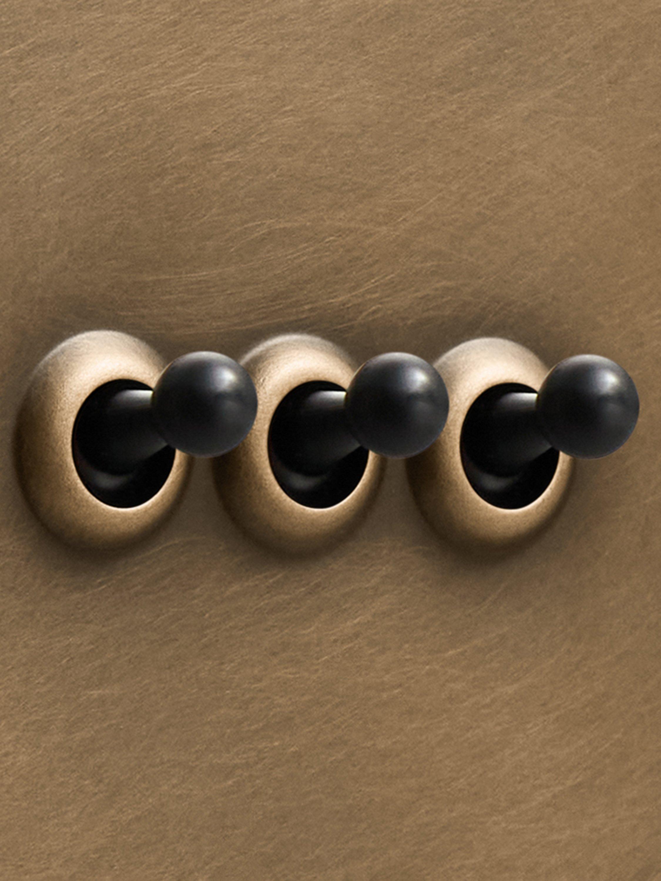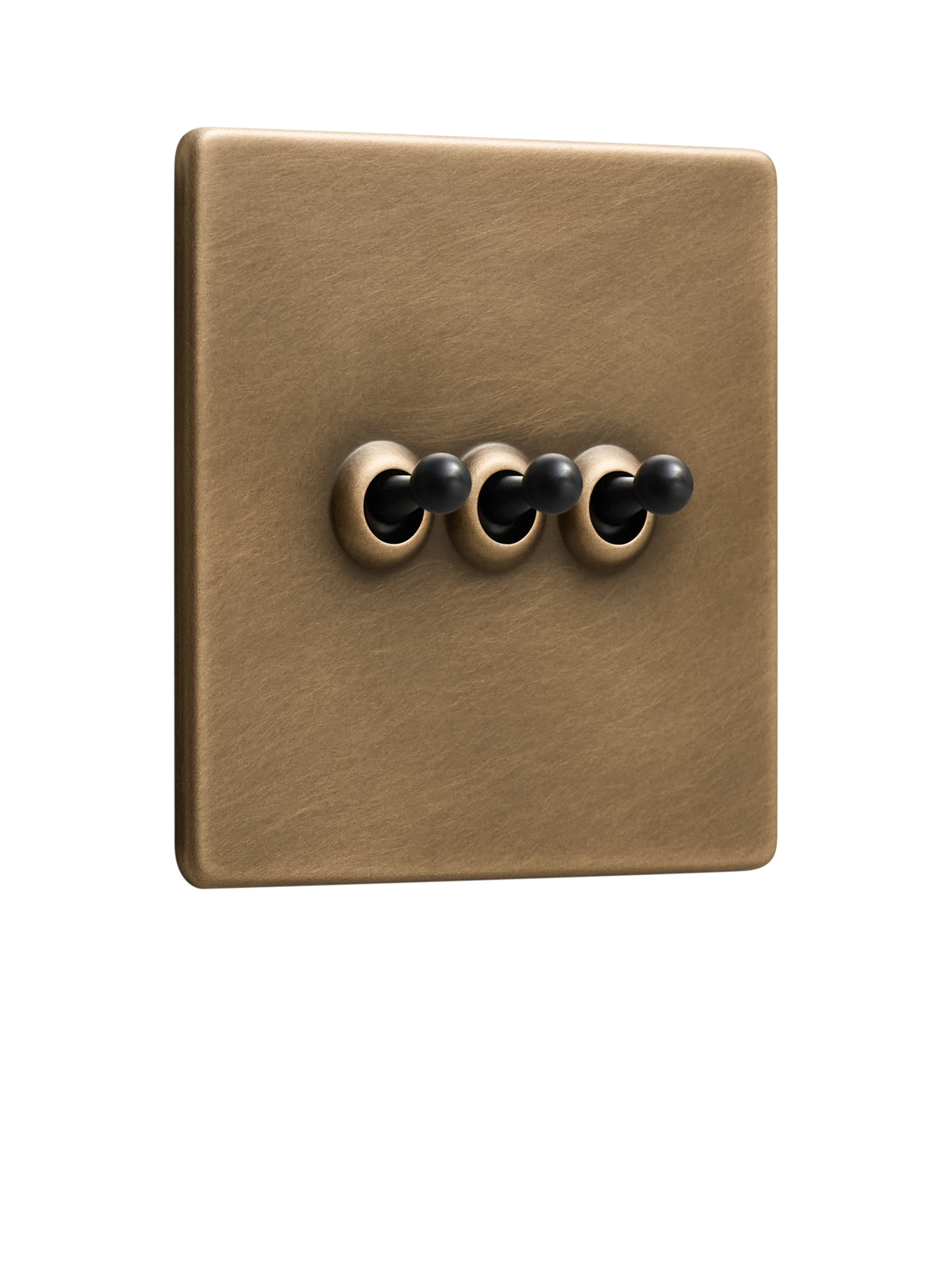 The antique brass triple toggle switch by Dowsing & Reynolds offers style and practicality in equal measure. Each toggle controls a separate circuit, ideal for flexible lighting setups, while the traditional ‘dolly’ switch lends itself to heritage décor schemes.