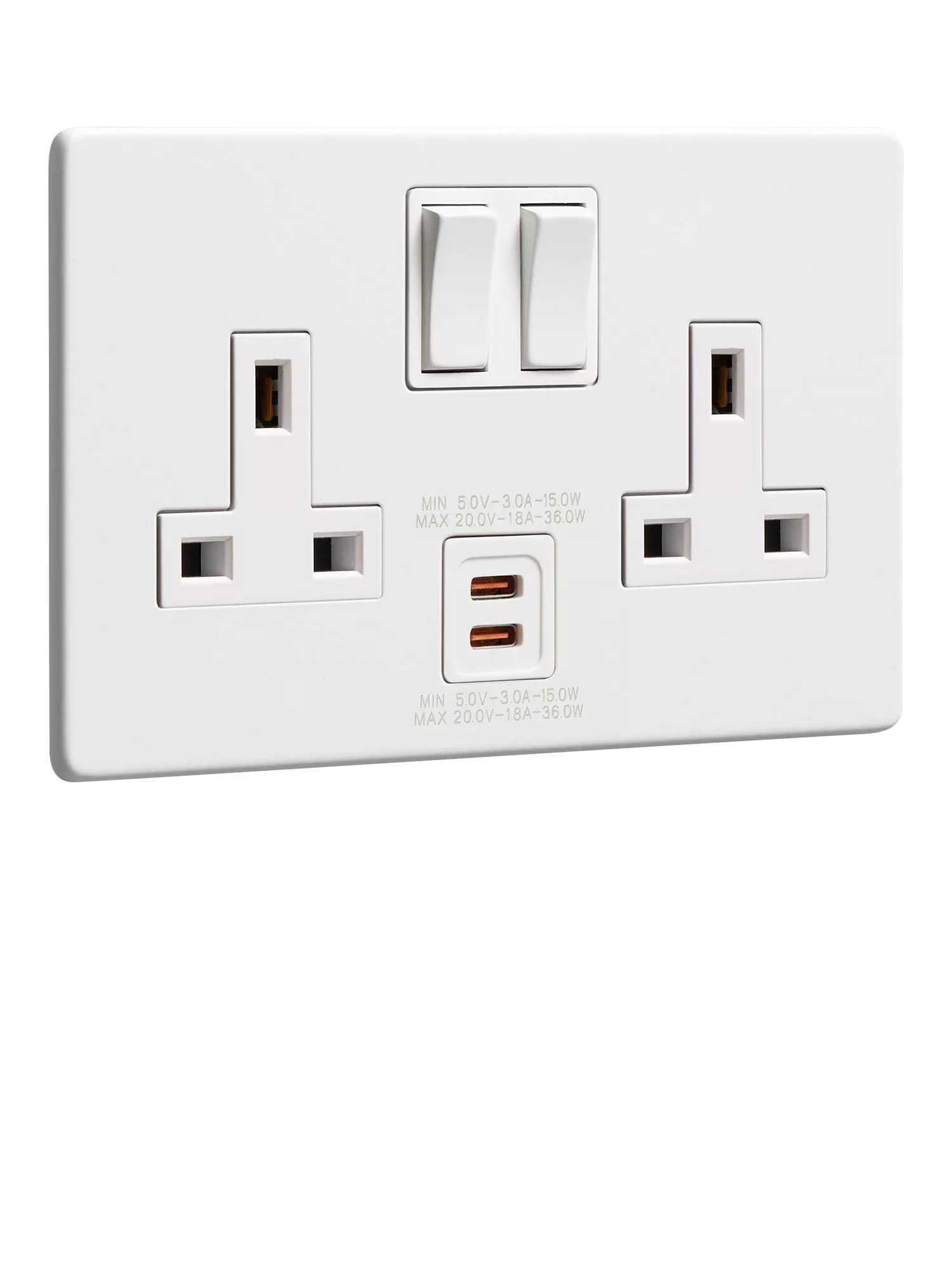 A modern solution in a subtle, off-white finish, this double USB-C socket by Dowsing & Reynolds lets you charge devices directly, with no adaptor required. The finish offers a slightly warmer alternative to bright, brilliant white, helping to soften the tone in design-conscious spaces. Perfect for bedside charging, kitchen counters or work-from-home desks where utility meets understated style.
