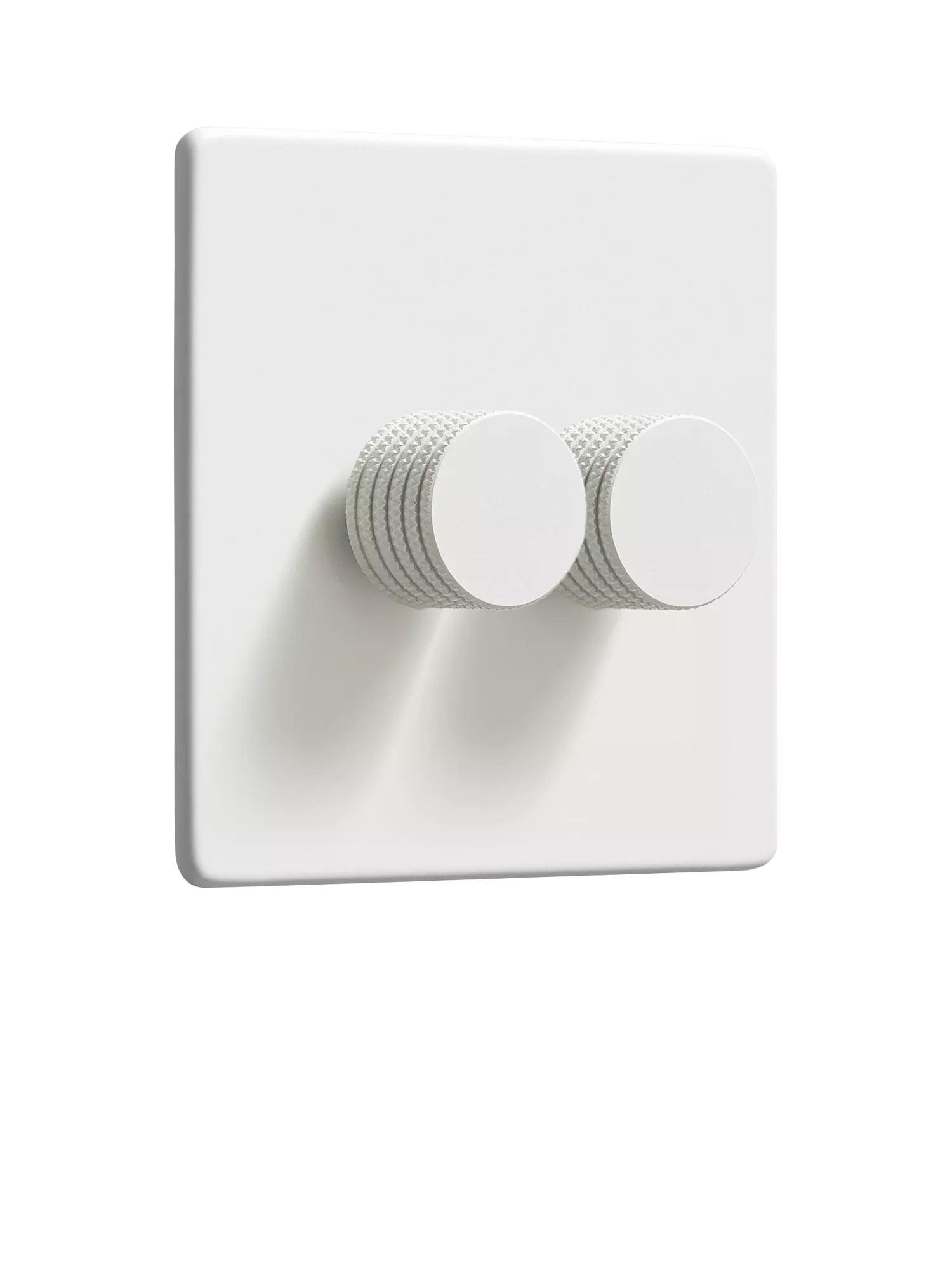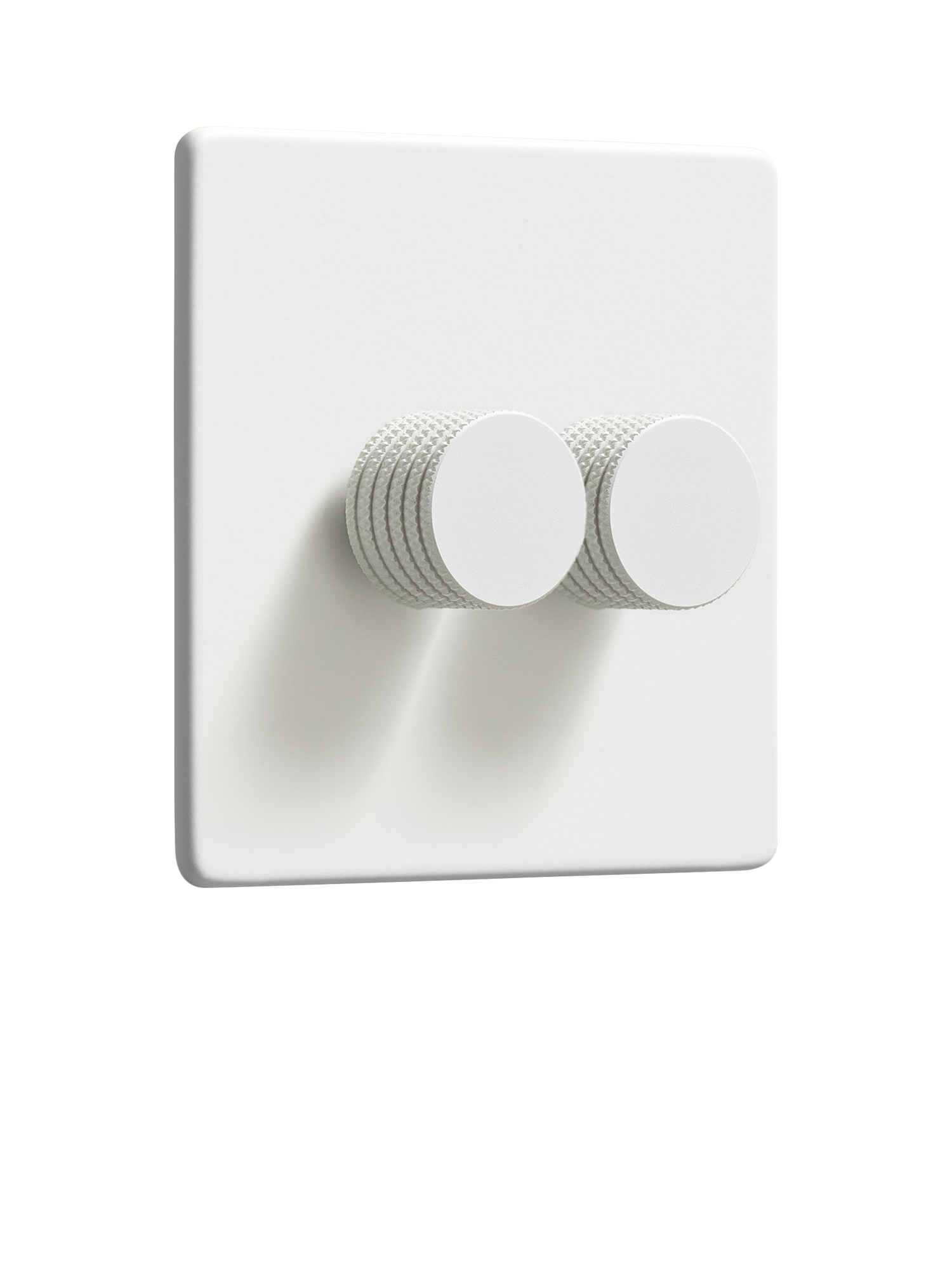 Perfect for managing two lighting circuits, this double dimmer switch by Dowsing & Reynolds comes in a soft off-white tone that enhances your room without overwhelming it. Its quiet, flush-fitting design adds balance and calm to walls, especially in neutral or tonal colour palettes. Great for dining areas, open-plan kitchens or multifunctional living rooms with a choice of white or gold knurled dimmer dials to tailor to your space.