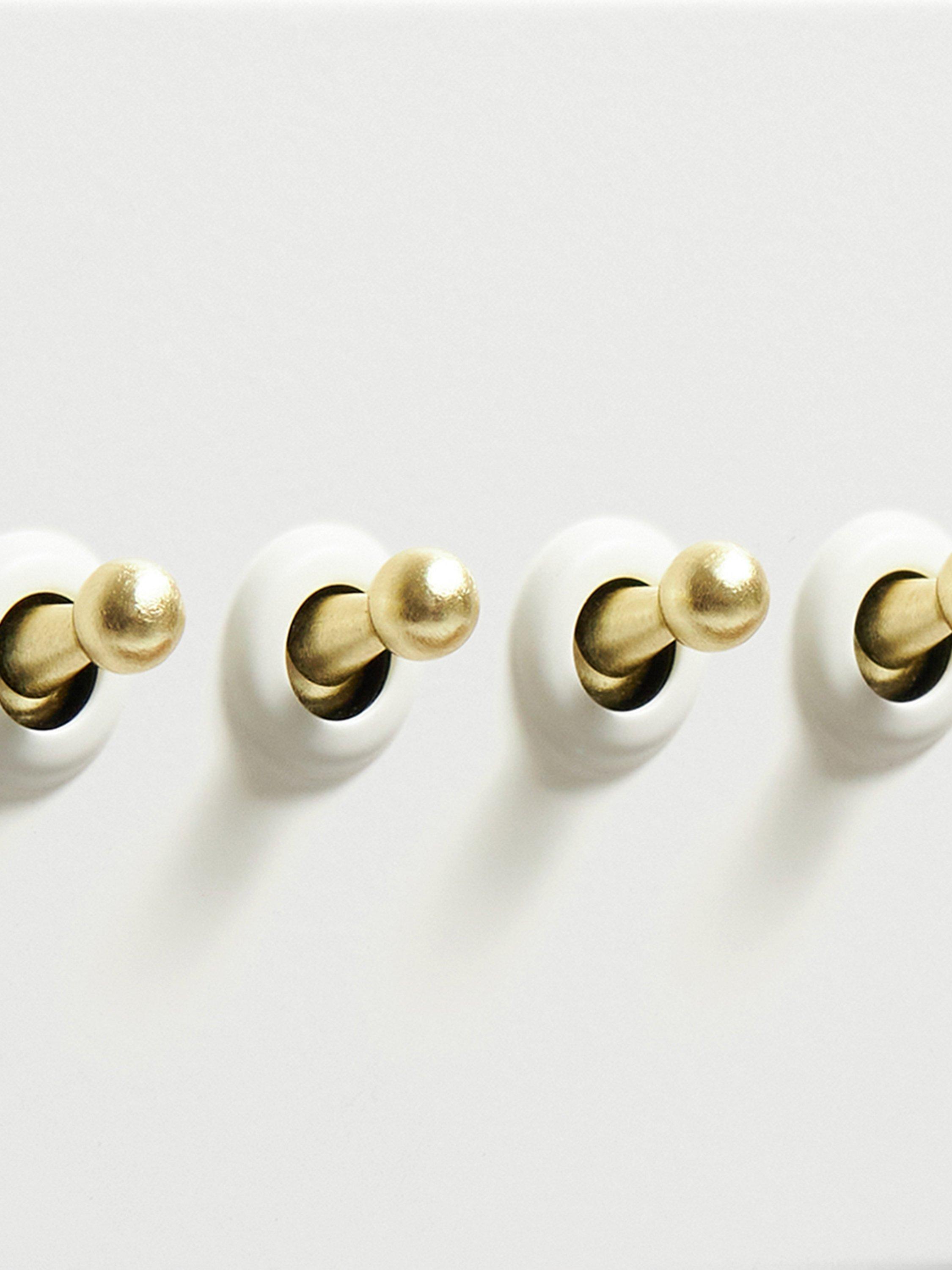 This quadruple toggle switch by Dowsing & Reynolds is the understated solution for multi-zone lighting. The soft white tone works effortlessly in neutral interiors while the streamlined, screw-less design ensures seamless cohesion throughout your home for calm, clutter-free living. Great for large or open-plan spaces where you need to control multiple lighting circuits. Select white or gold rockers depending on your personal interior style.
