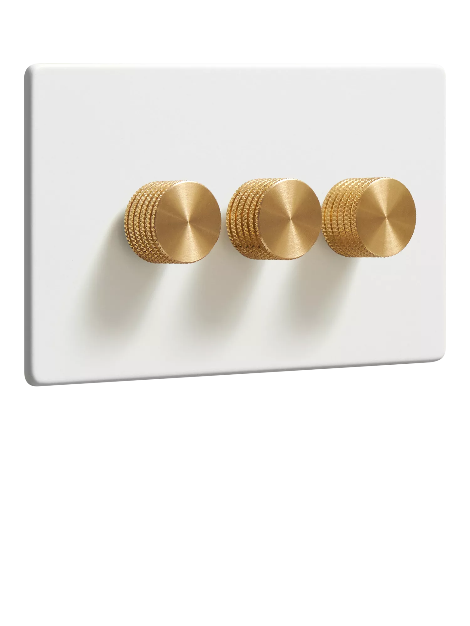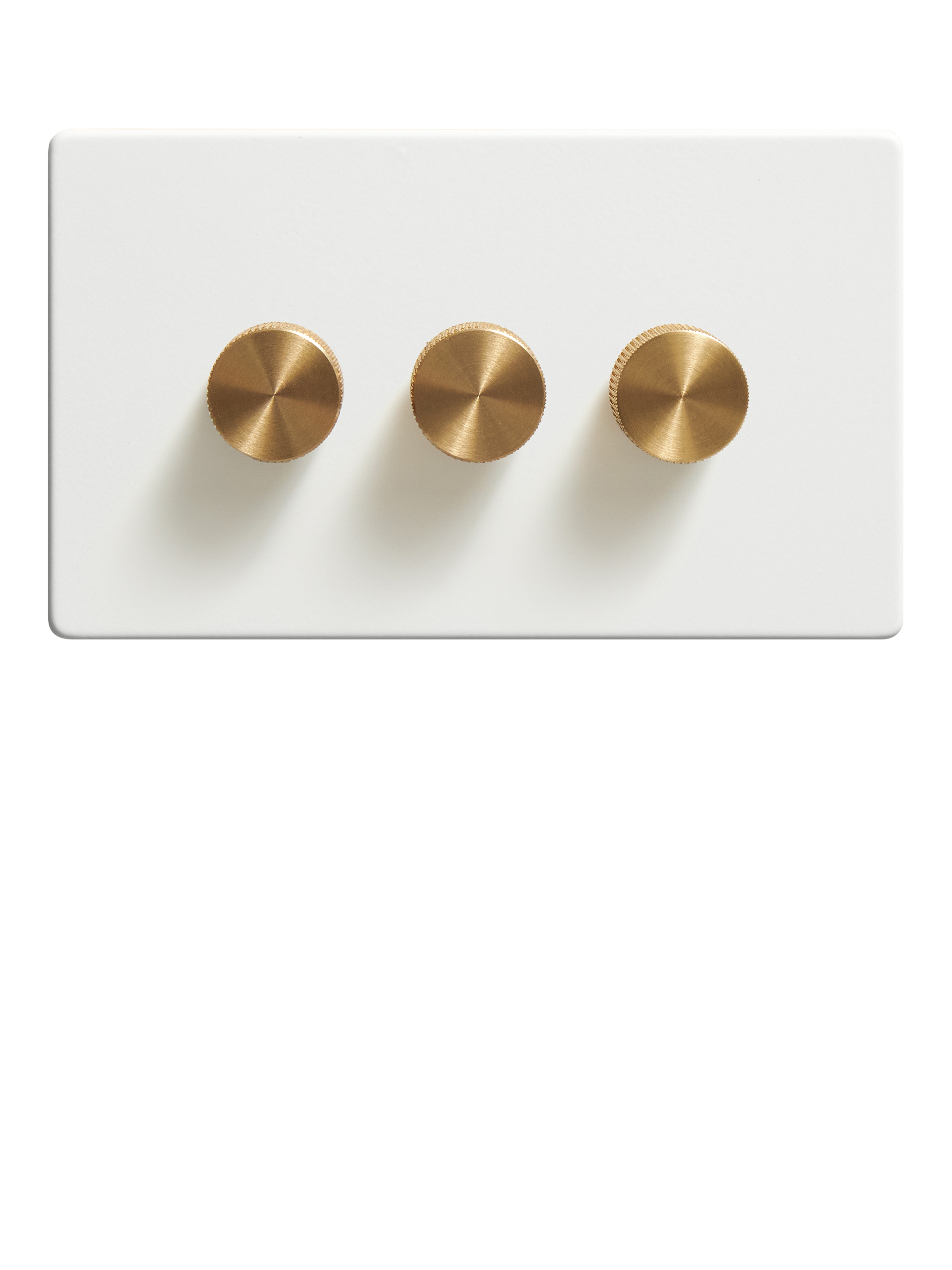 Perfect for managing three lighting circuits, this triple dimmer switch by Dowsing & Reynolds comes in a soft off-white tone that enhances your room without overwhelming it. Its quiet, flush-fitting design adds balance and calm to walls, especially in neutral or tonal colour palettes. Great for dining areas, open-plan kitchens or multifunctional living rooms with a choice of white or gold knurled dimmer dials to tailor to your space.