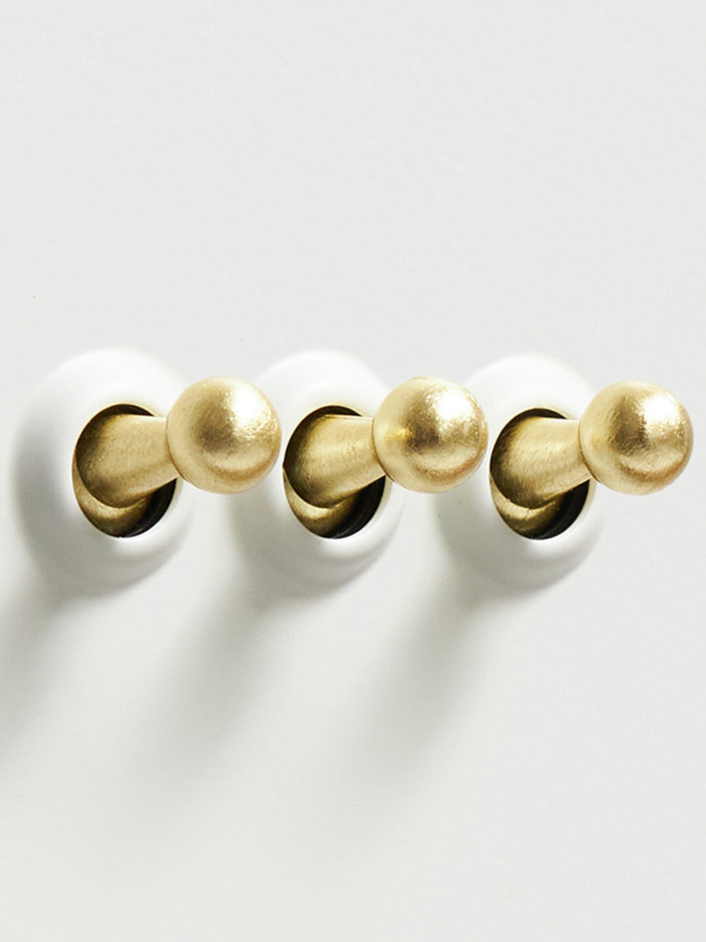 With three independent toggles, this triple toggle switch by Dowsing & Reynolds is a refined way to manage layered lighting. Its clean, streamlined design helps create a calm, uncluttered visual throughout your space, with the choice of white or gold toggles to further customise to your preference. Great for spaces like bedrooms, living rooms and kitchens where soft neutrality is key.