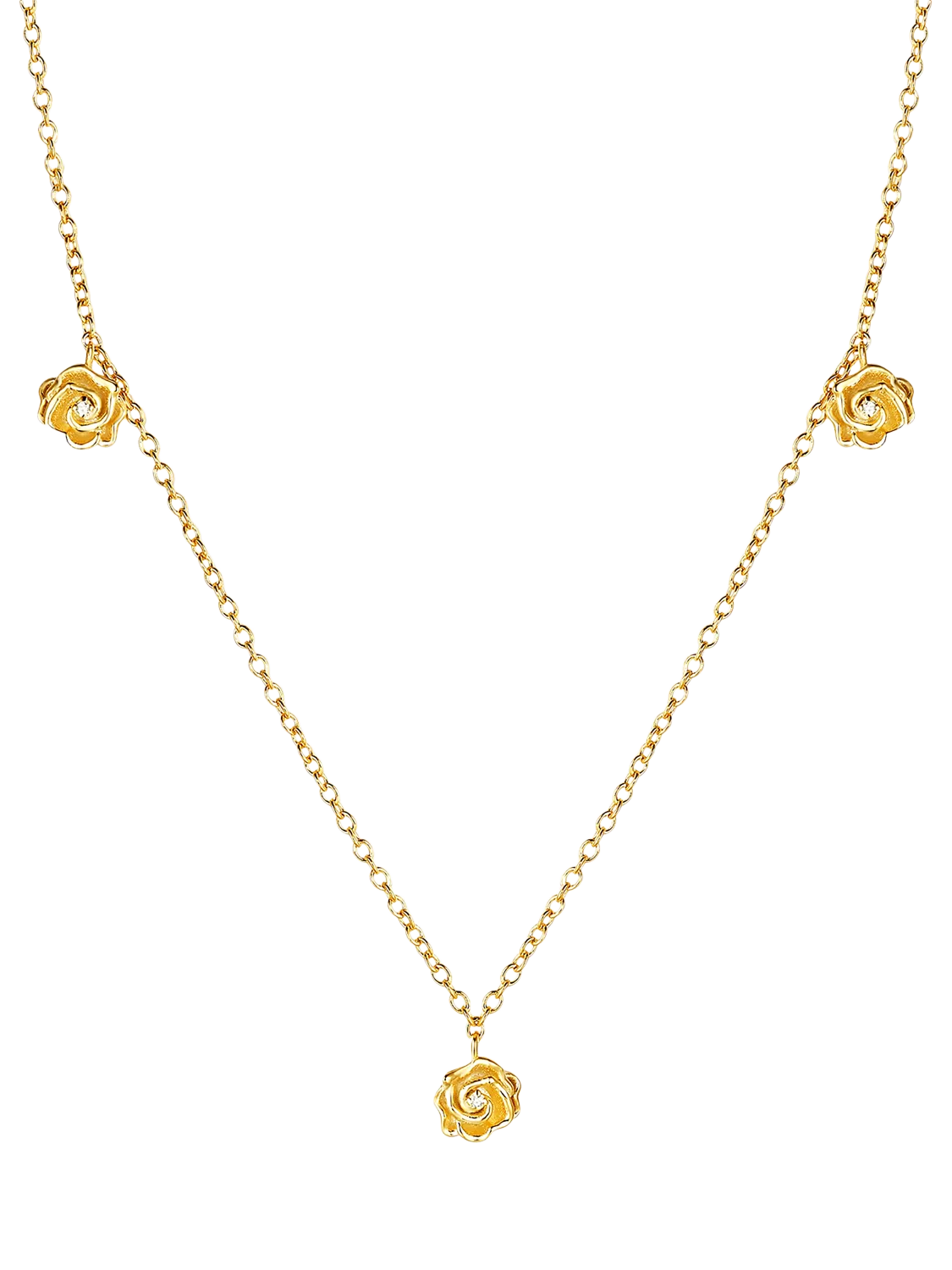 Add a petal-perfect touch of whimsy to every day. Featuring 3x lovely rose pendants in full bloom, each hand set with a natural white diamond, this necklace makes you blossom with style and elegance.