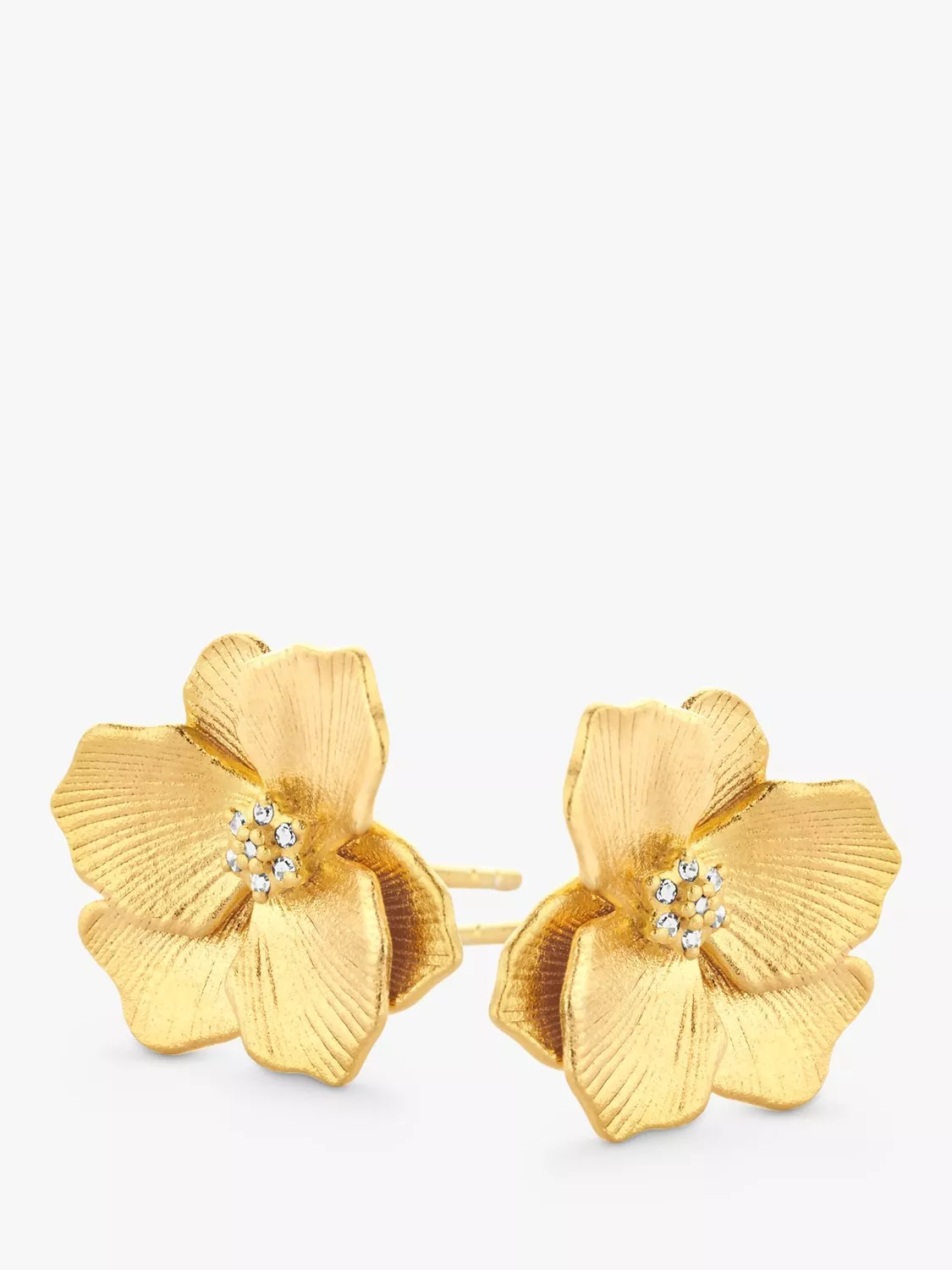 These earrings feature a delicately detailed and engraved Jasmine flower, with a brightly gleaming diamond heart and a rustic brushed finish. Whatever the season, these stud earrings will spark an immediate burst of springtime happiness.