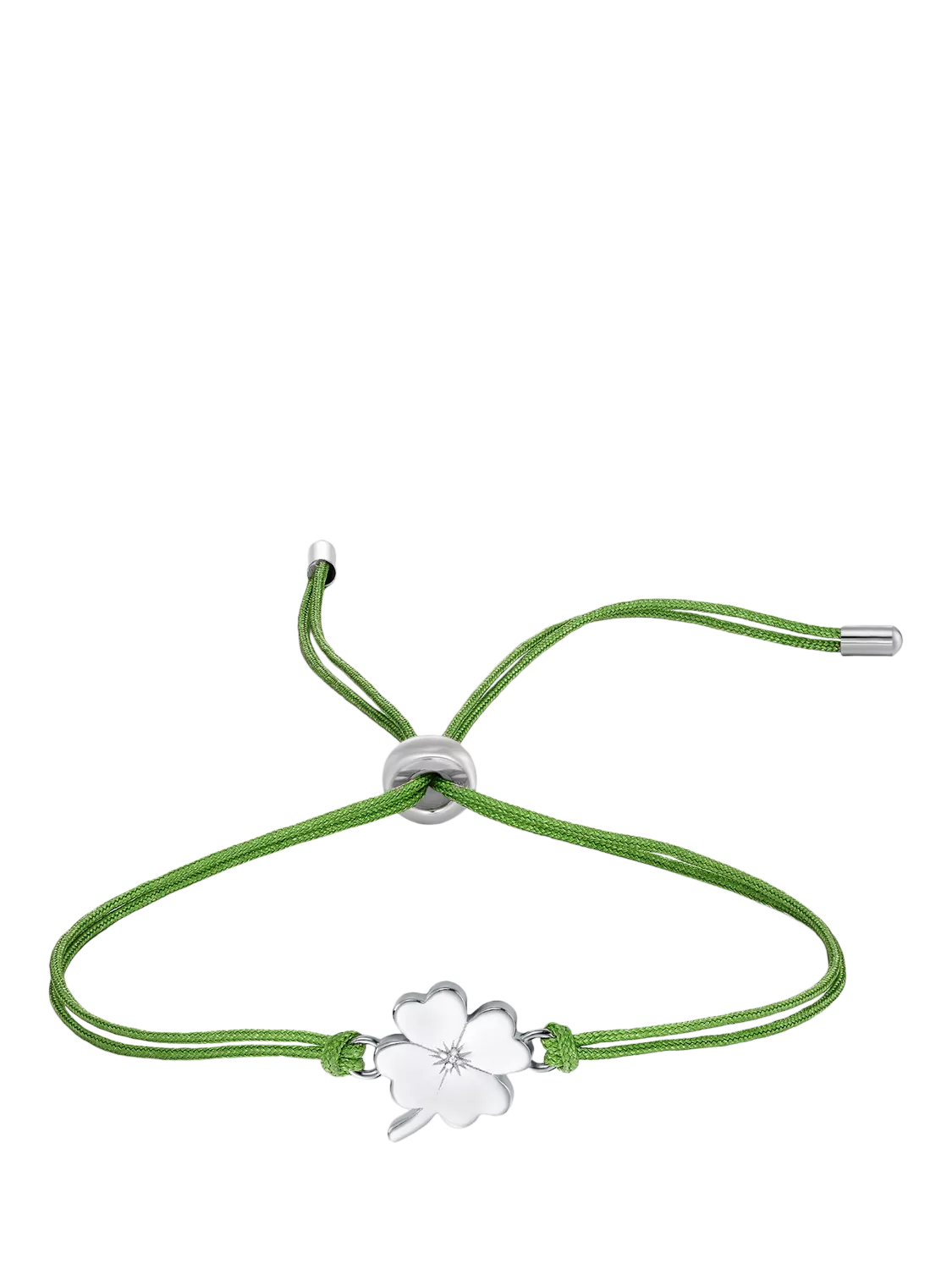 A lucky green cord bracelet, featuring a whimsical 925 sterling silver 4-leaf clover charm. A delicate star engraving graces its surface, with a brilliant white natural diamond at its heart.