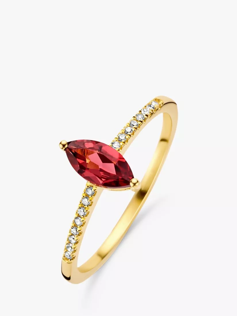 A deeply mysterious, marquise-cut Pyrope Garnet, is set alongside 16 bright and shiny signature diamonds. No doubt about it, this one is a knock-it-out-of-the-park kind of gift.