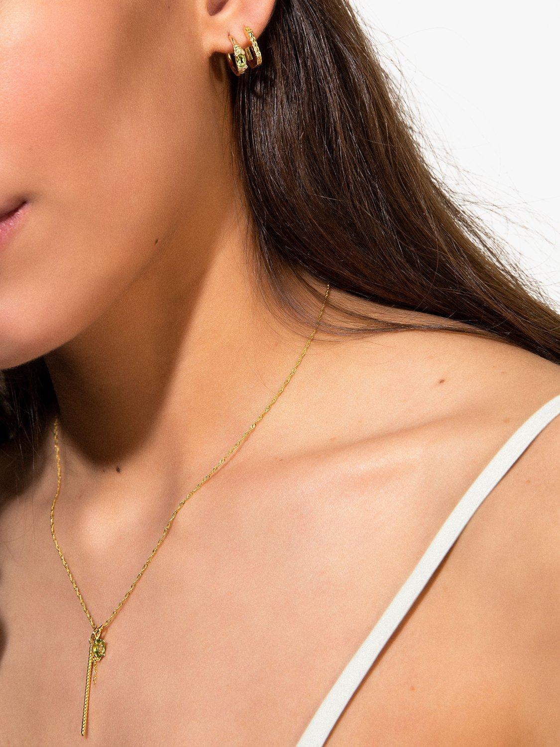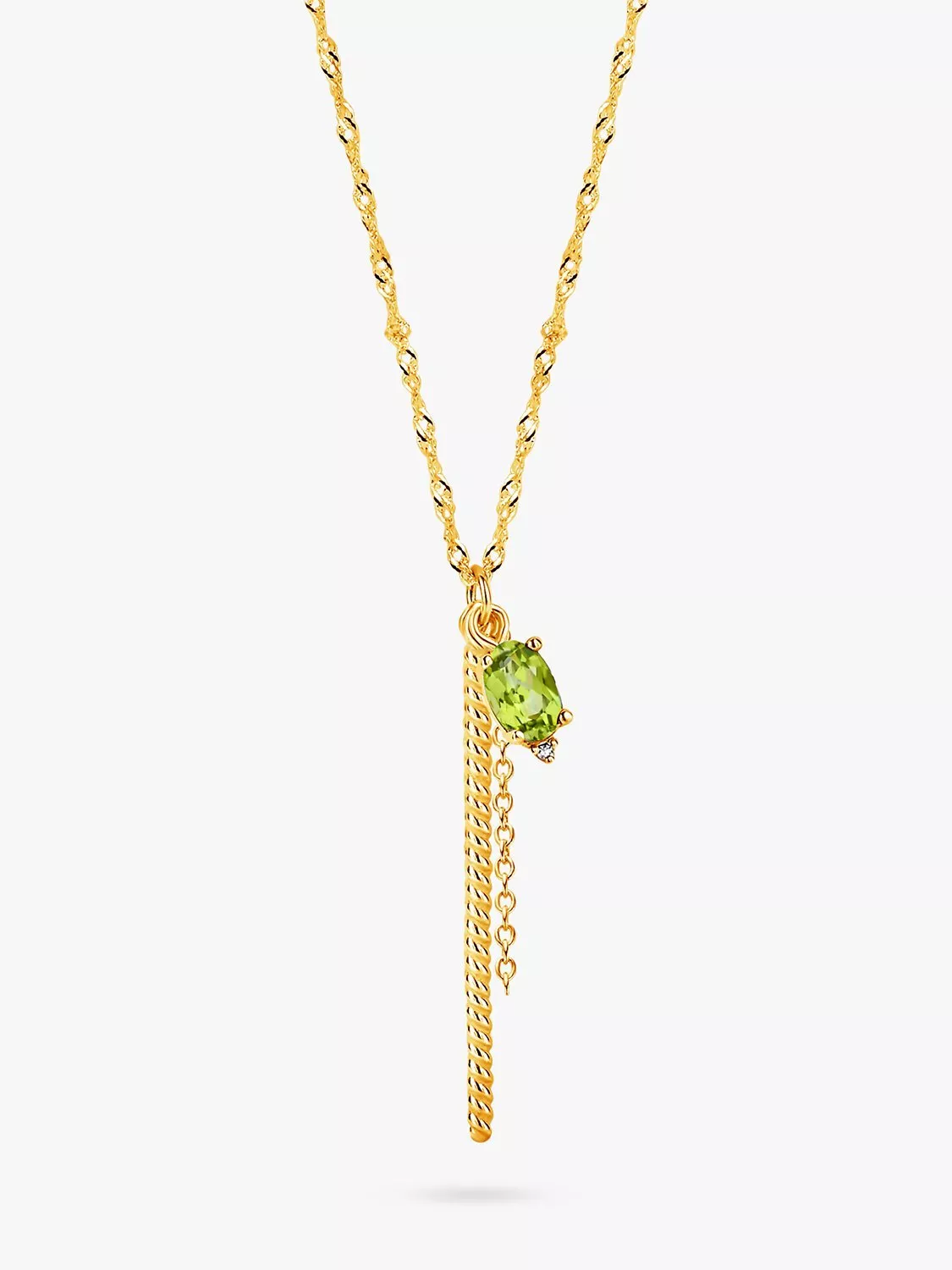 A pendant necklace, featuring an oval peridot gemstone and a crisp diamond, twinkling bright as the sunny reflections in the sea. A playful chain and a twisted ornament complete the set, capturing the mesmerizing movement.