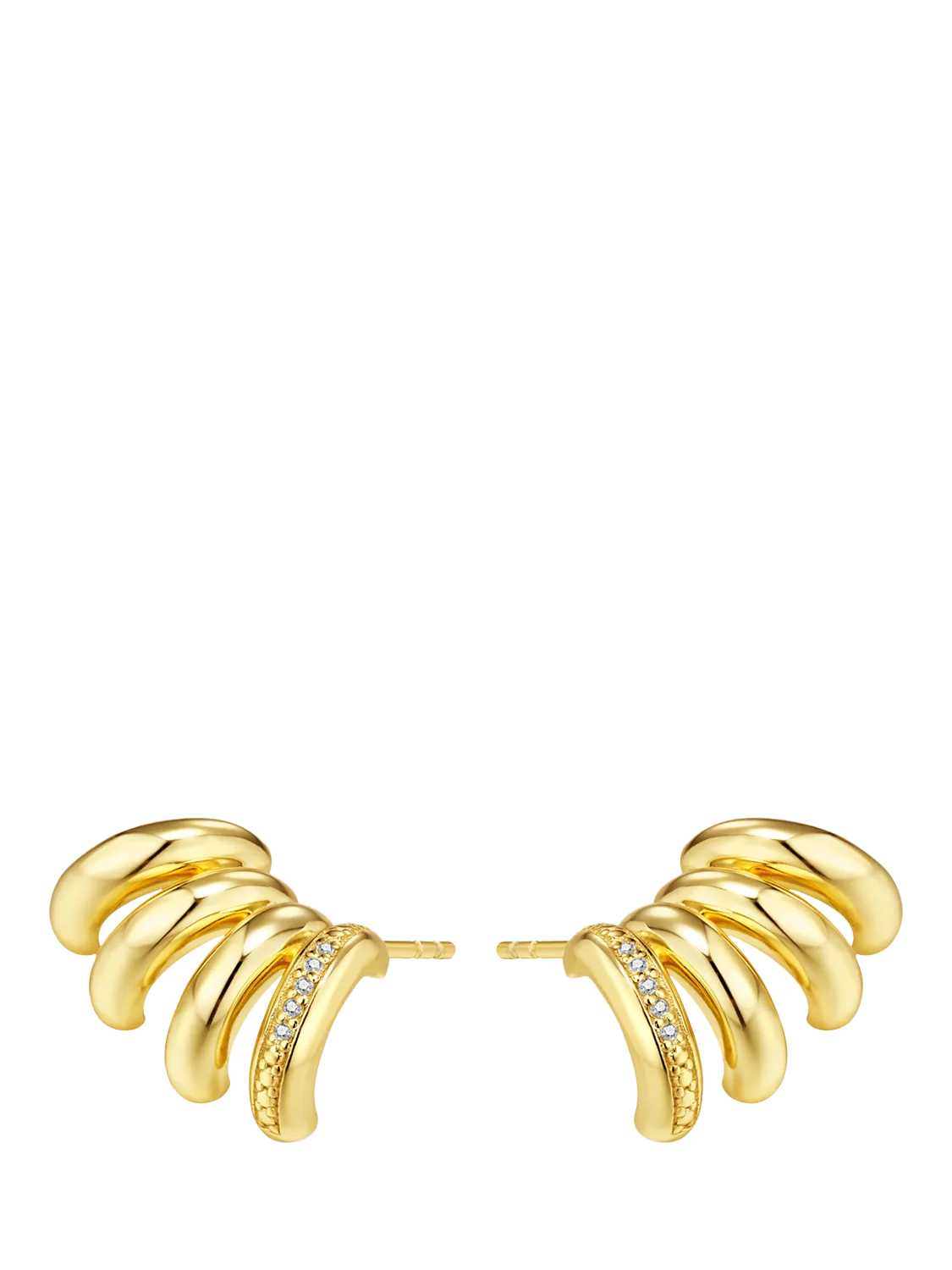 Experience the charm of layered sophistication with these exquisite earrings, featuring four fixed bands stacked to perfection. The inner one, adorned with 5x handset diamonds, adds a touch of shimmering brilliance to the ensemble. Designed to create the illusion of multiple piercings, these earclimbers offer the easy convenience of a single piece.