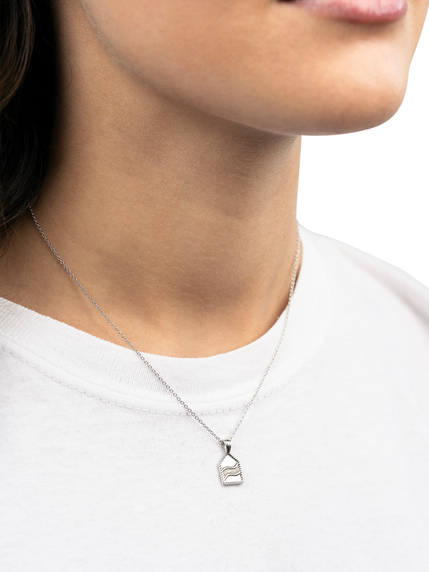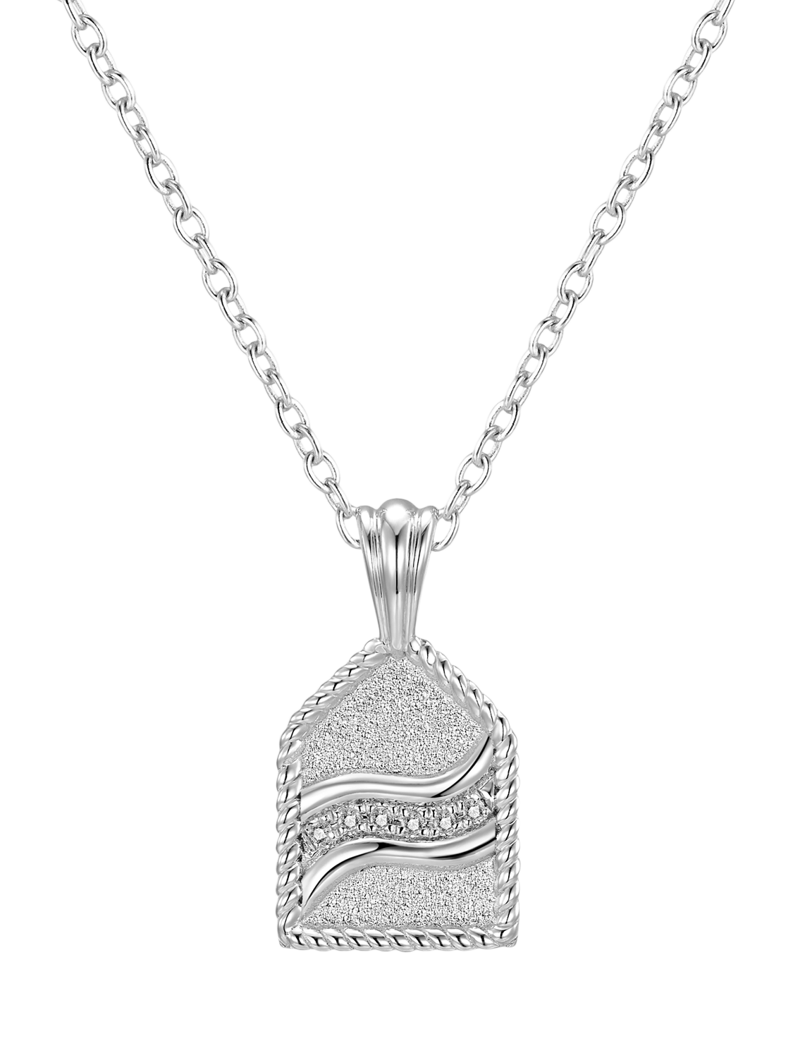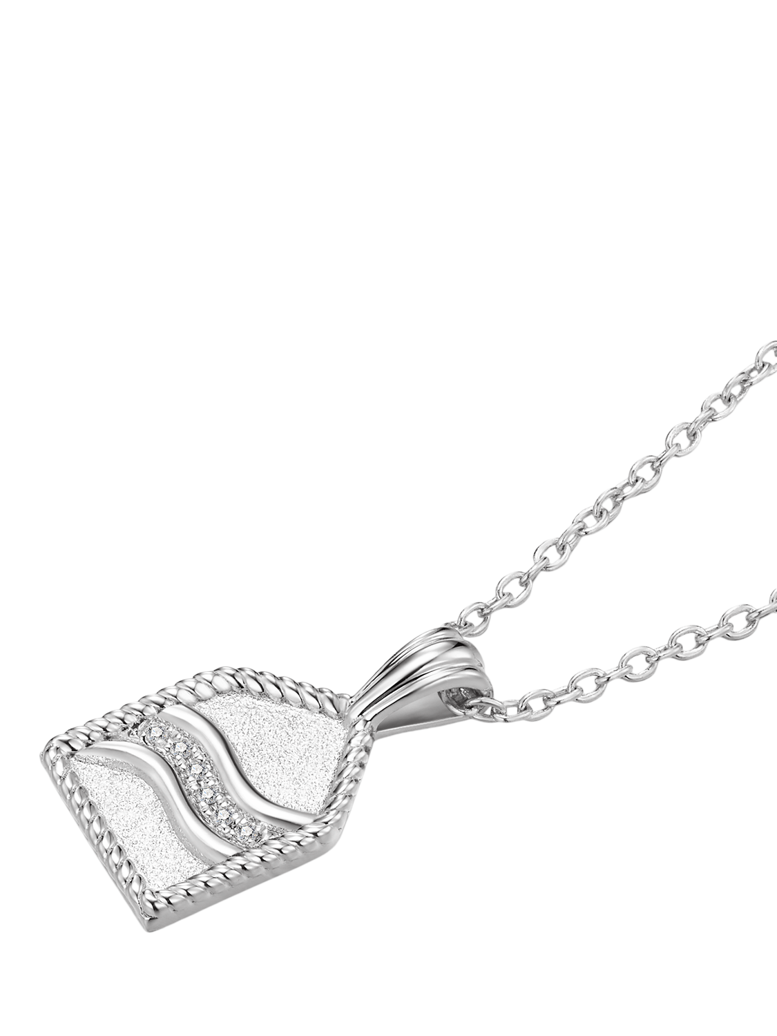 Featuring a pentagon-shaped amulet with a delicately brushed finish and twisted rope border, this design captures the power and serenity of water in motion. Inside, a threefold stream flows gracefully, with the centre stream sparkling with 6x natural diamonds, like glistening droplets in a sea of sophistication.