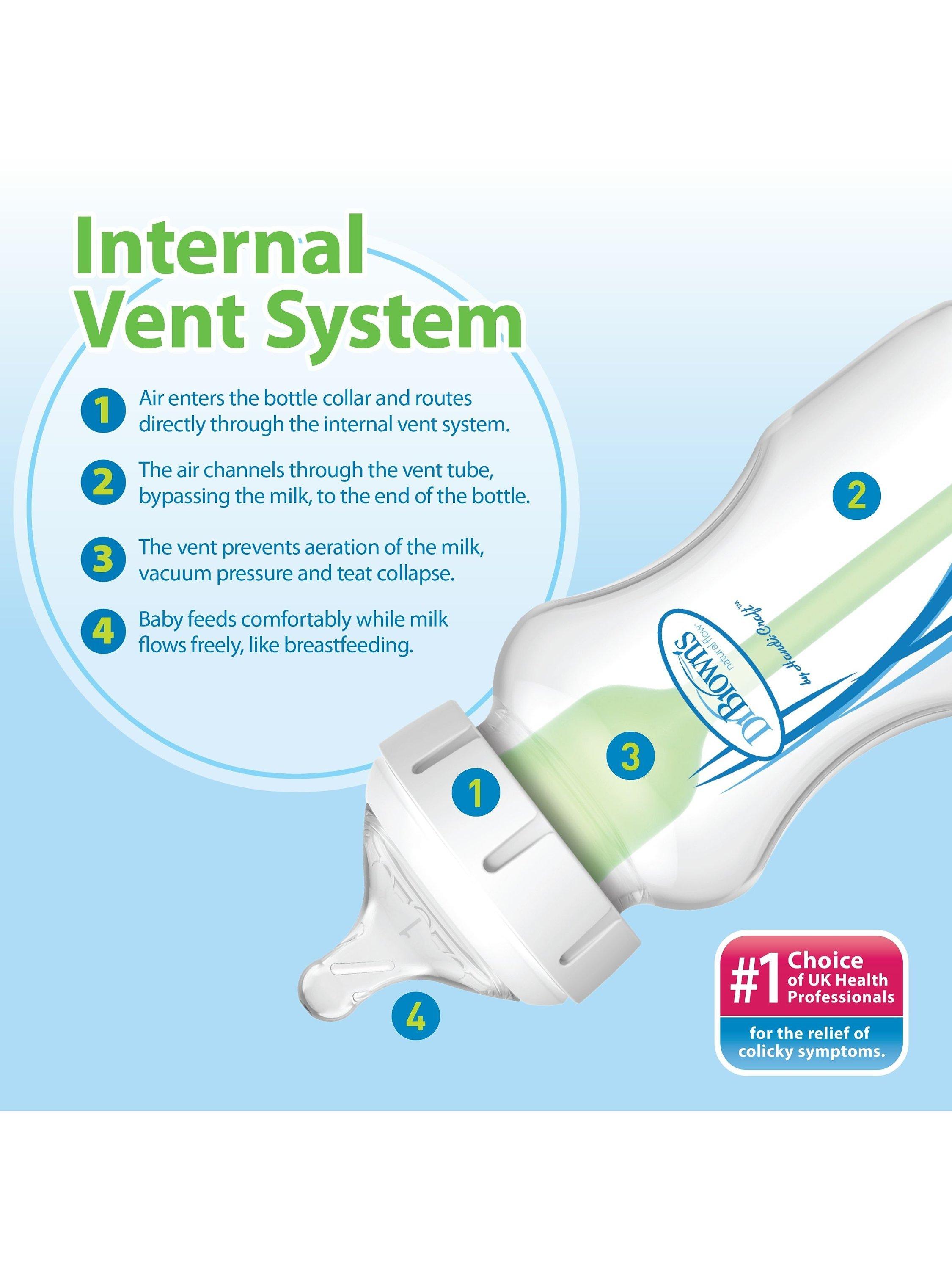 The Dr Brown's Options+ range features a unique internal vent system that channels air away from baby’s feed as air can cause these colicky symptoms.