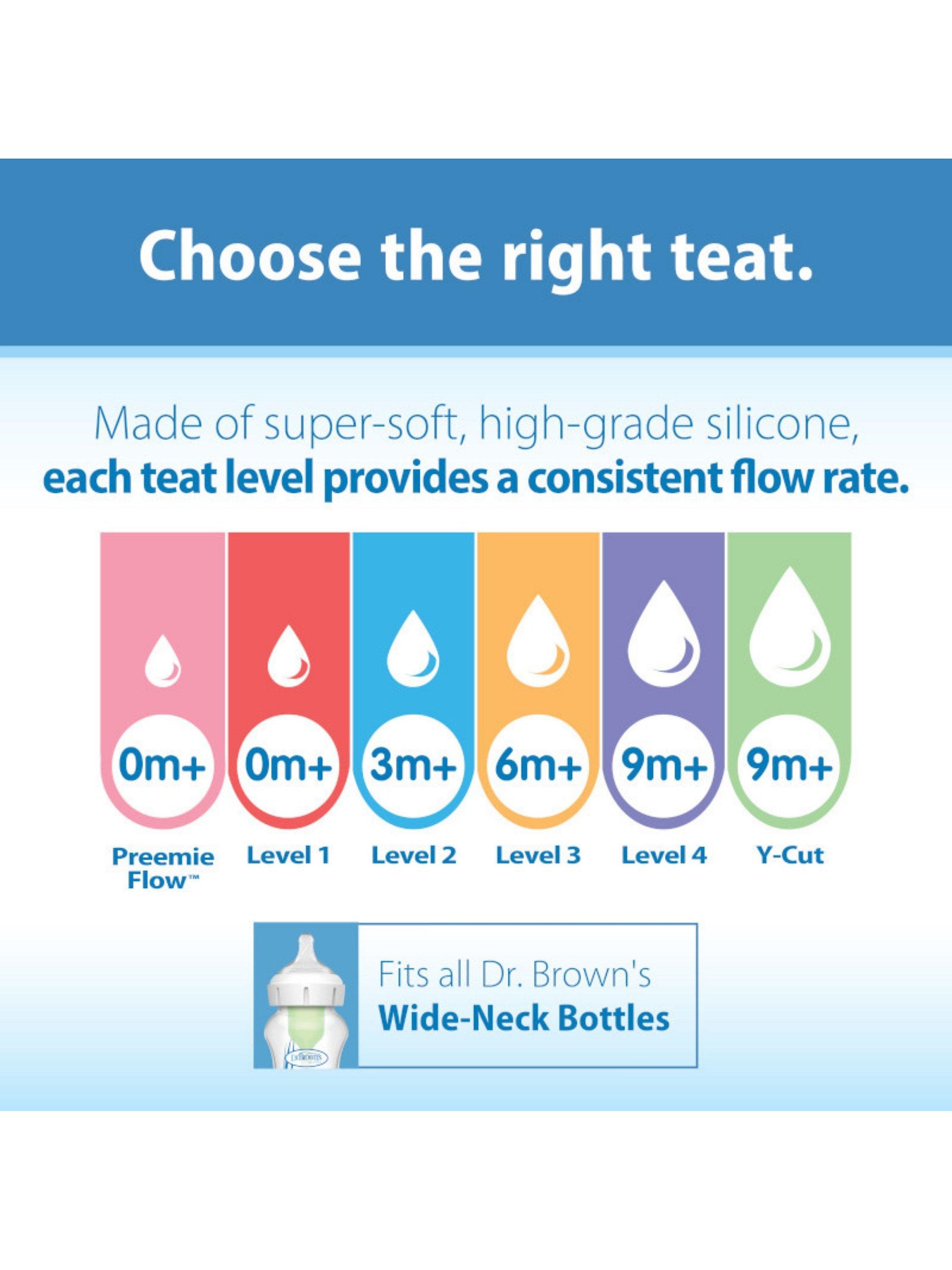 The unique internal green vent system continues to create 100% vacuum-free feeding, which is clinically proven to help reduce wind related colic. This is what makes Dr Brown’s the number one choice of UK Health Professionals for the relief of colicky symptoms. The breast-like teat shape is correctly contoured for a proper latch and a more natural bottle-feeding experience - perfect for switching from breast to bottle and back again! Each teat is specially engineered to offer the same consistent natural flow, so you and baby know what to expect in every feed.