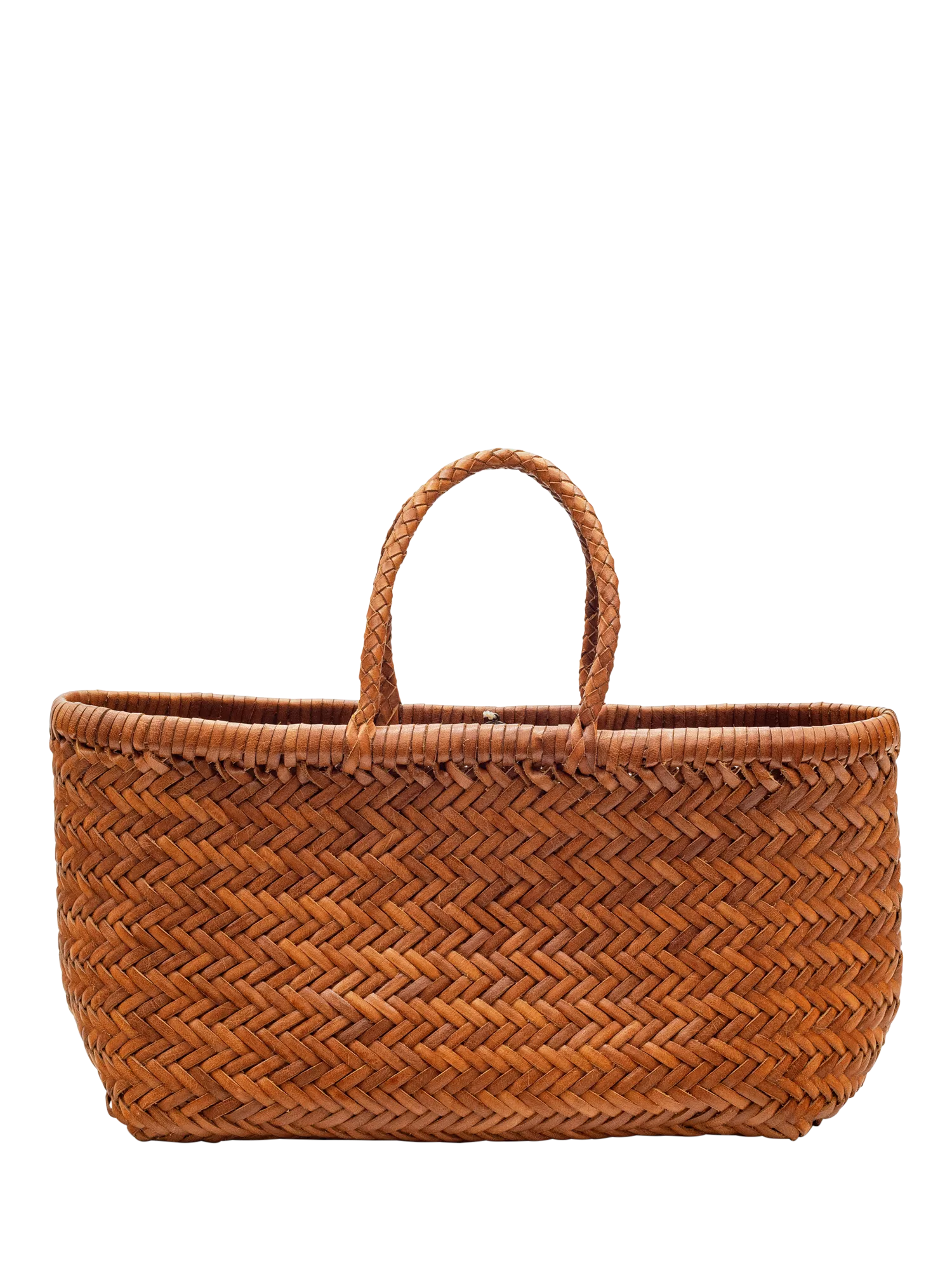 A roomy, hand-woven basket in smooth, buffalo calf leather from Dragon Duffusion. Handcrafted by artisan weavers in one piece, the diagonal chevron weave is what makes this style unique. And, remaining true to traditional basket-weaving techniques, the bag comes unlined with an open top.