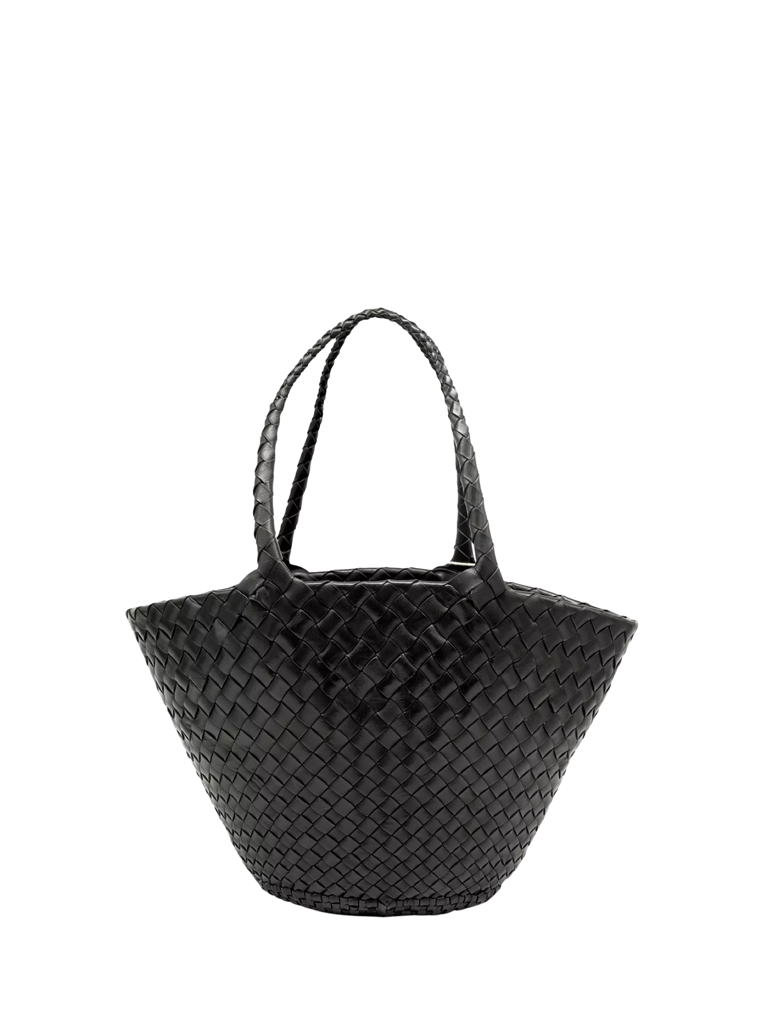 The Egola reinterprets traditional basket weaving techniques into a modern accessory, featuring a striking pattern of irregularly woven tapered leather strips. This woven leather tote bag boasts an open top design, making it versatile and suitable for all seasons. Its unique weave not only showcases craftsmanship but also adds texture and depth, enhancing its visual appeal.
