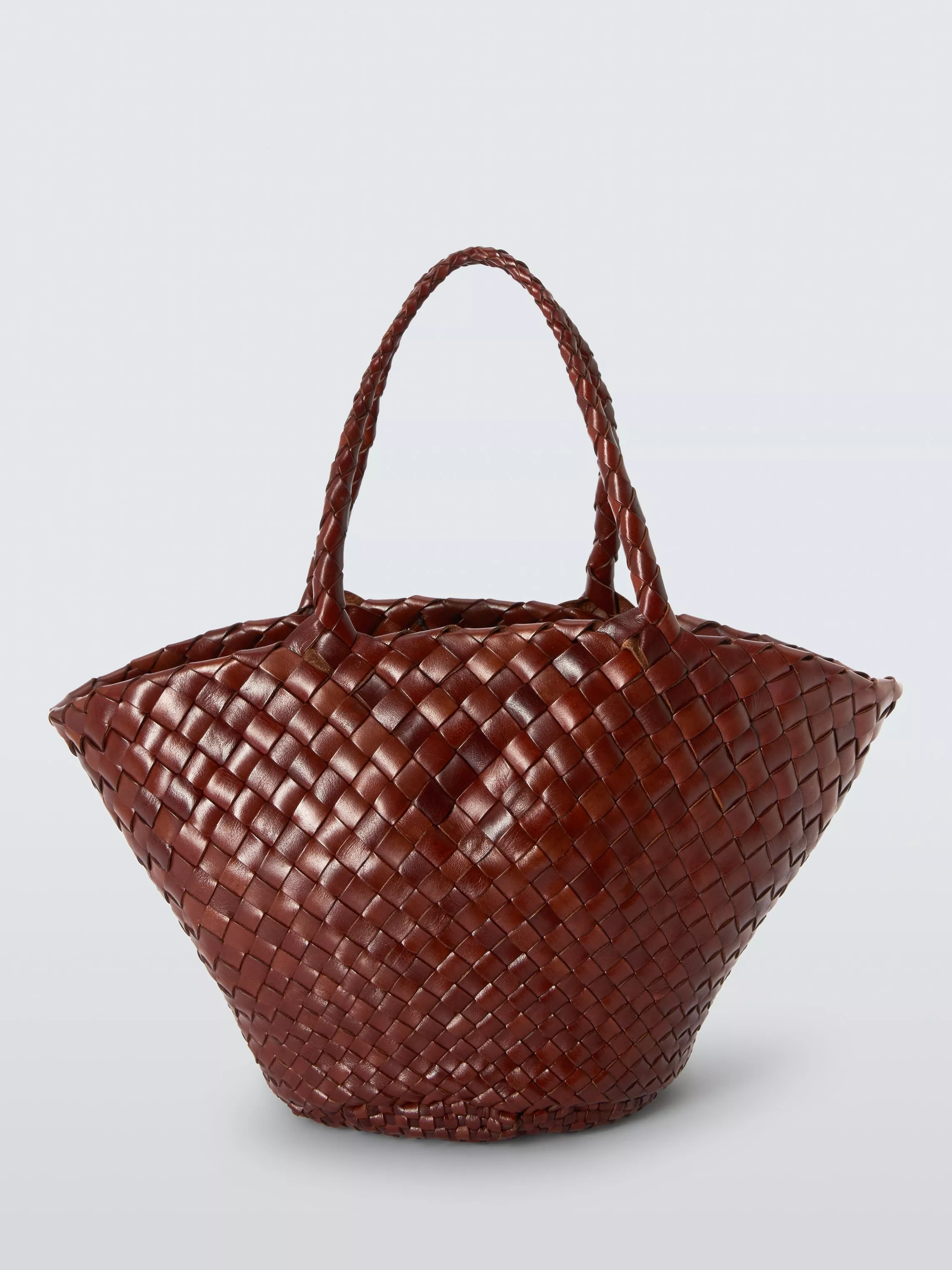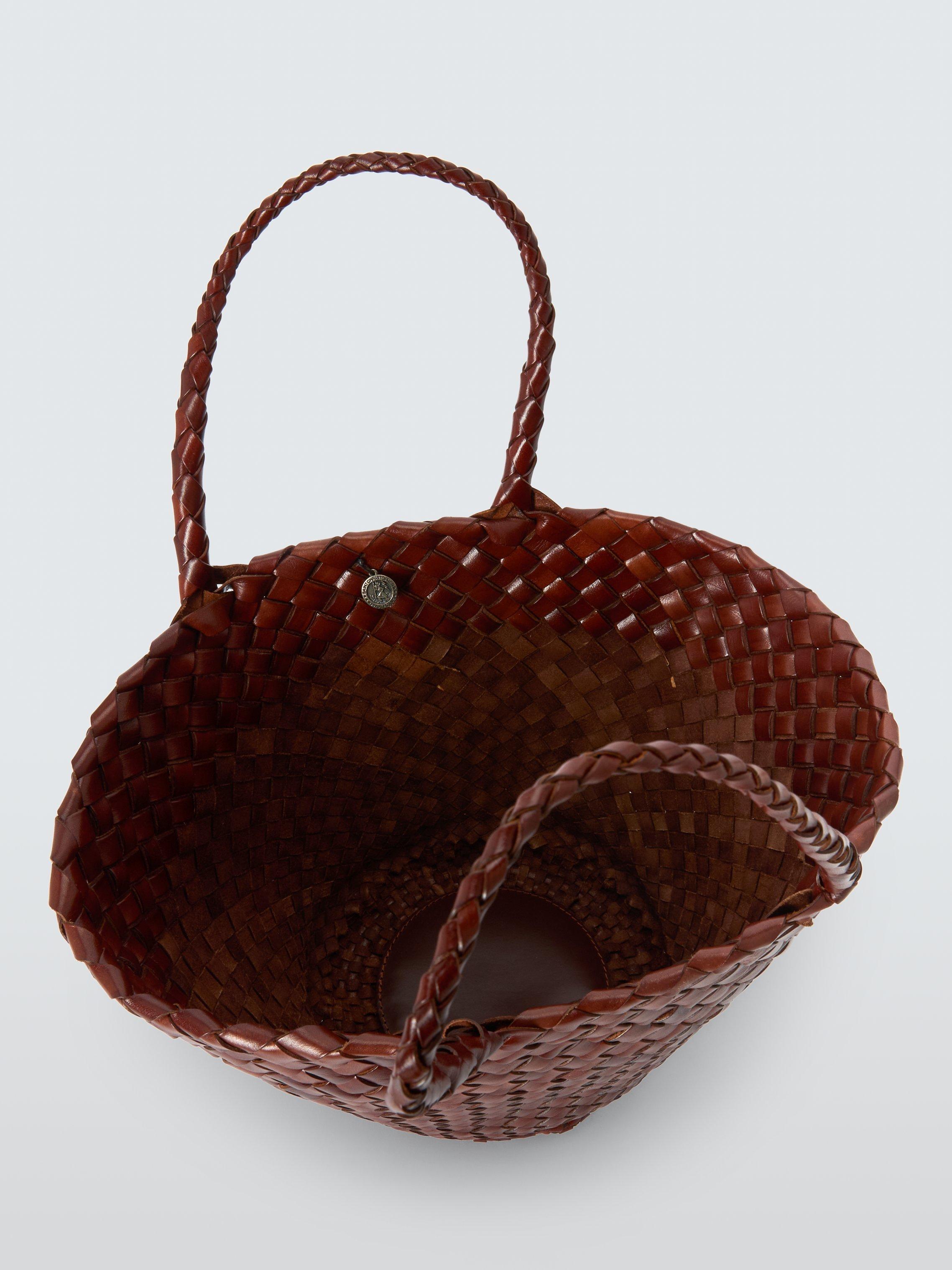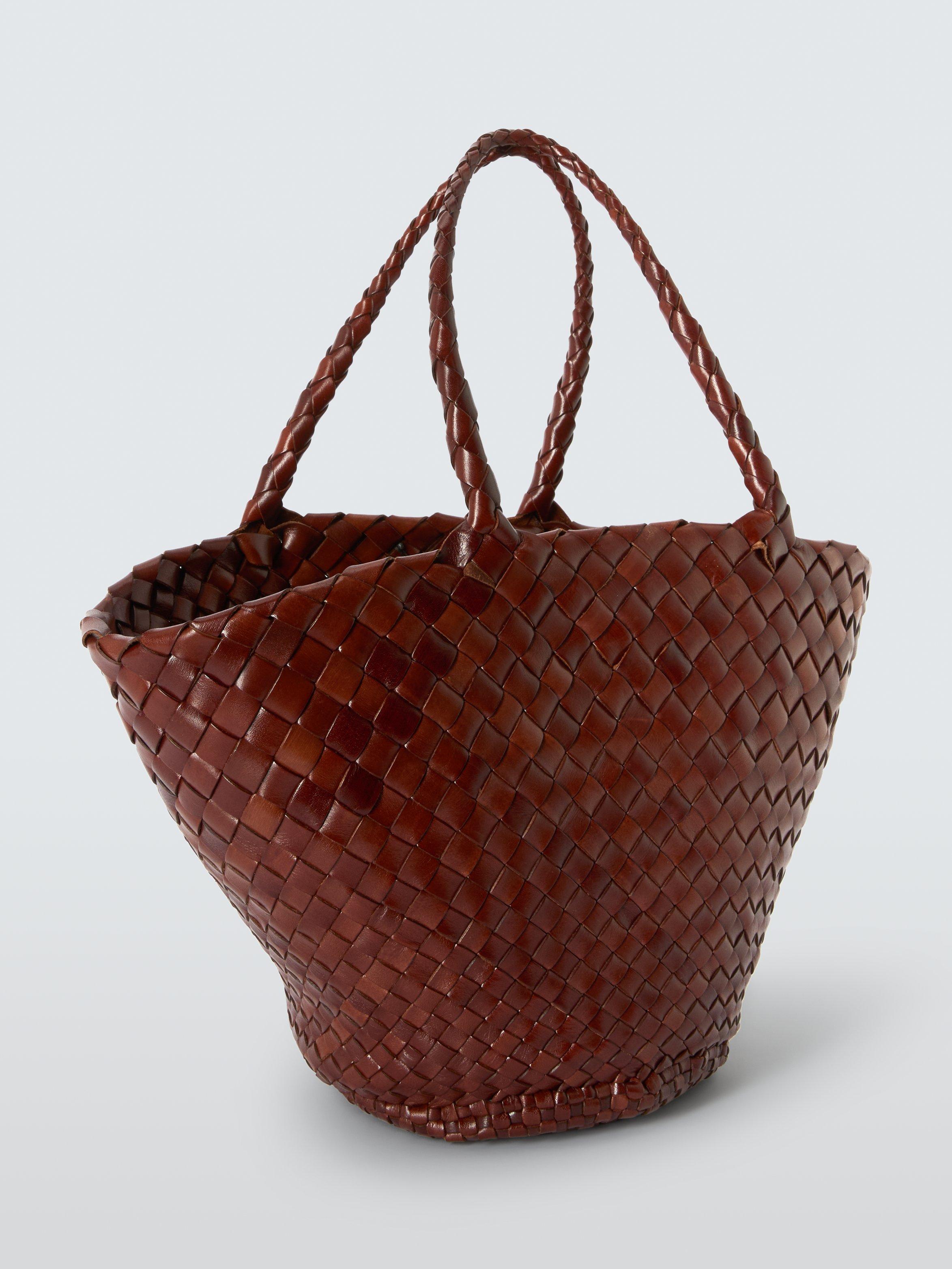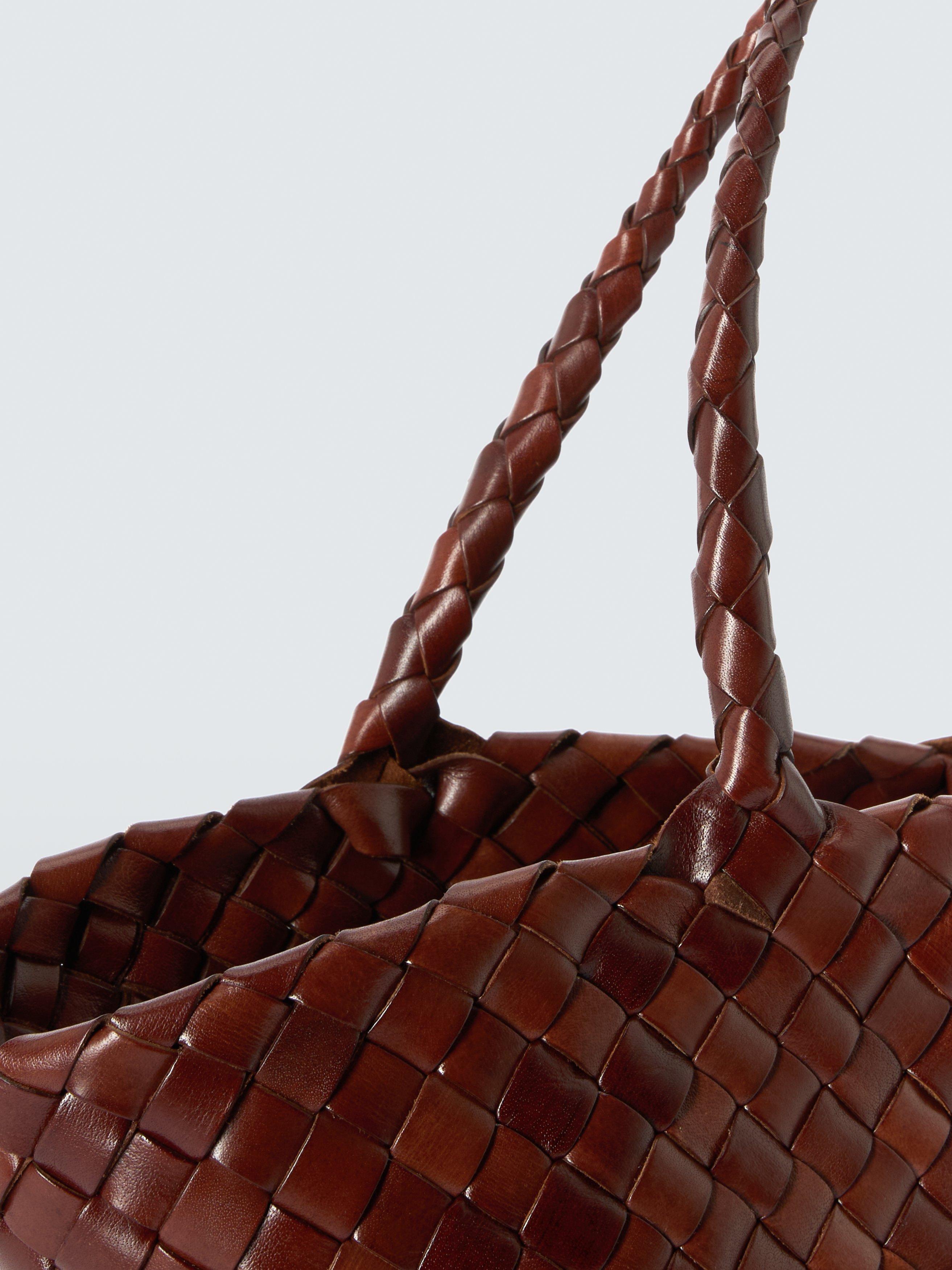 The Egola reinterprets traditional basket weaving techniques into a modern accessory, featuring a striking pattern of irregularly woven tapered leather strips. This woven leather tote bag boasts an open top design, making it versatile and suitable for all seasons. Its unique weave not only showcases craftsmanship but also adds texture and depth, enhancing its visual appeal.