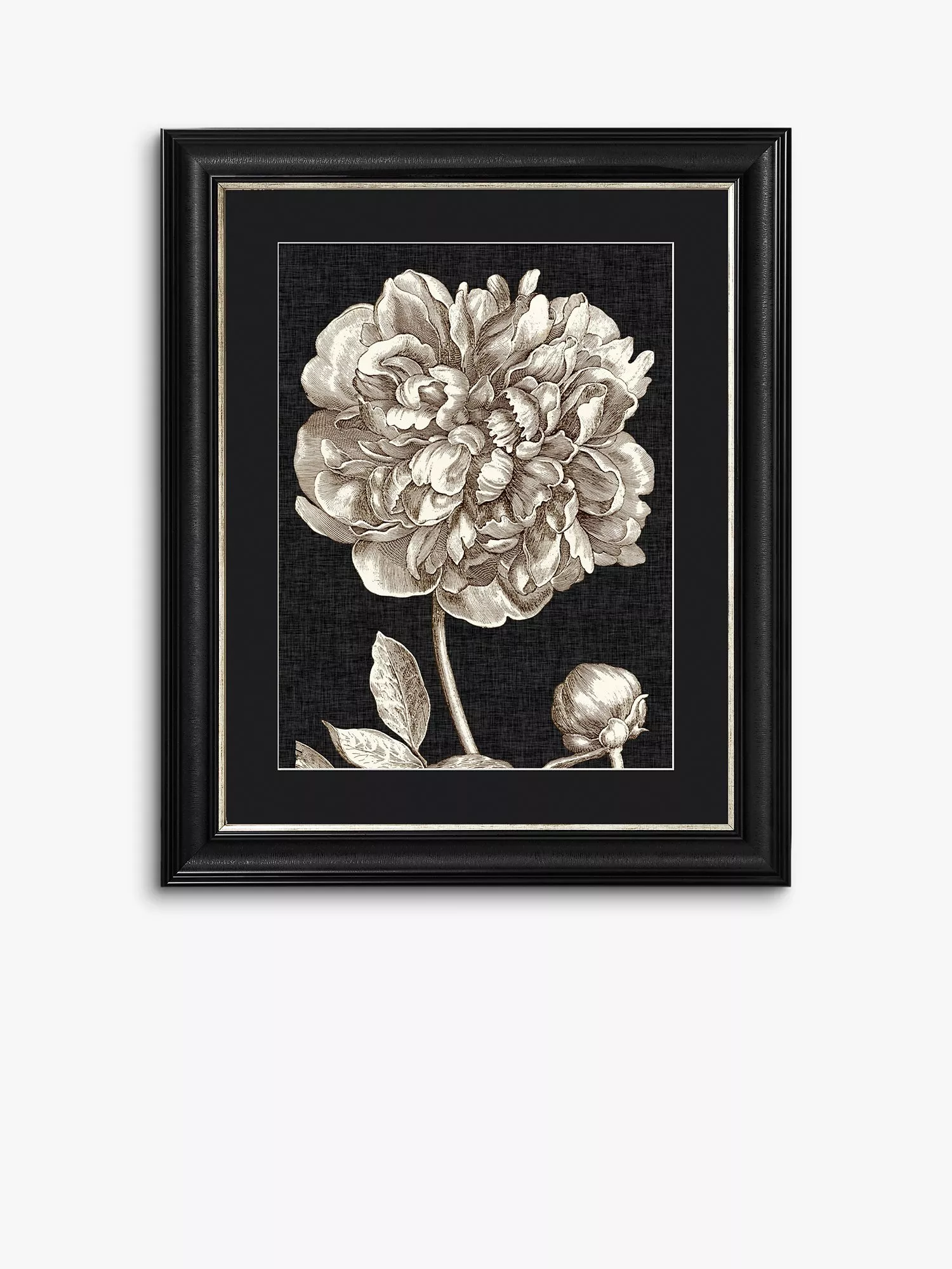 A detailed illustration capturing the intricate beauty of the peony flower, printed on satin photo paper and framed in an antique pewter moulding. The frame is made of a recycled wood composite and comes with a black mount and core.