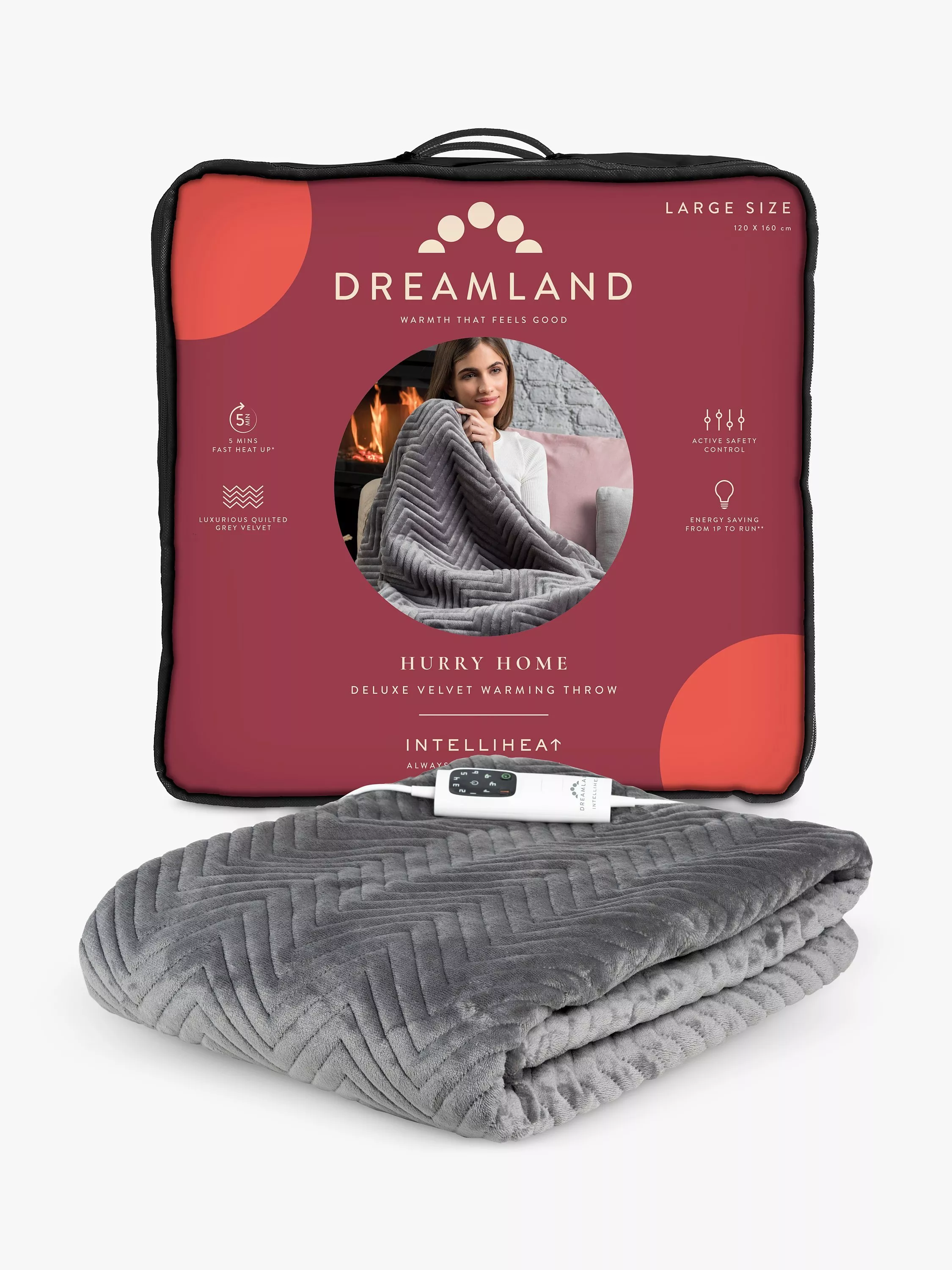Dreamland's Deluxe Grey Velvet Herringbone Quilted Throw is super-soft and perfect to snuggle under, you will be warm and cosy in minutes thanks to the fast heat Intelliheat + technology. Cleverly responds to temperature changes while you sleep and relax. 5 minute fast heat up time, 6 temperature settings, 1, 3 or 9 hour auto shut off timer, detachable digital control, machine washable and tumble dry safe.