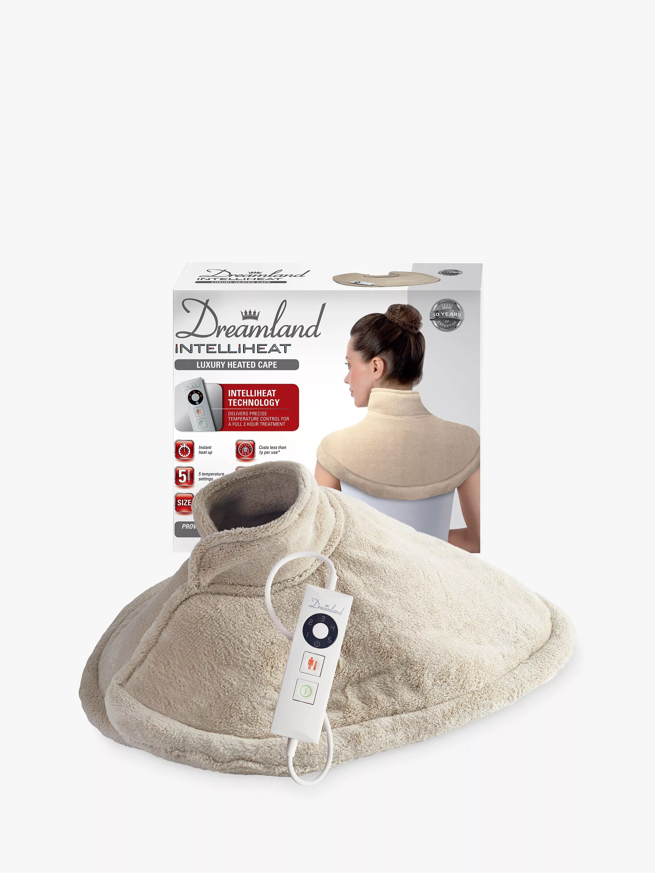 Boasting instant heat and precise temperature control, Dreamland’s Luxury Intelliheat Heated Cape offers comfort and warmth all around your shoulders and back.
