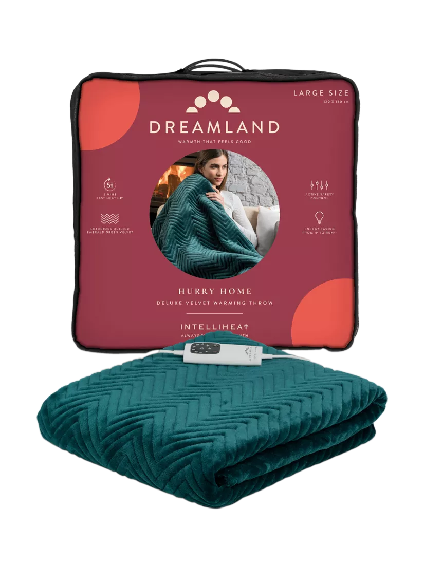 5 minute fast heat up, 6 temperature settings, auto shut off timer. It’s machine washable and tumble dryer safe; simply detach the digital control. Comes with a reusable storage bag.