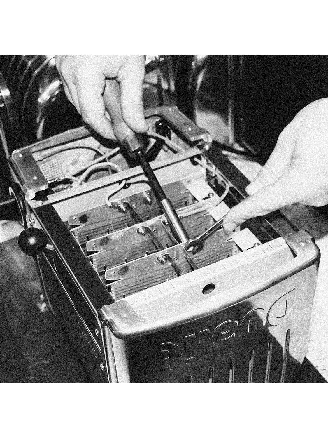 Finally, each of these Dualit toasters is assembled by hand: find the assembler's individual mark on the base plate.