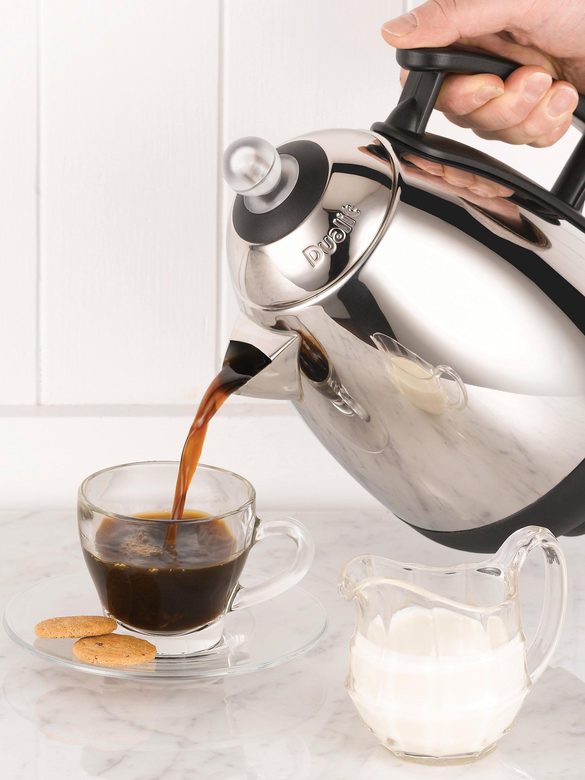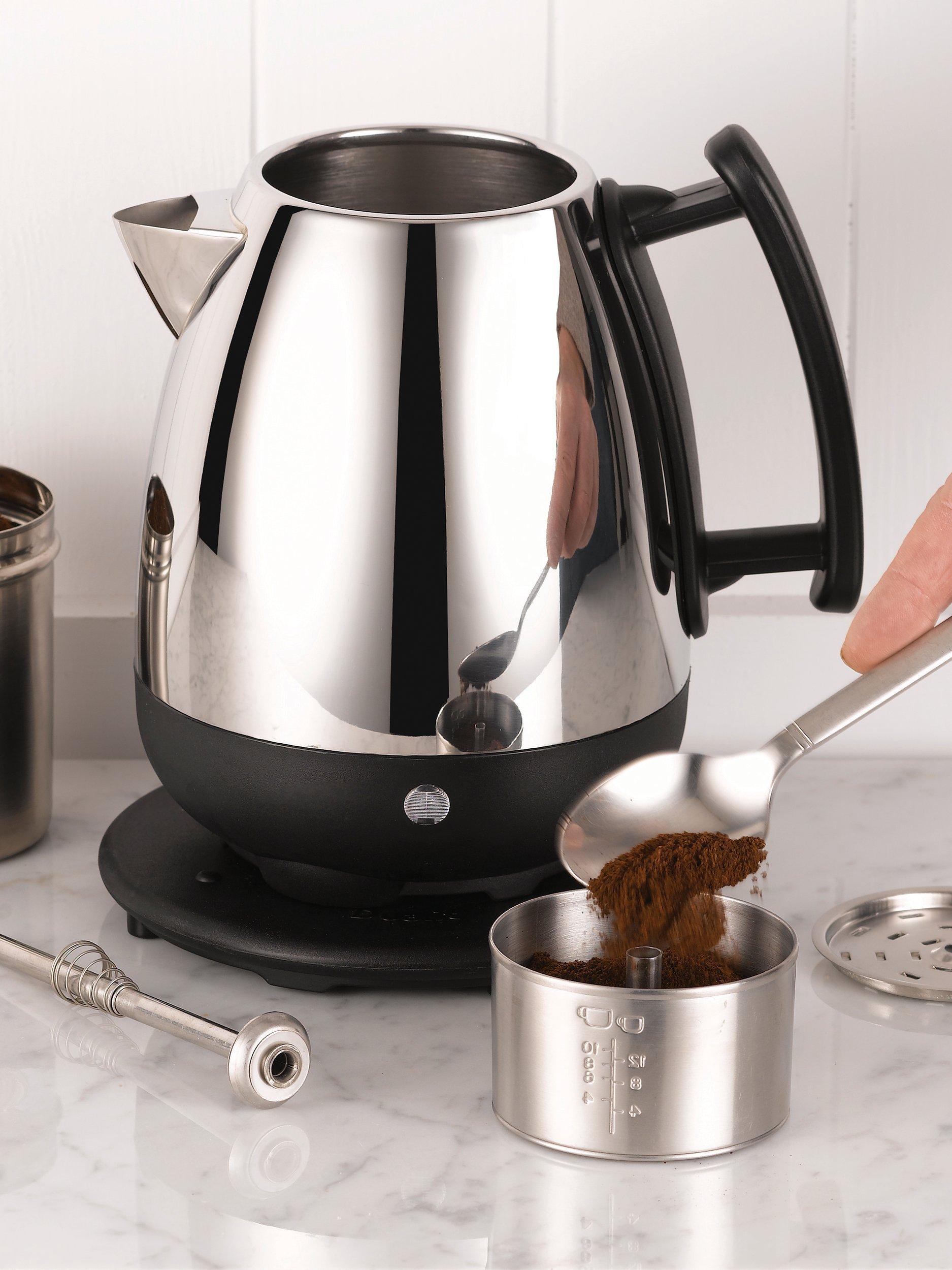 This solidly designed cordless coffee percolator inspires perfect peace of mind. Finished in polished stainless steel makes up to 10 large or 14 small cups of coffee. It has a concealed element, a single power lens, and its base has a 360 axis and cord storage. Includes a translucent lid knob and non-slip handle.