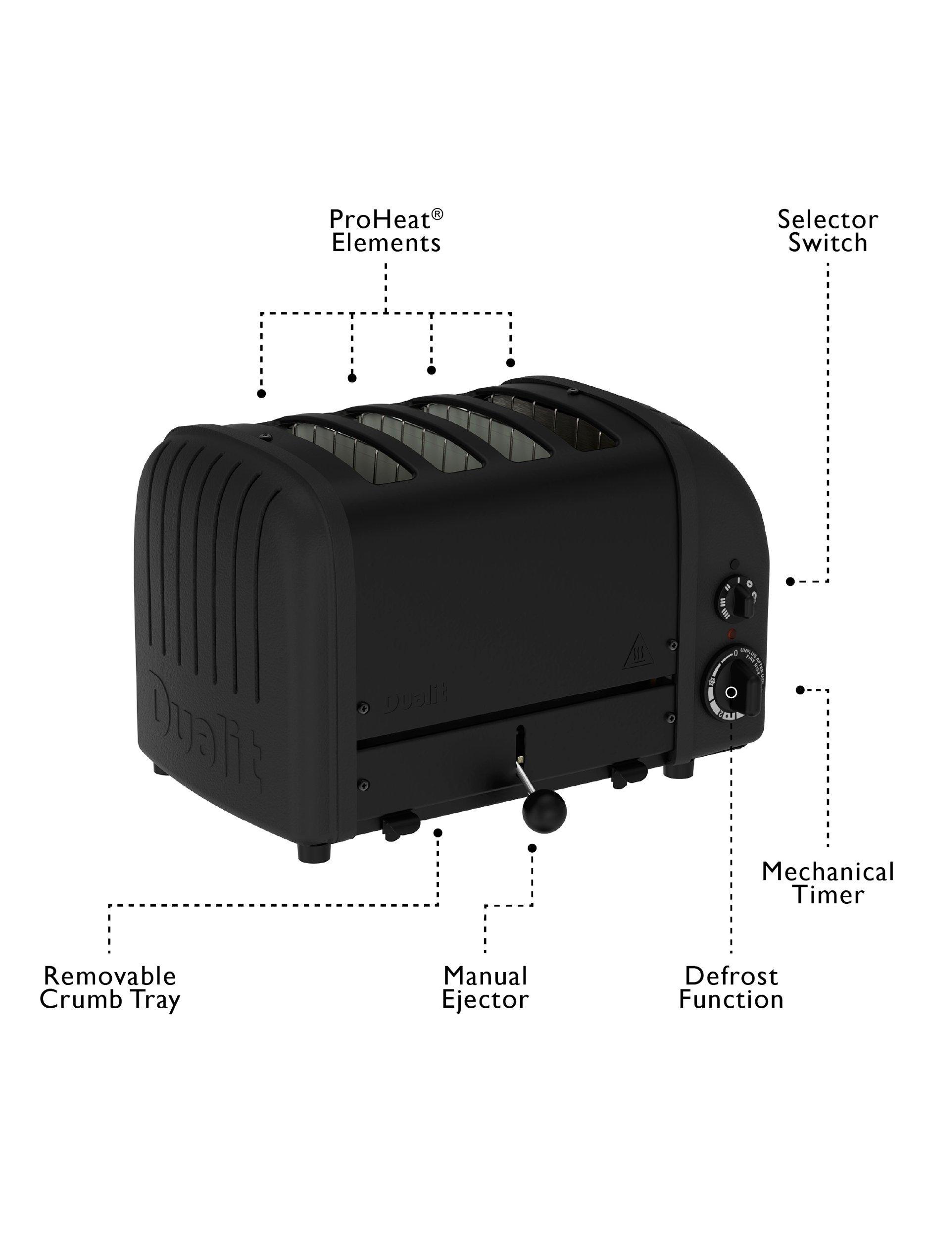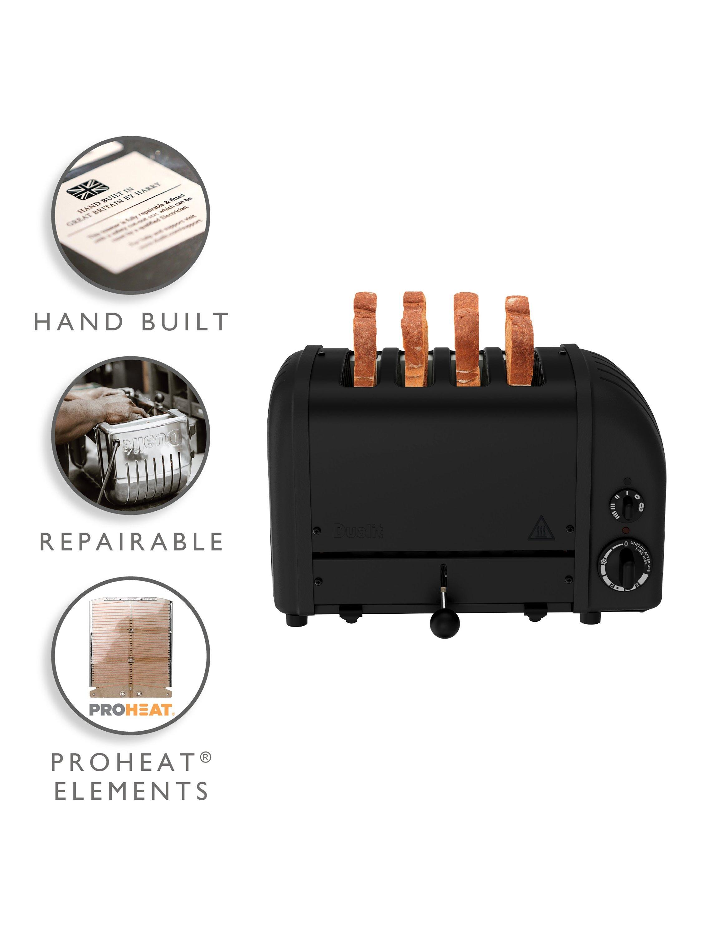 The 4 Slice Classic Toaster features our unique ProHeat® elements. We are proud that every Classic Toaster is handmade in the UK by our skilled craftsman. Quality and attention to detail are paramount, which is why each toaster features the assembler's name on the base plate. It offers all the styling and functionality you would expect from a Dualit toaster, along with the additional features of a defrost setting for frozen bread and the option to toast buns and bagels. The energy-efficient slot selector control allows you to heat one, two, three or all four slots.