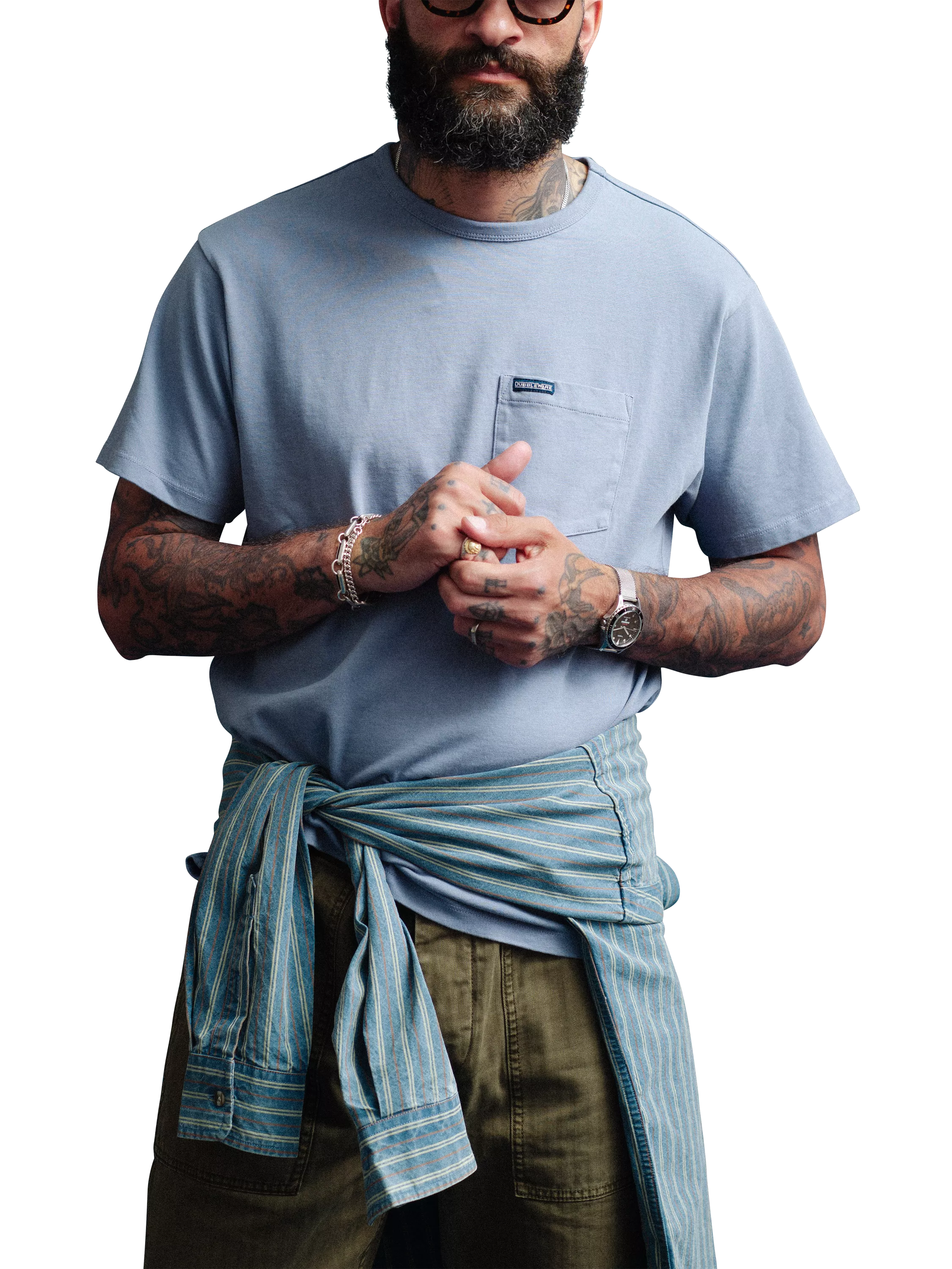 A classic staple for every day, this 100% cotton tee balances a vintage feel with modern, reliable comfort. Its durable 230GSM jersey fabric is soft and built to last, holding its shape wash after wash. The tee has a timeless, regular fit and a structured ribbed neckline, giving it a subtle sense of style. With understated blue bar branding on the pocket, it works just as well on its own as it does layered under a jacket or jumper. It’s an effortless piece that proves comfort and style can go hand in hand.