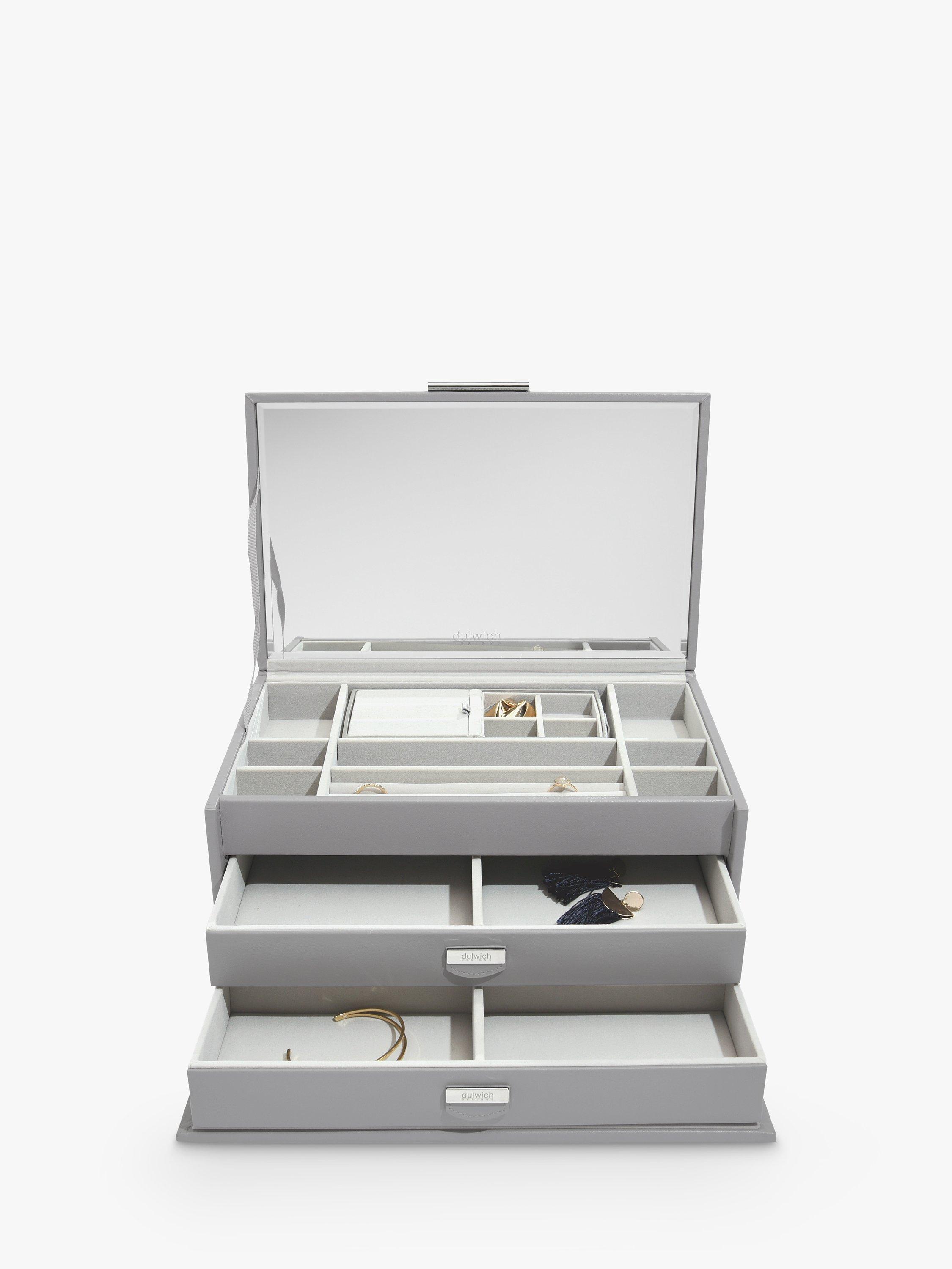 Beautifully crafted with a smooth premium bonded leather and lined with soft grey velvet, this jewellery box features a full-size bevelled mirror beneath the lid and has two drawers for additional storage space.