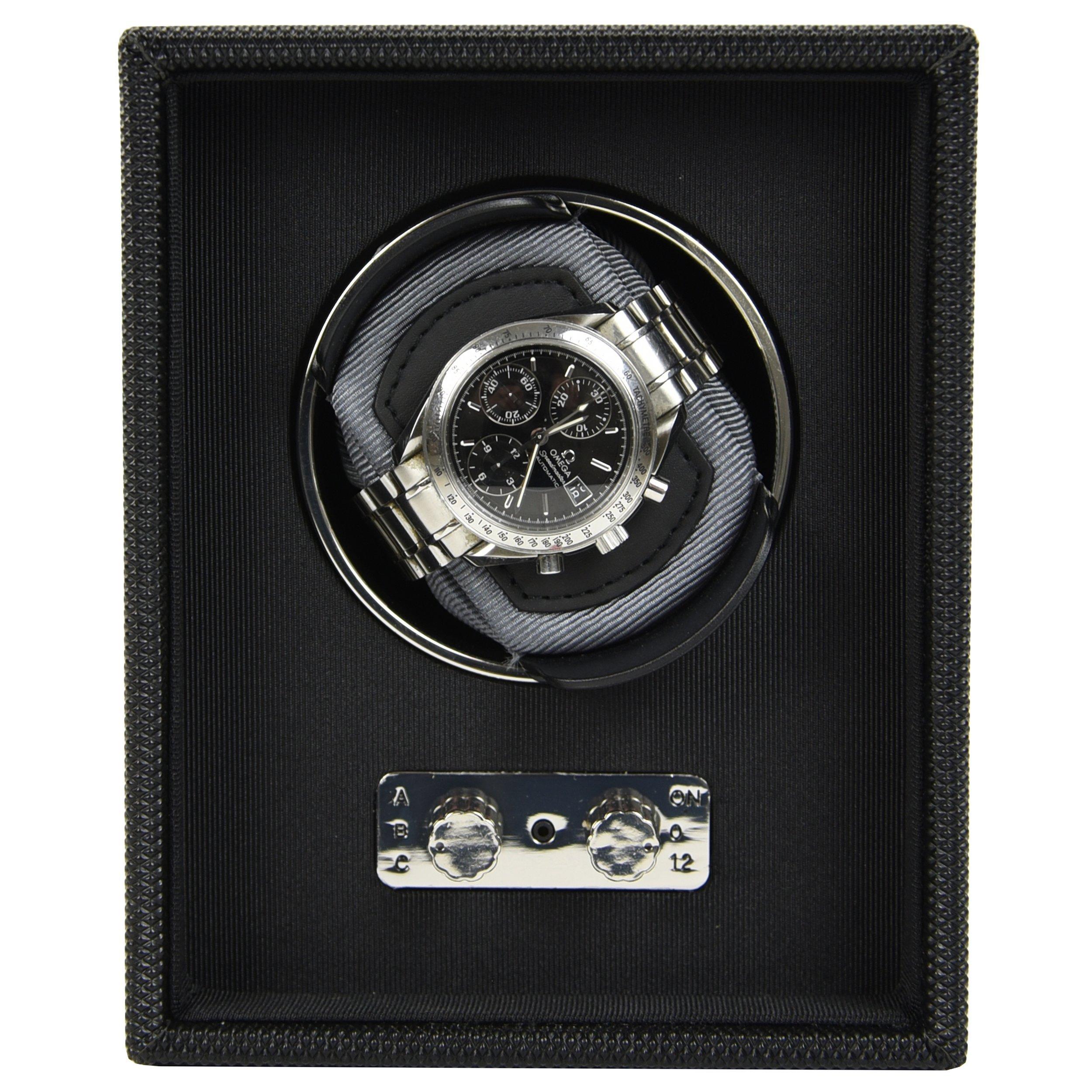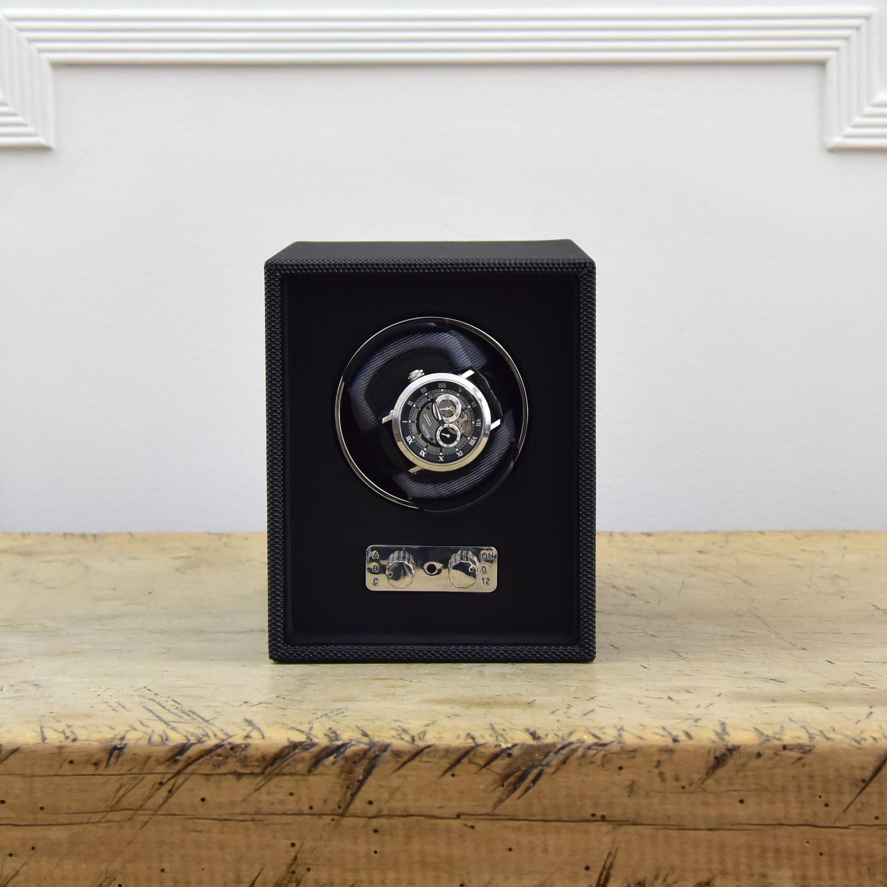 This Monaco Watch Winder is characterised by its contemporary black textured finish and the coloured watch pad. The noise suppression system ensures optimum quietness, and the click-in pad keeps your watches safe and secure whilst they complete their 600 daily rotations. There are 3 rotation settings and a pre-programmed sleep phase with pause rotation (enabling the mainspring to release stored energy). For added flexibility the watch winder can be powered by mains, or battery operated (AA batteries).