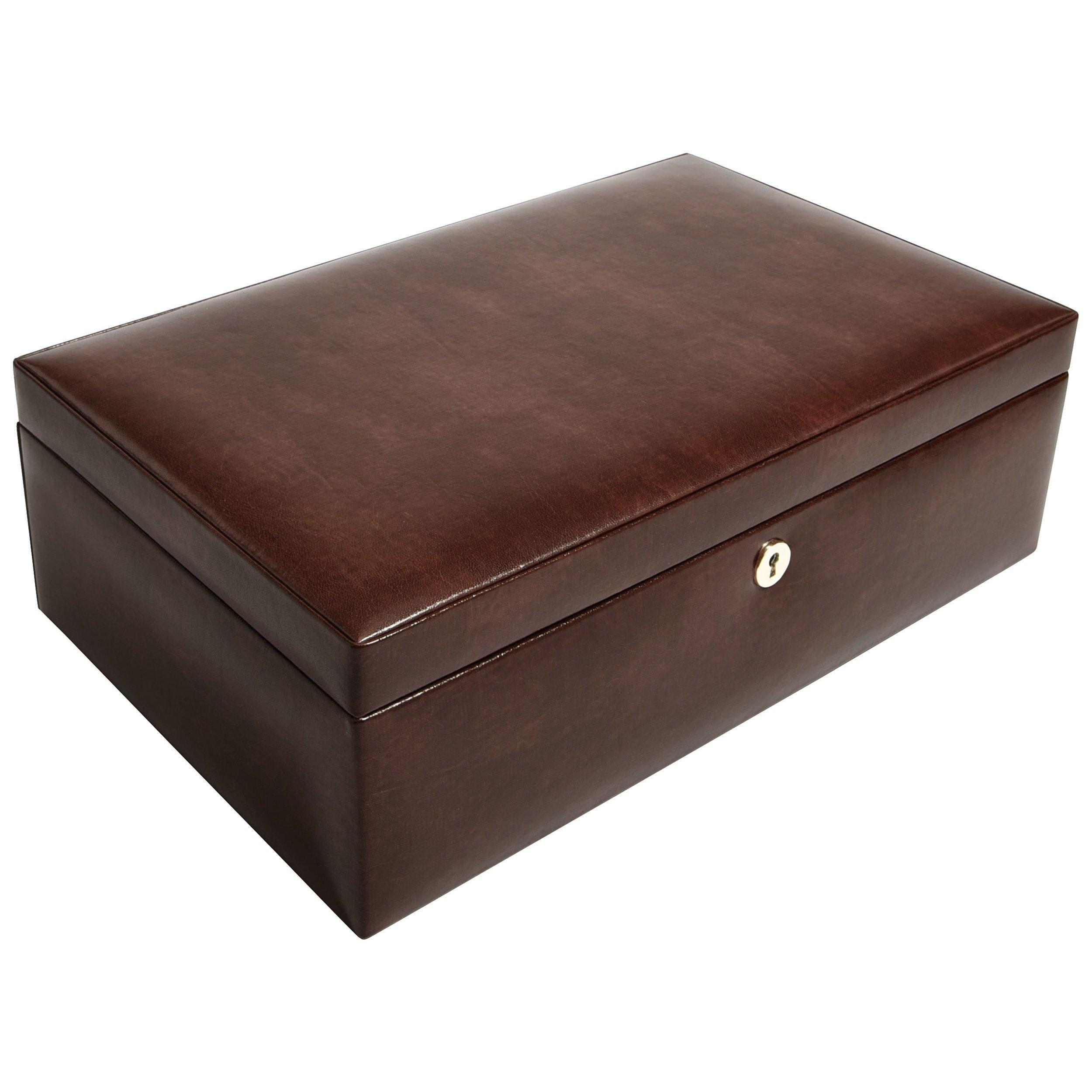 The luxurious tan lining features throughout the entire box. The contrast stitching and antique brass detailing make this box a timeless classic.