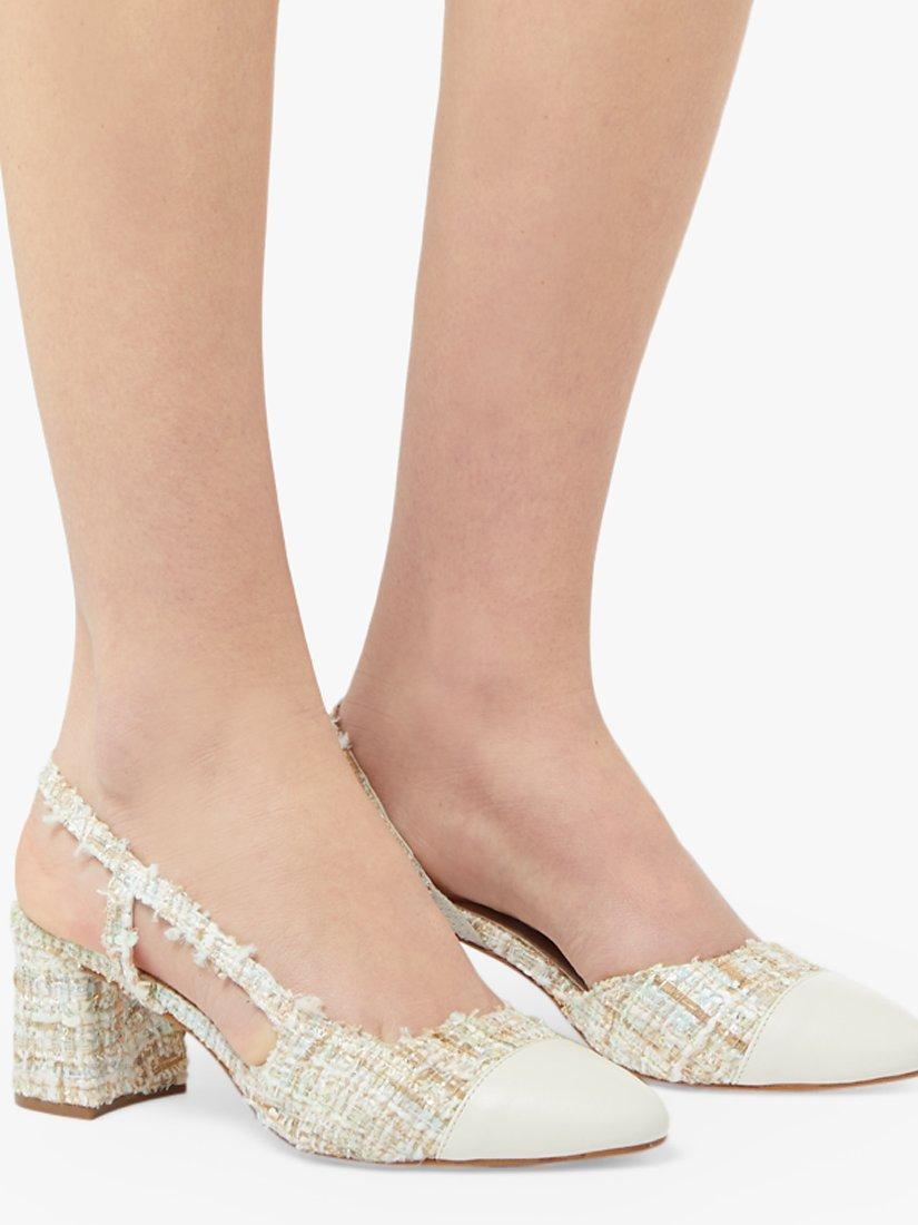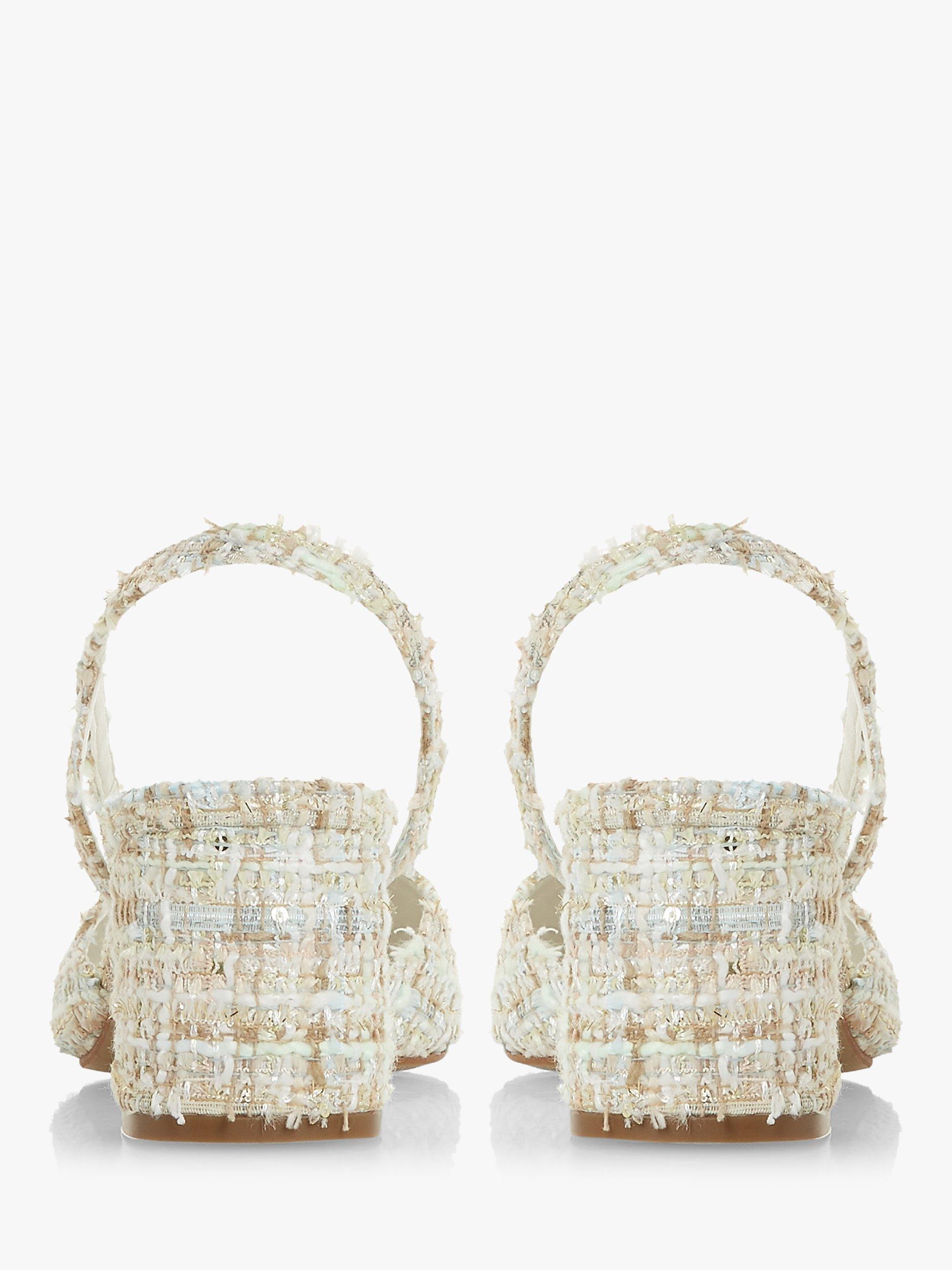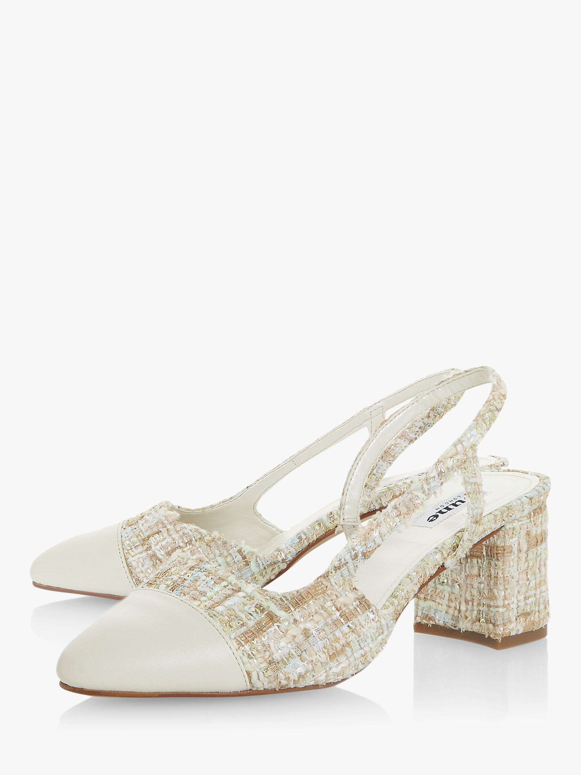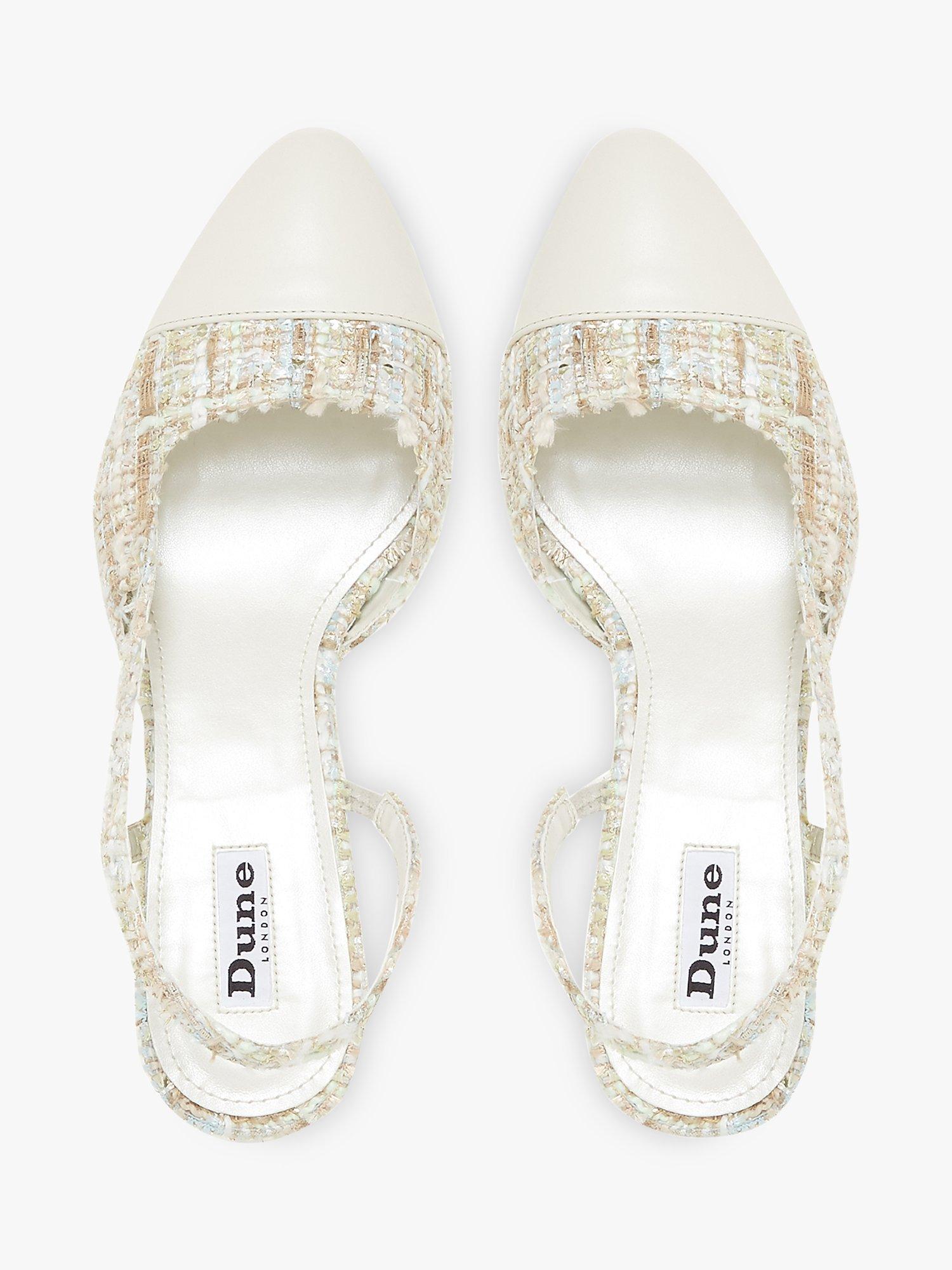 The Croft court shoes from Dune offer a sophisticated look for evening and special occasions. Set on a mid-block heel with a round pointed toe, the open design has slender slingback straps and crafted from a textured fabric upper.