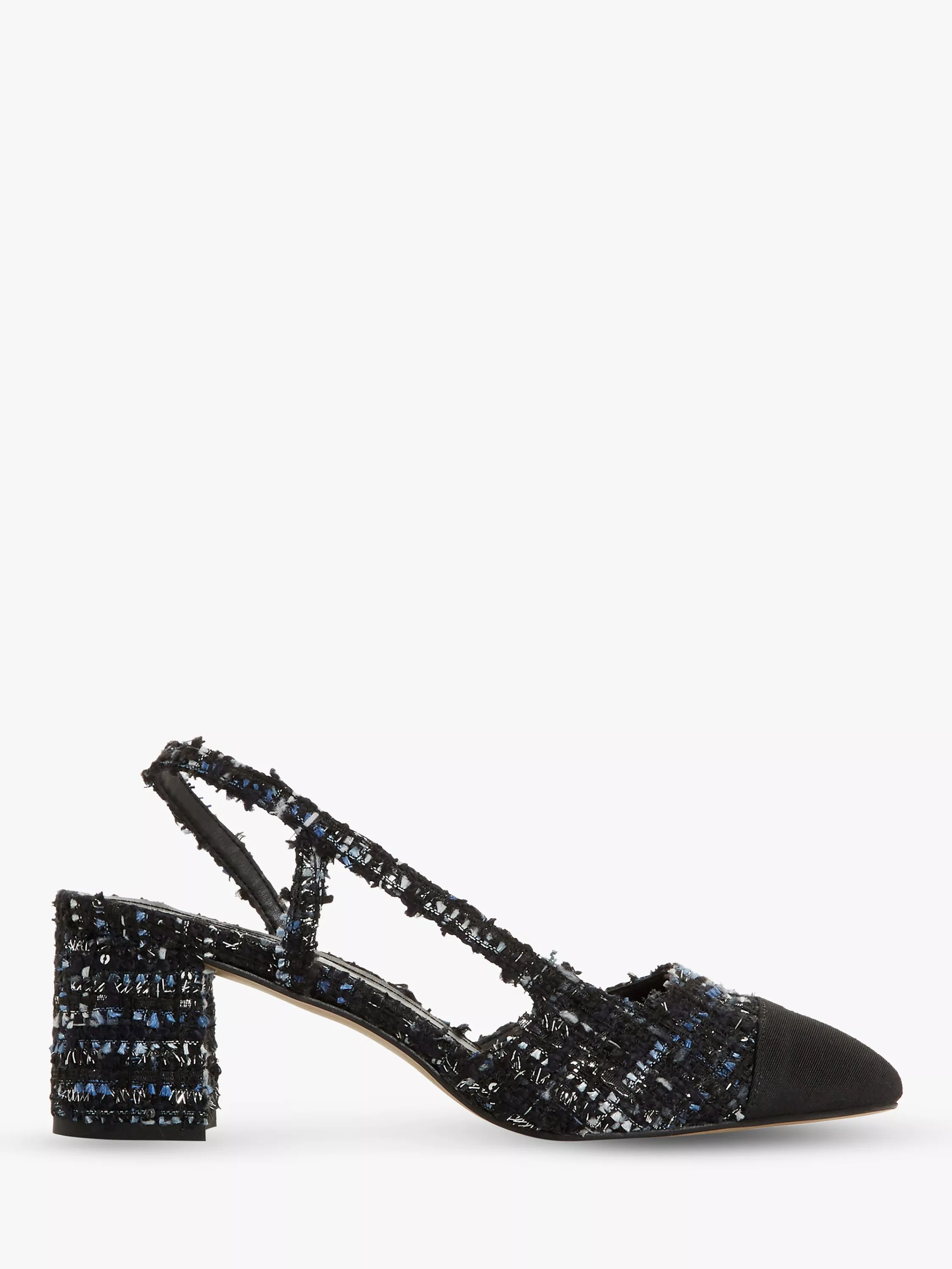 The Croft court shoes from Dune offer a sophisticated look for evening and special occasions. Set on a mid-block heel with a round pointed toe, the open design has slender slingback straps and crafted from a textured fabric upper.