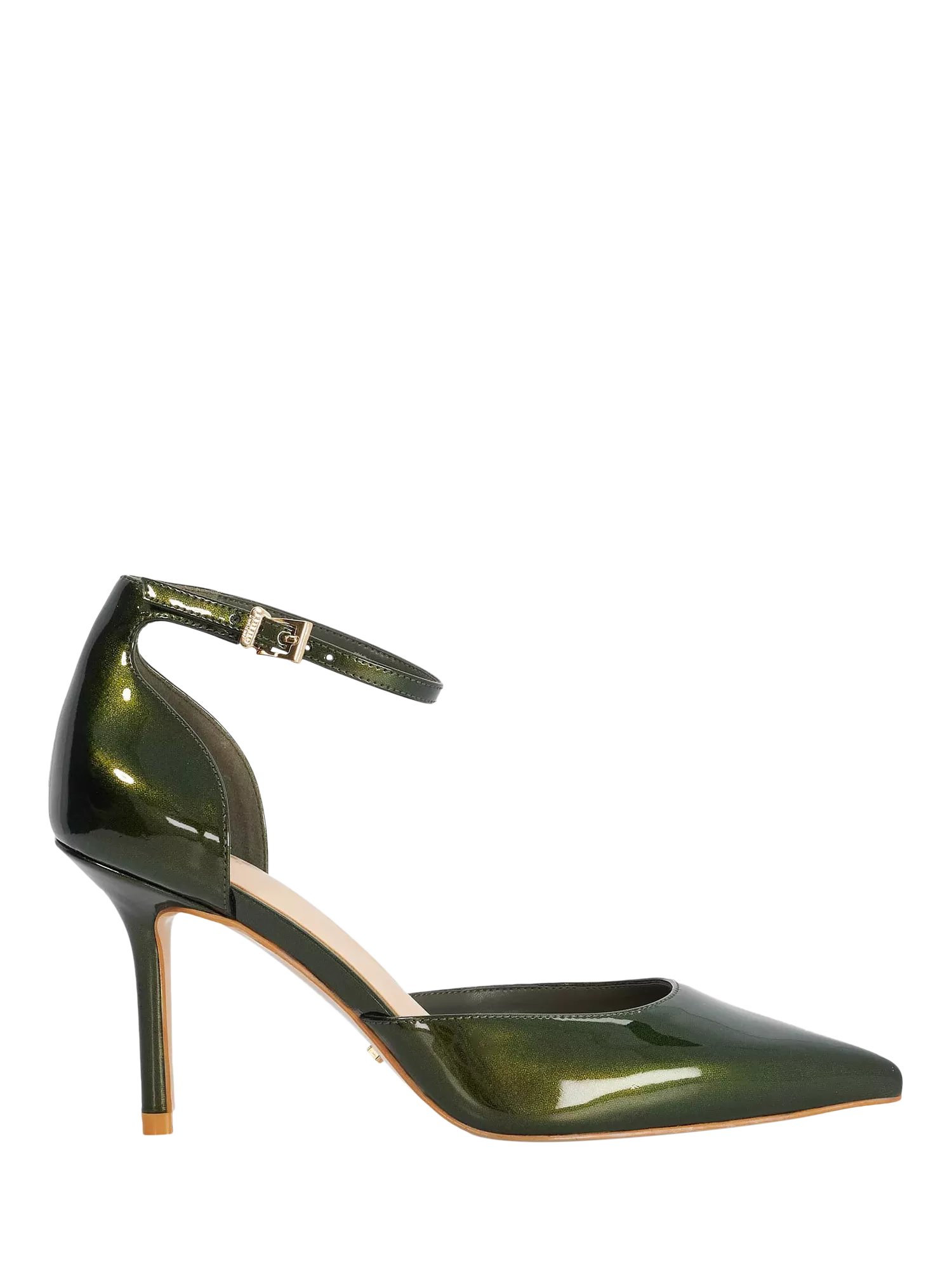 Chic court shoes with a pointed toe and high stiletto heel. The metallic patent finish and classic buckle fastening add a touch of flair while keeping you comfortable and confident.