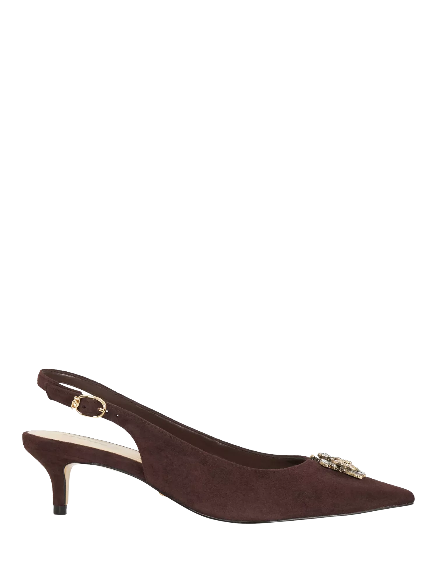 A pretty pair of suede court shoes, featuring a pointed closed toe, a secure slingback buckle, and a comfortable mid kitten heel. Featuring a signature Dune Bug charm, you'll love to wear them on every special occasion.