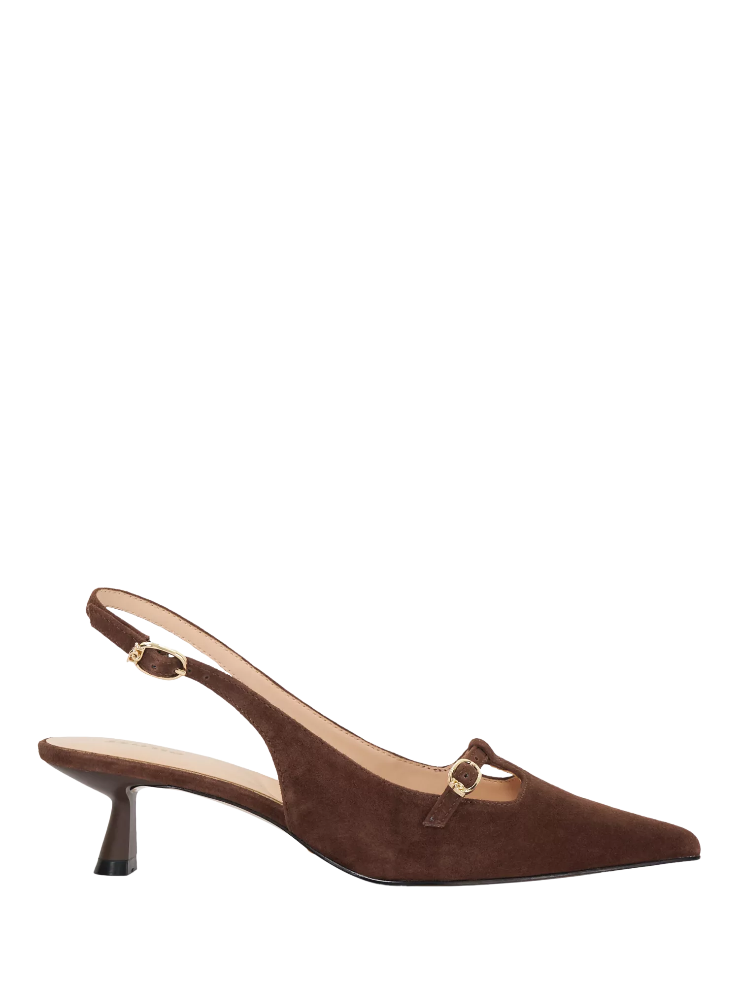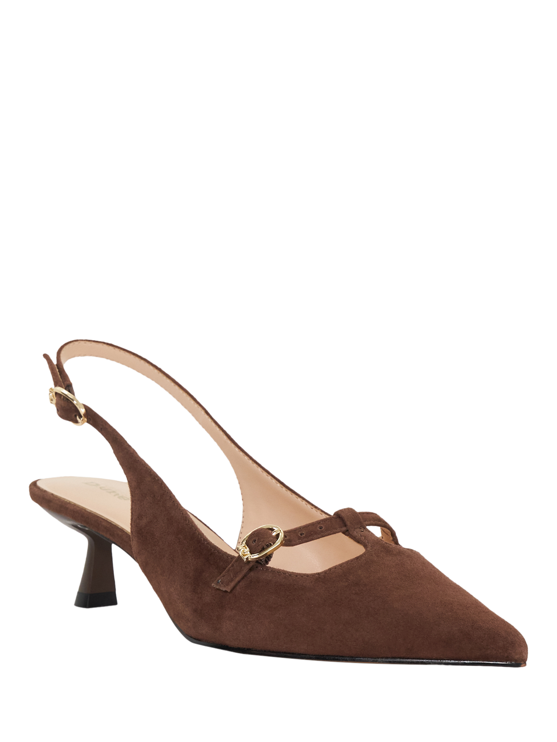 In a traditional court silhouette, this pair of slingbacks by Dune is fashioned from suede for long-lasting quality and comfort. Set on a kitten heel, they are neatly pointed at the toe for a timeless finish.