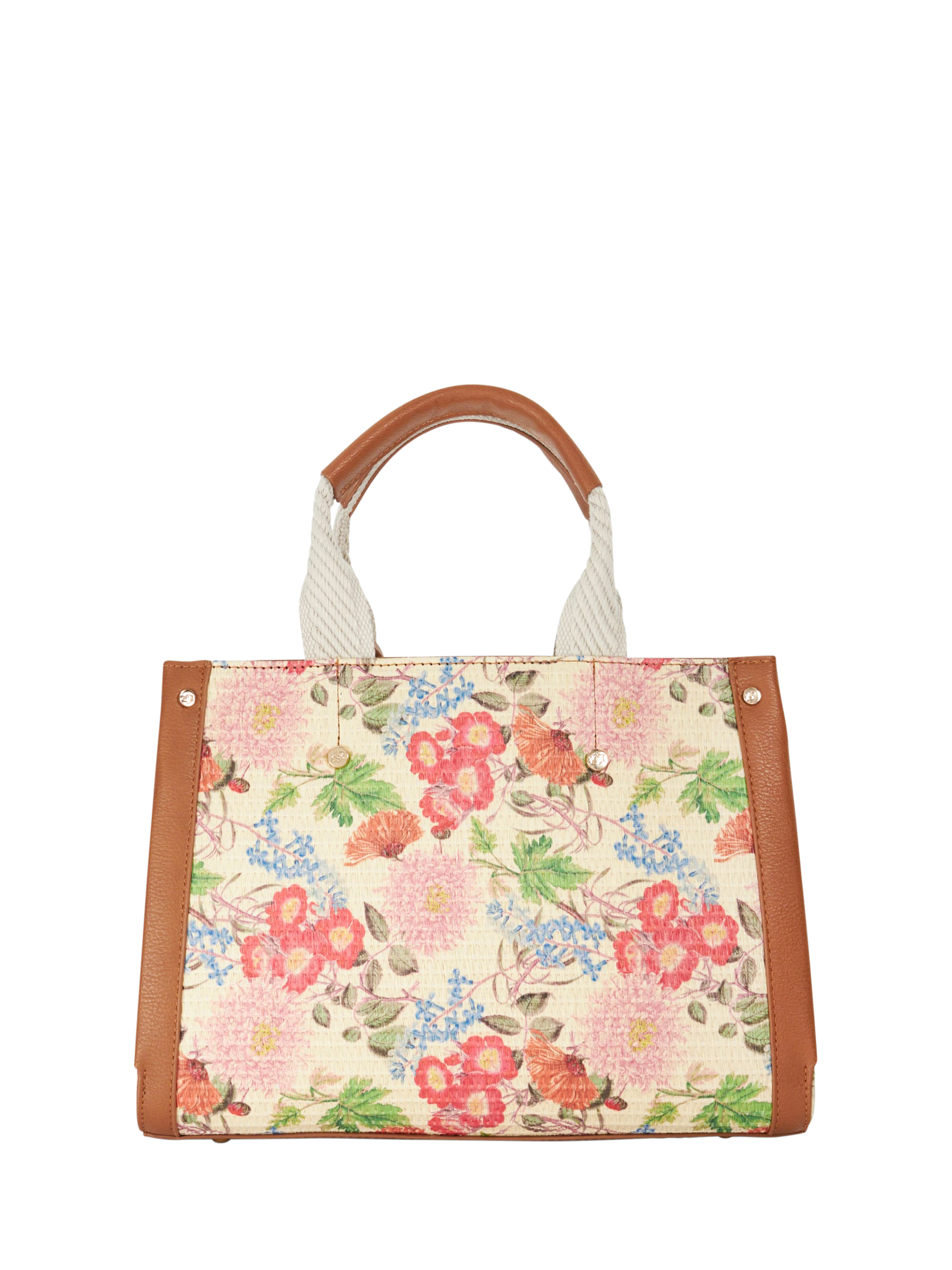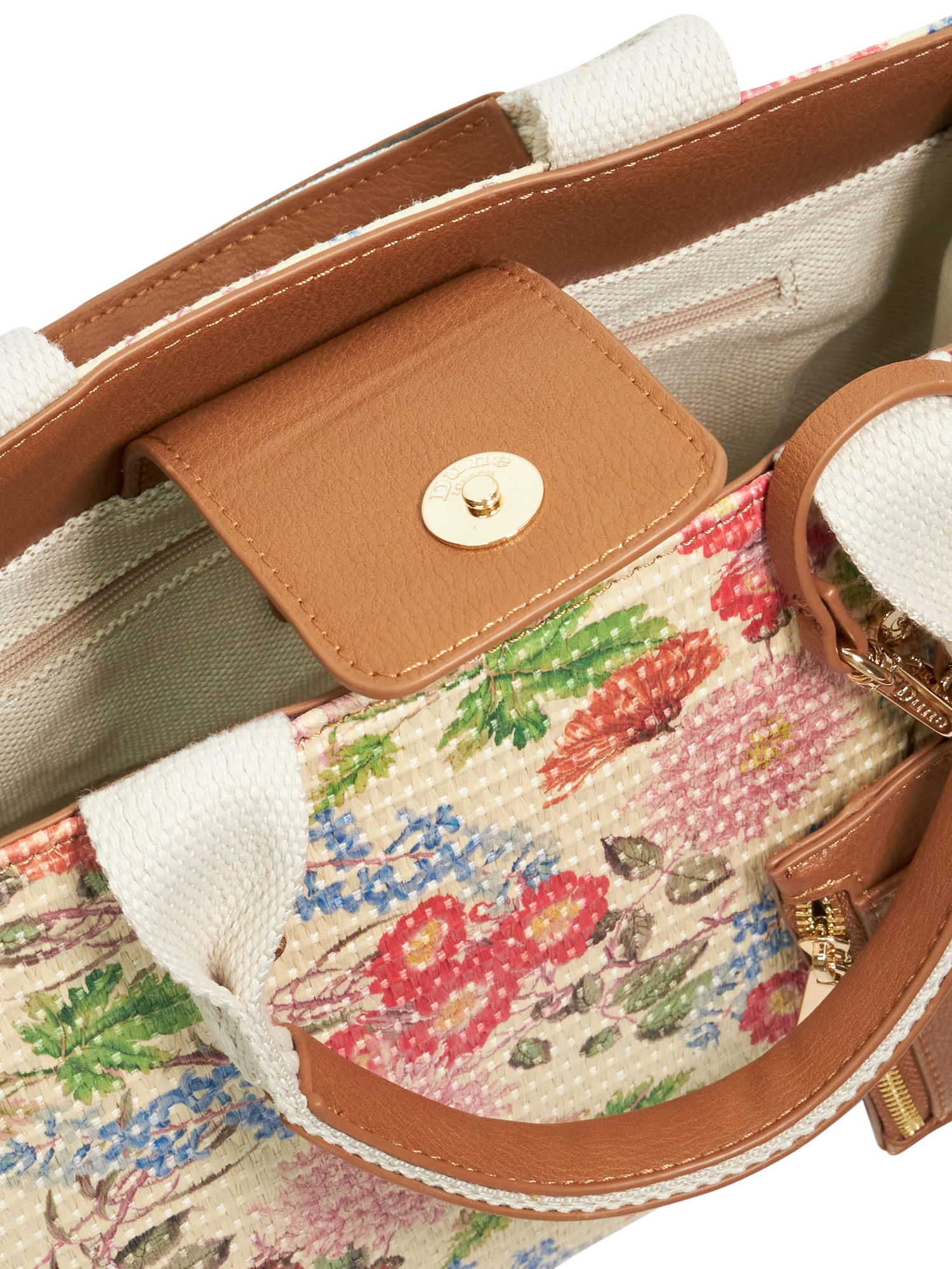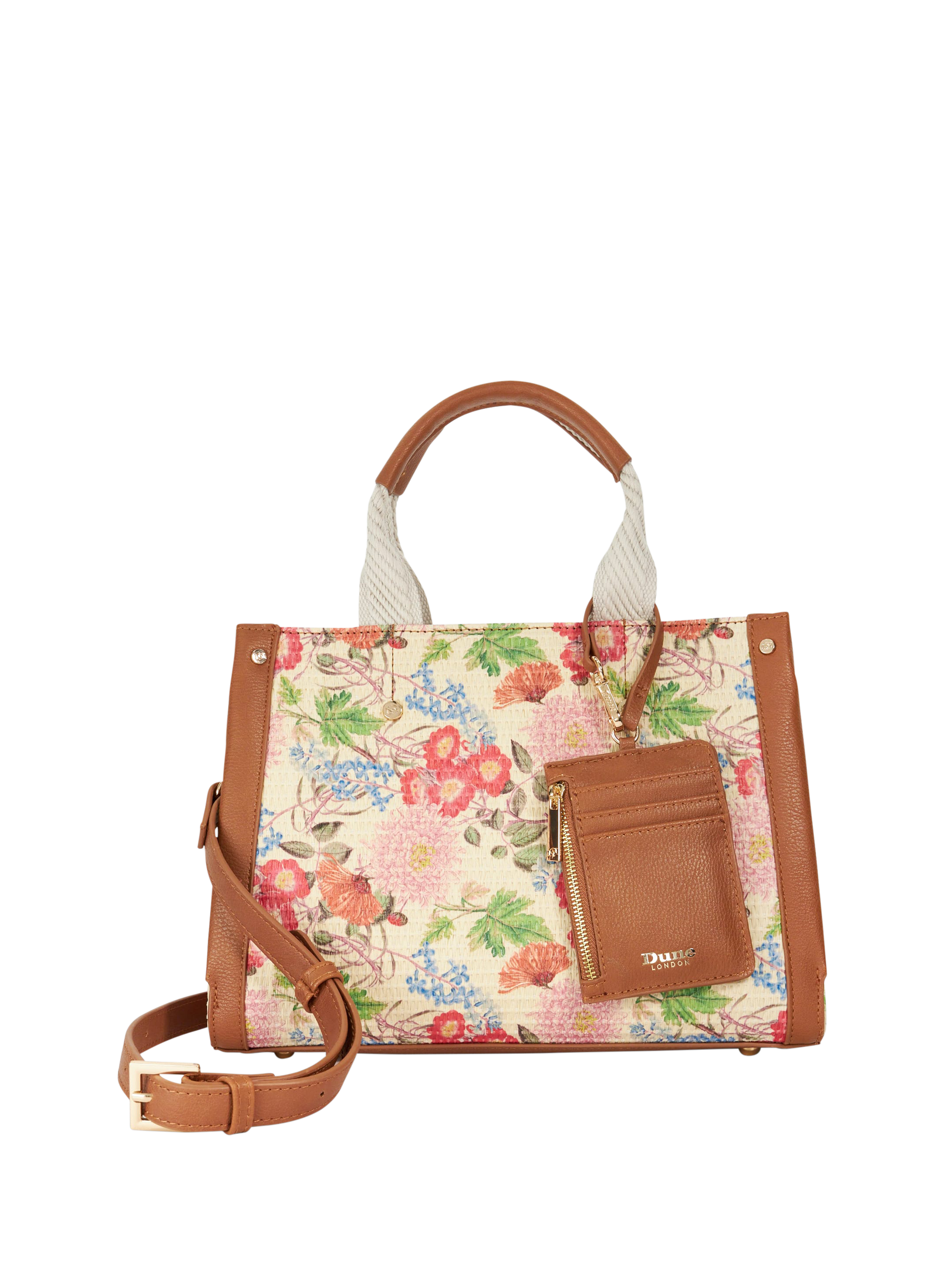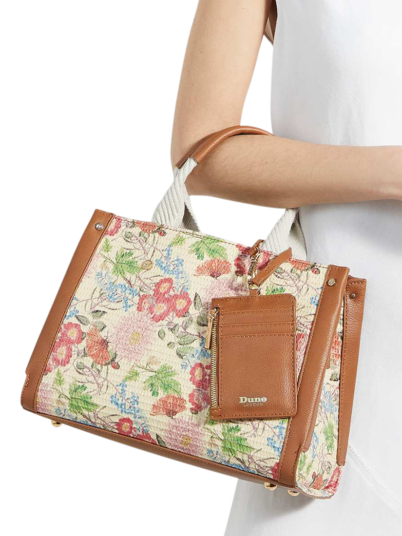 Style up your accessories edit with Dune's Dinkydialect and make a lasting impression. Adorned with a bold floral print, this stunning tote comes with a convenient card holder charm for easy access. Designed with double grab handles, canvas detailing, gold-tone fittings and studs, it offers both style and substance.