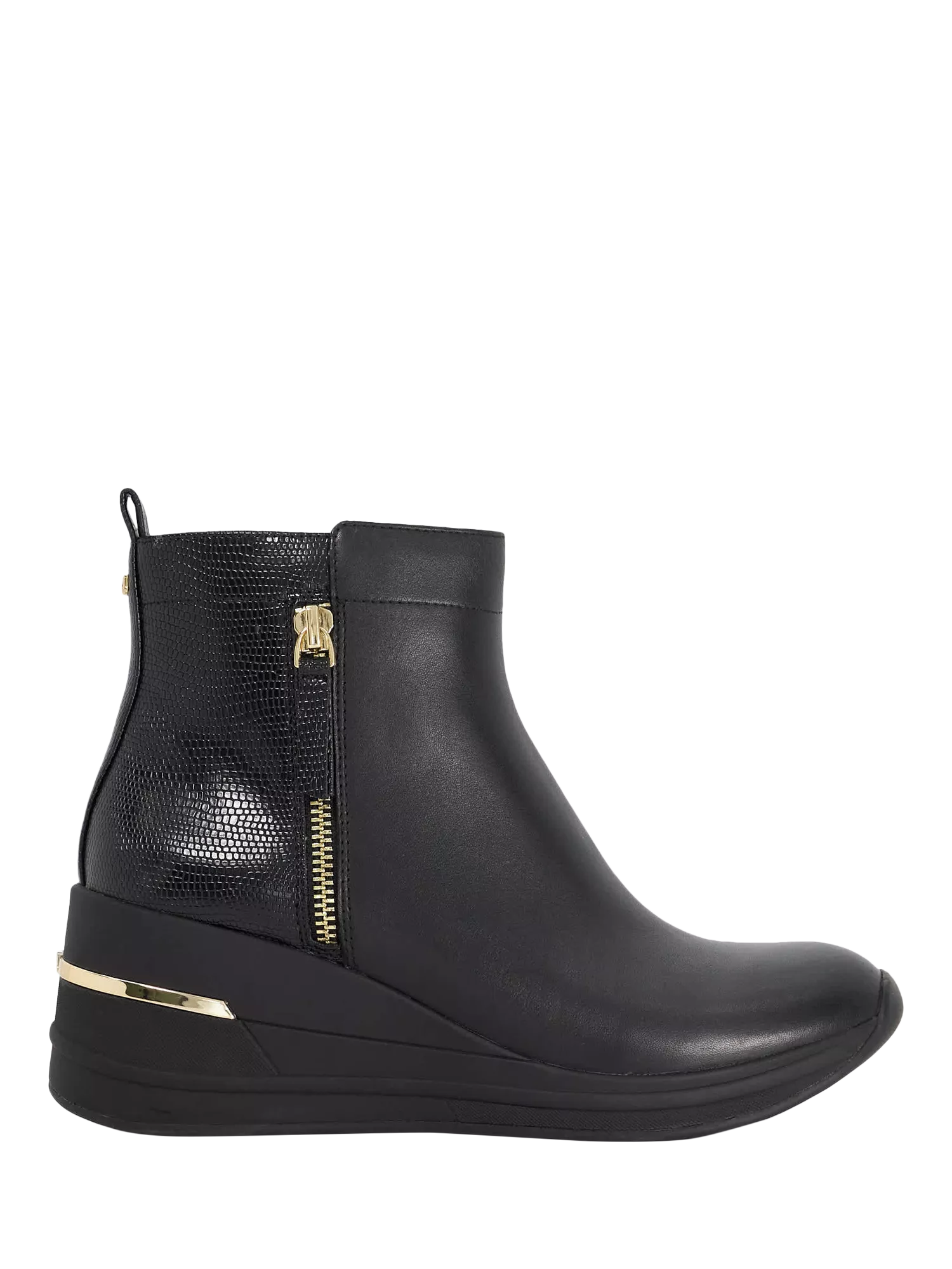 Step out in style and comfort with Everyone, leather wedge ankle boots designed with everyday wear in mind. Featuring a sleek silhouette with a gold insert for a touch of luxe, they’re detailed with a side zip and rear pull tab for easy wear.