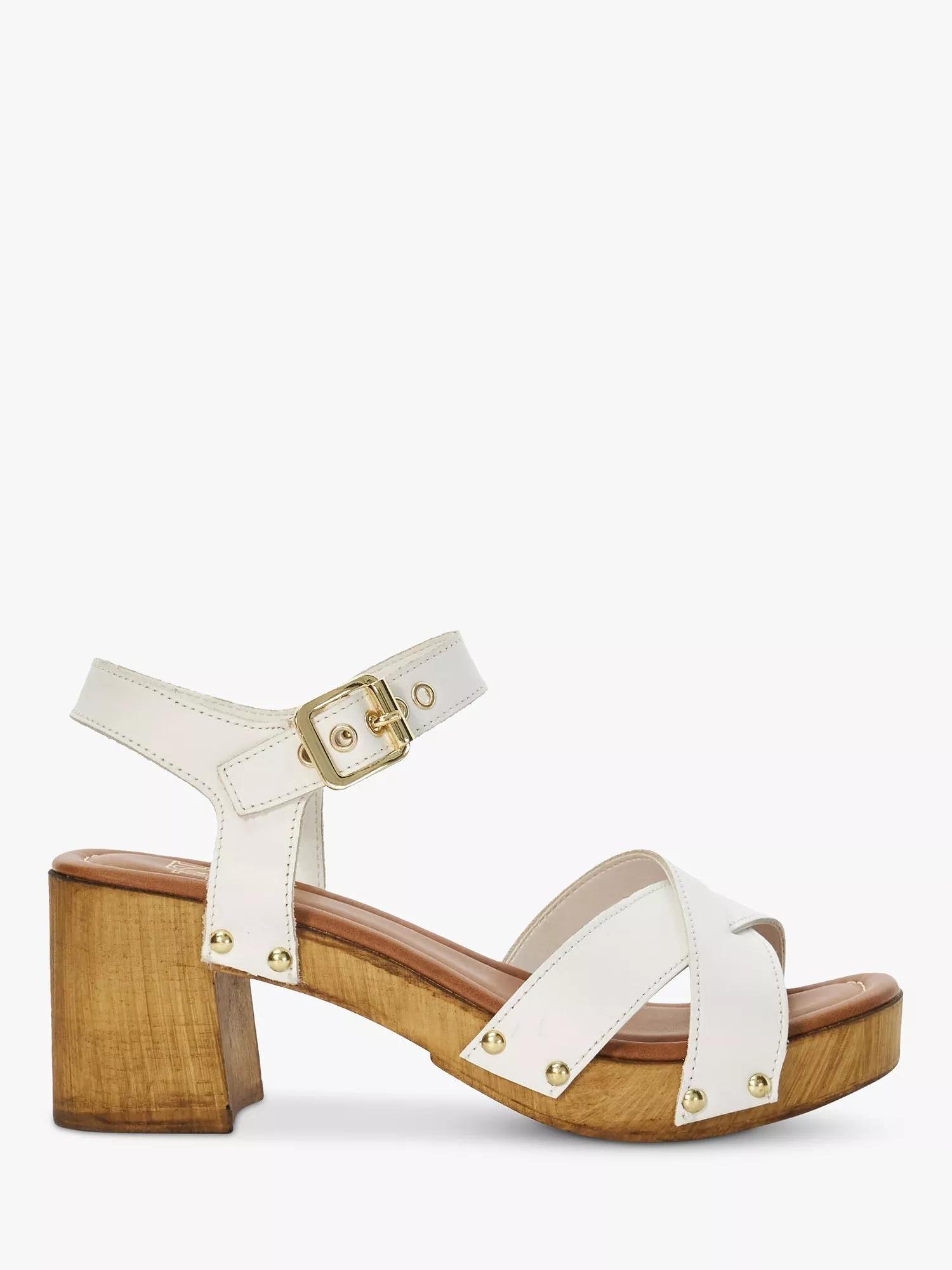 Set on a block platform heel with a ankle buckle strap, they are finished with a rounded open toe.