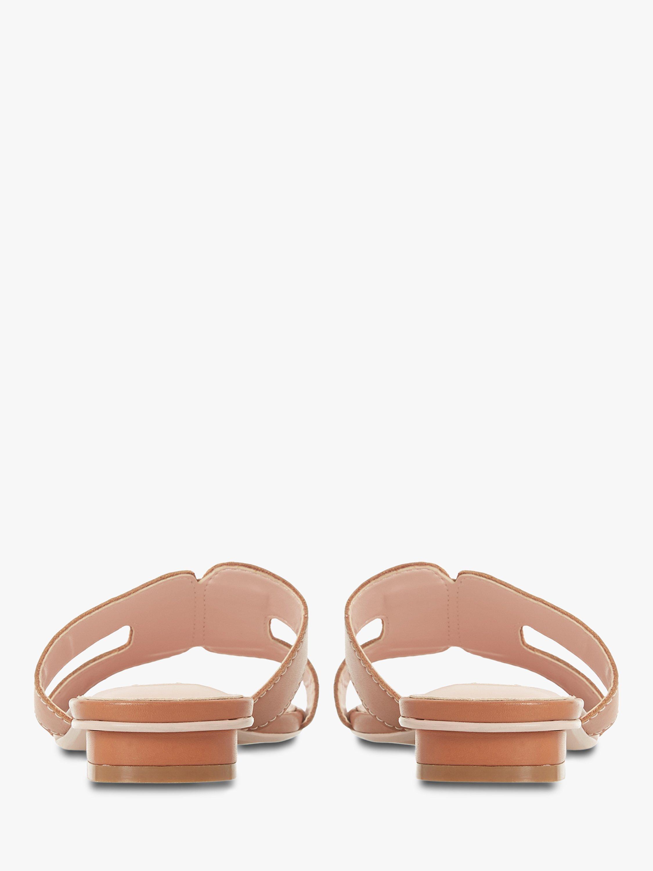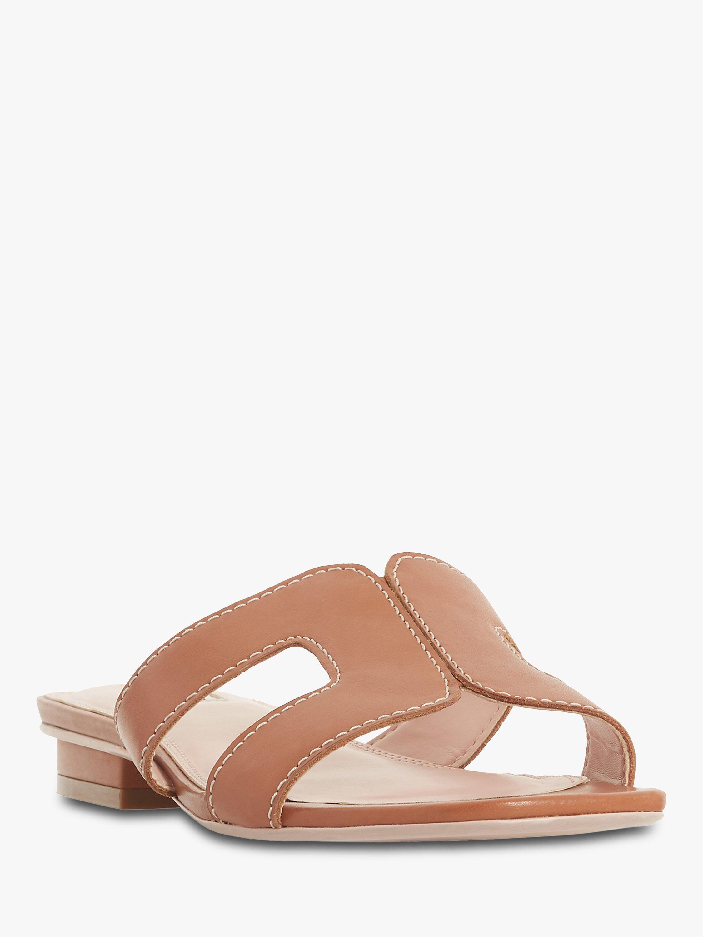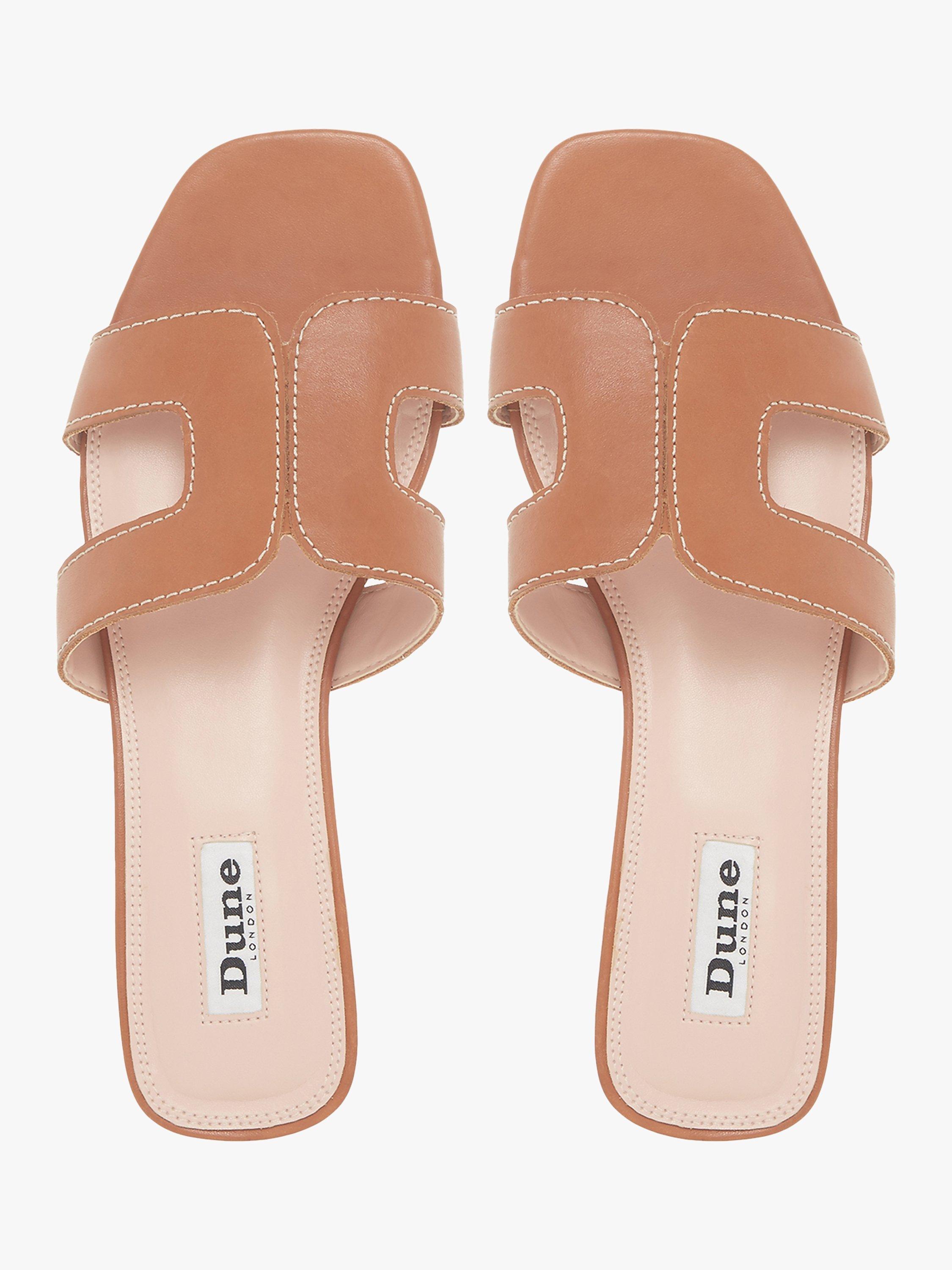 Stay smart and stylish this summer with Dune's Loupe slider sandal. Featuring a cut out design with contrast stitching and a low block heel. An open sandal toe and resin sole complete the striking shoe.