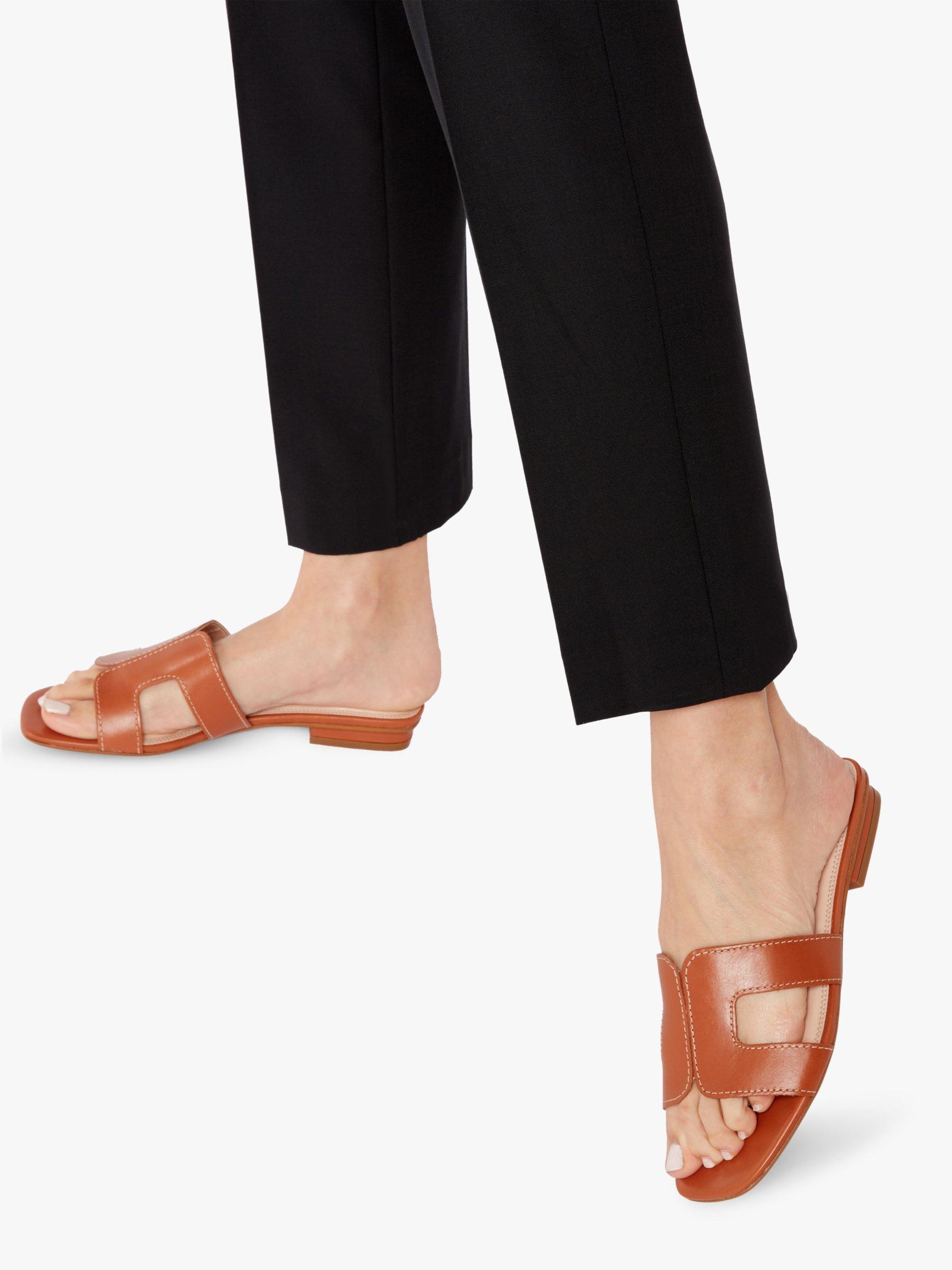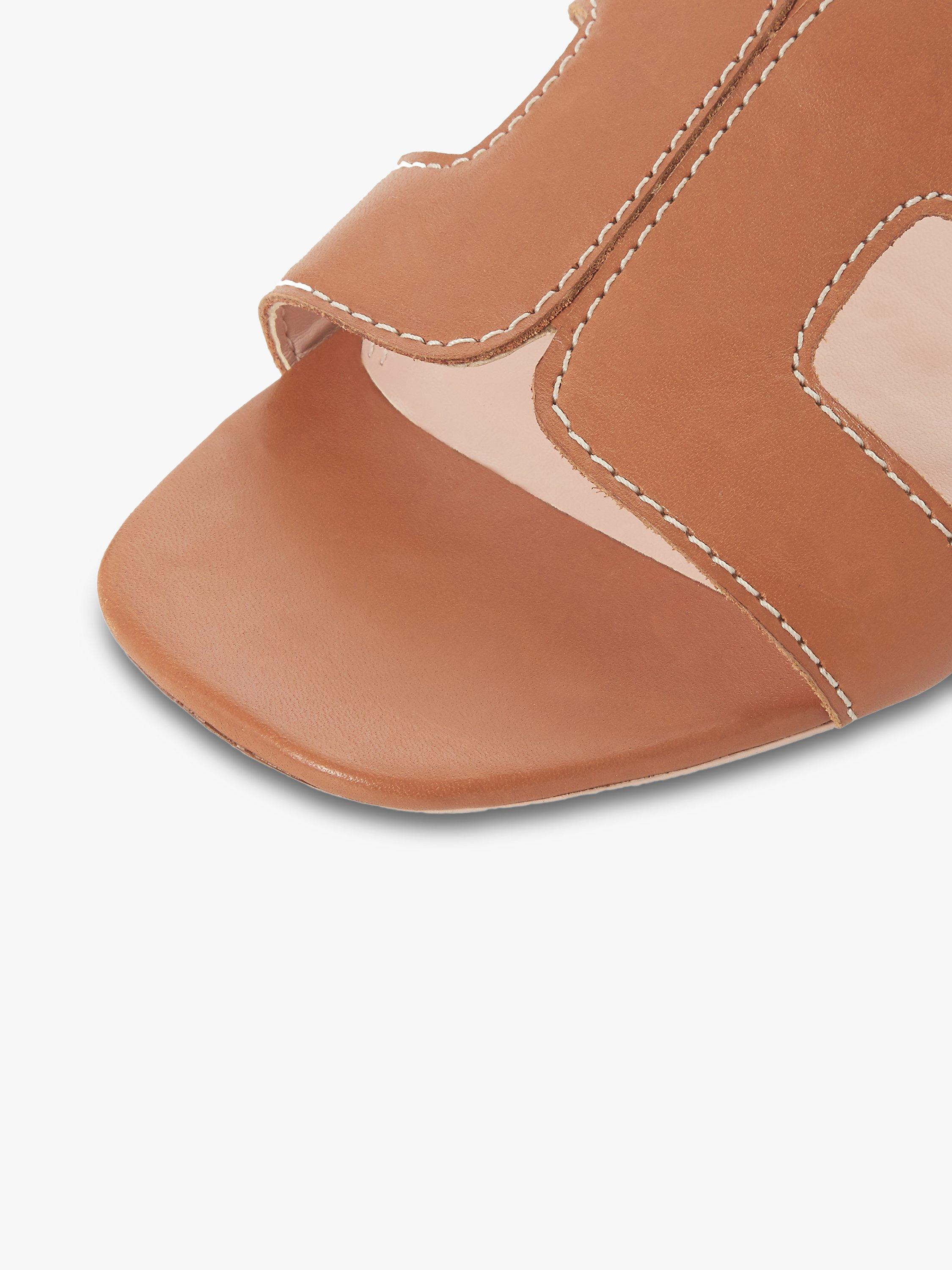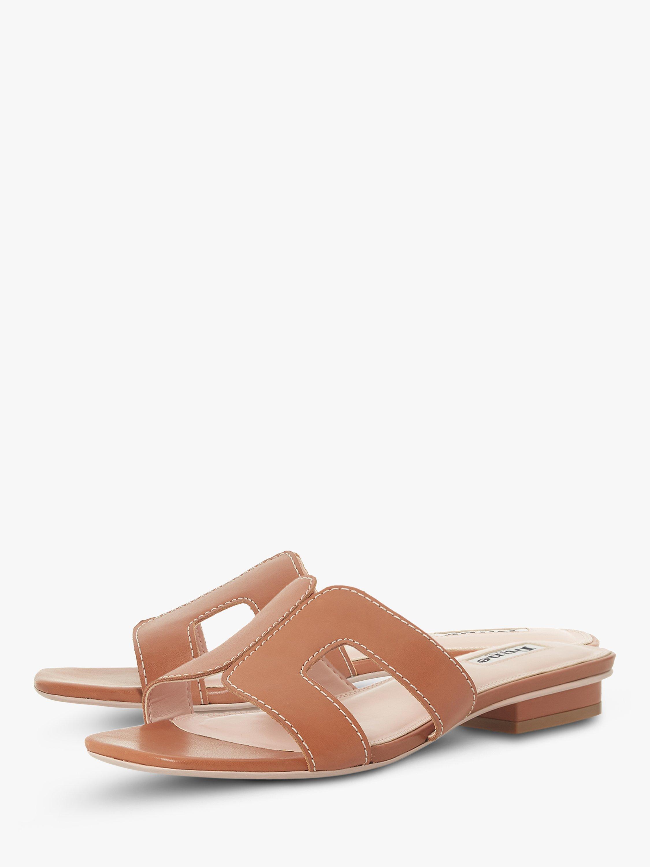 Stay smart and stylish this summer with Dune's Loupe slider sandal. Featuring a cut out design with contrast stitching and a low block heel. An open sandal toe and resin sole complete the striking shoe.