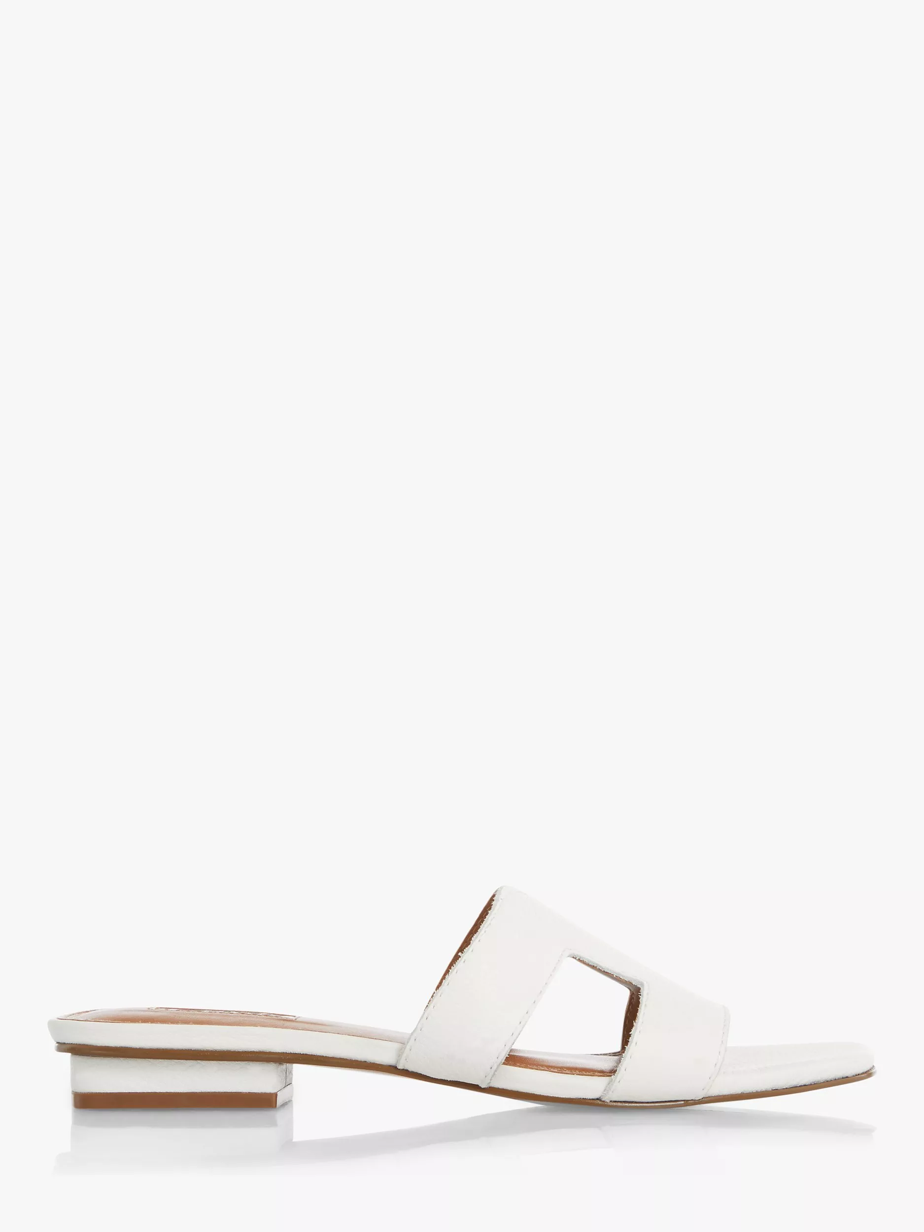 Stay smart and stylish this summer with Dune's Loupe slider sandal. Featuring a cut out design with contrast stitching and a low block heel. An open sandal toe and resin sole complete the striking shoe.