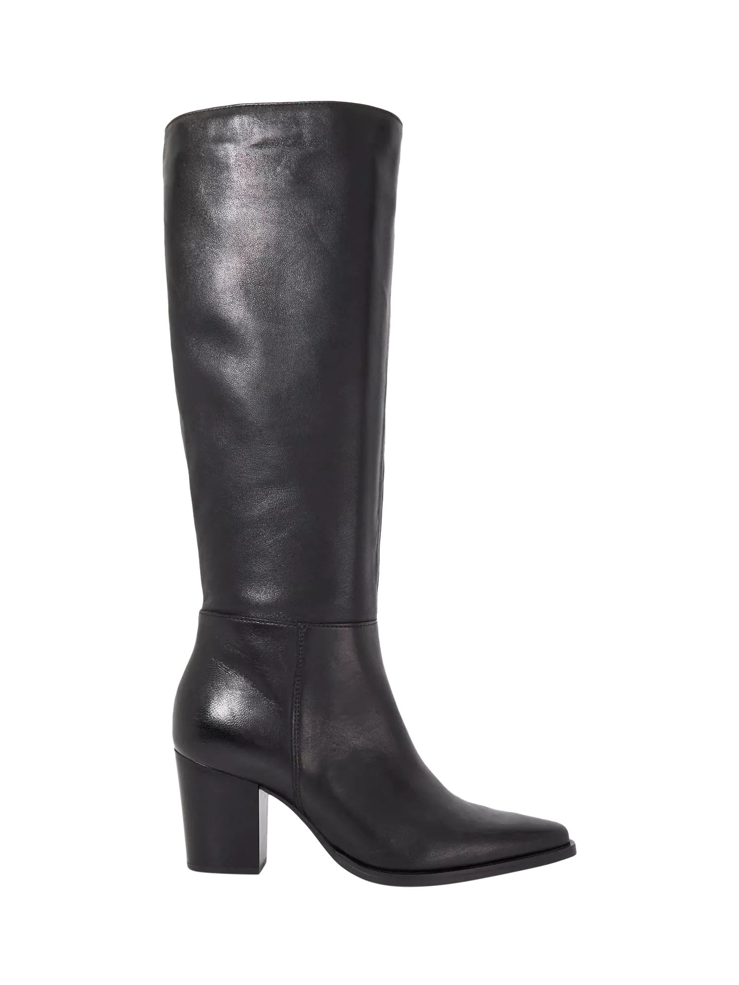 Leather knee-high boots featuring a 7.5cm block heel, pointed toe, and easy zip fastening. Smartly designed for comfort, they add confidence to every stride while keeping practicality at the forefront.