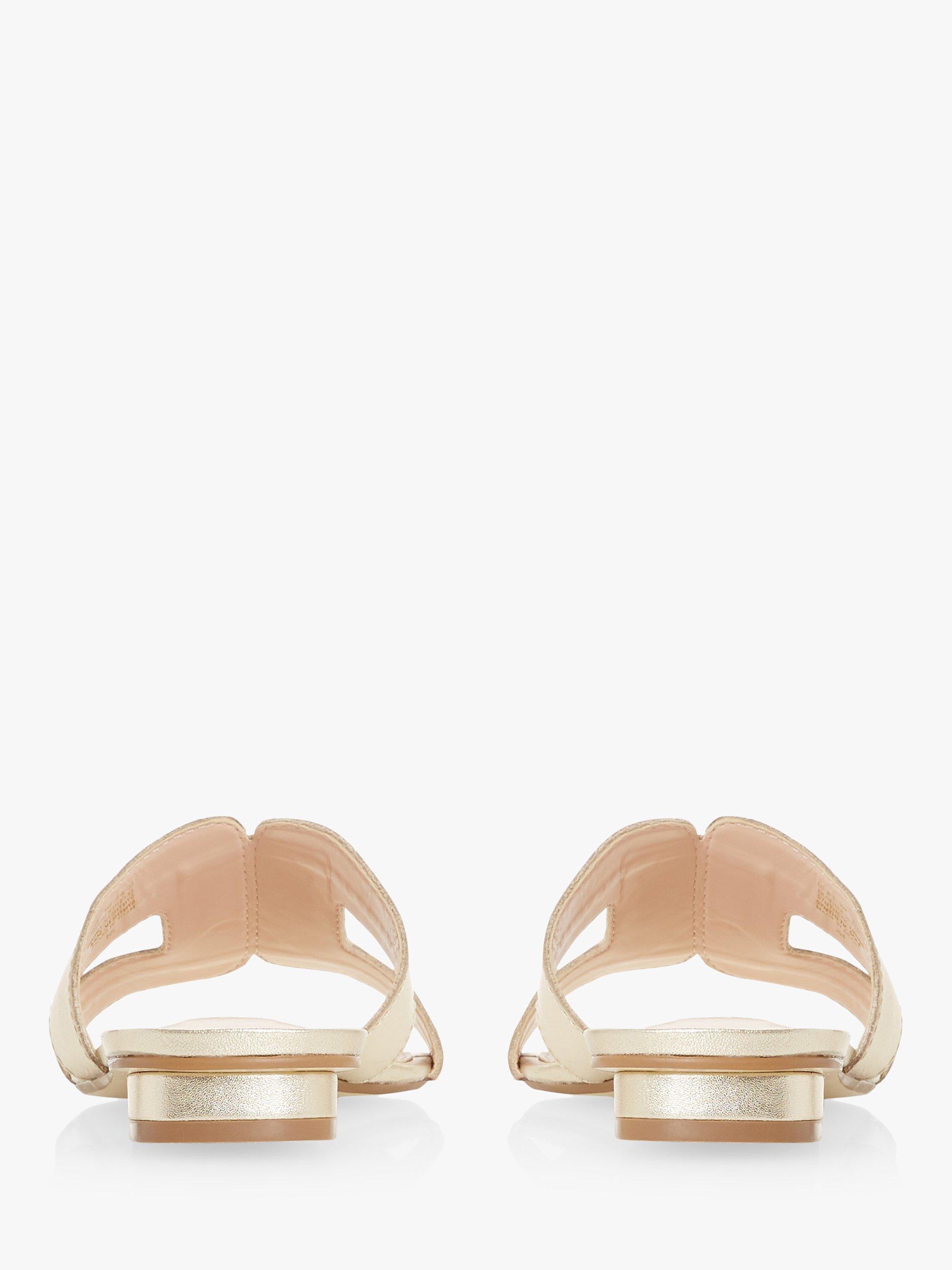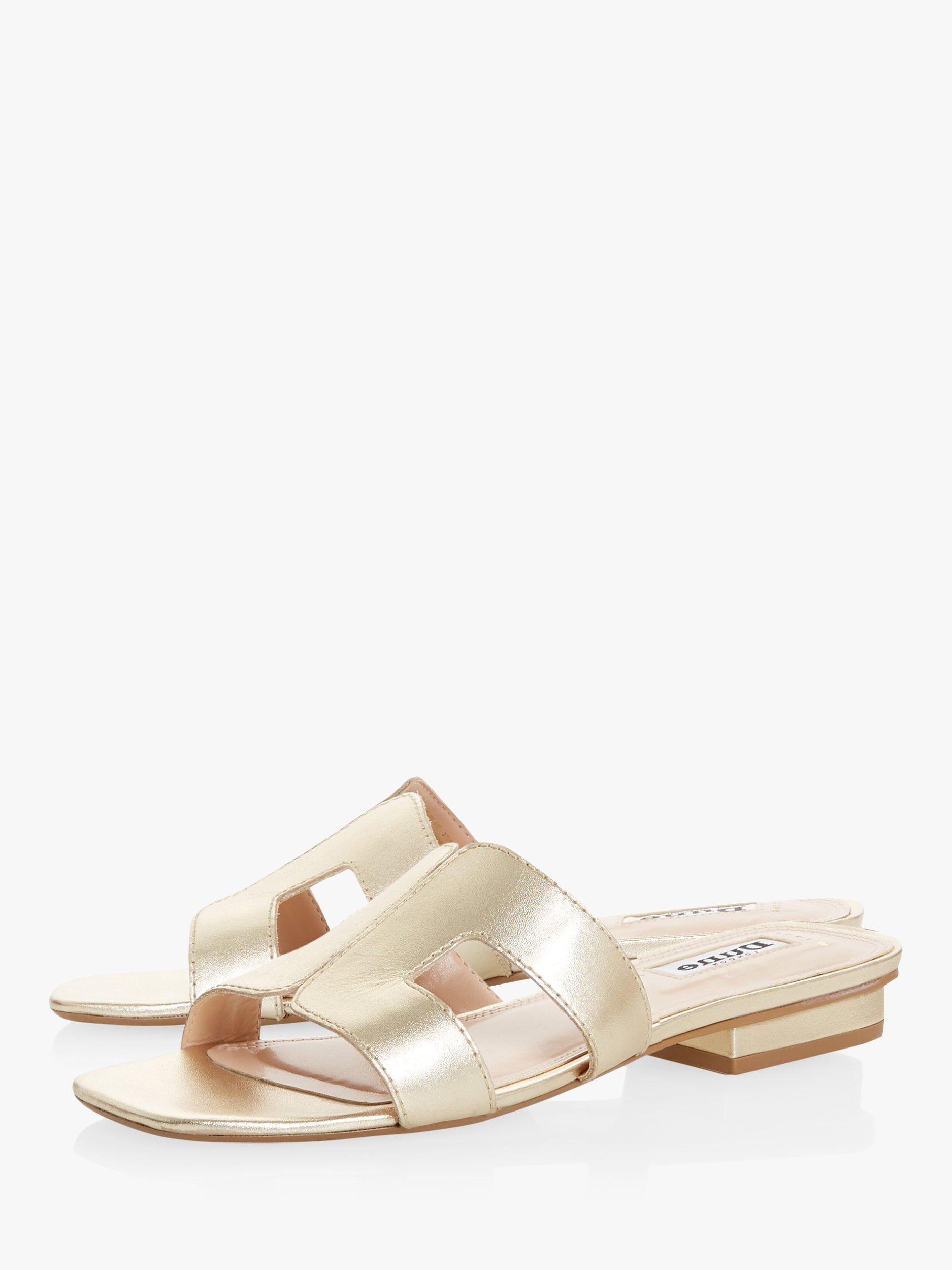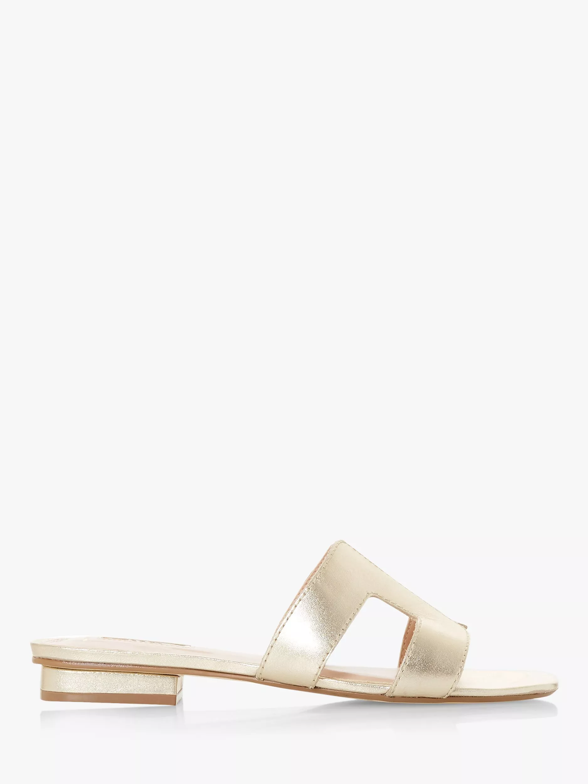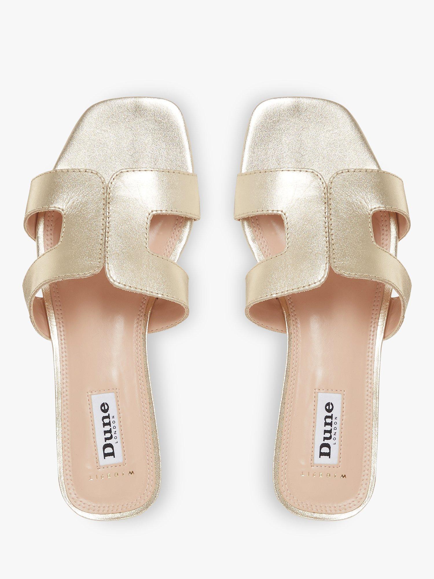 Stay smart and stylish this summer with Dune's Loupe slider sandal. Featuring a cut out design with contrast stitching and a low block heel. An open sandal toe and resin sole complete the striking shoe.